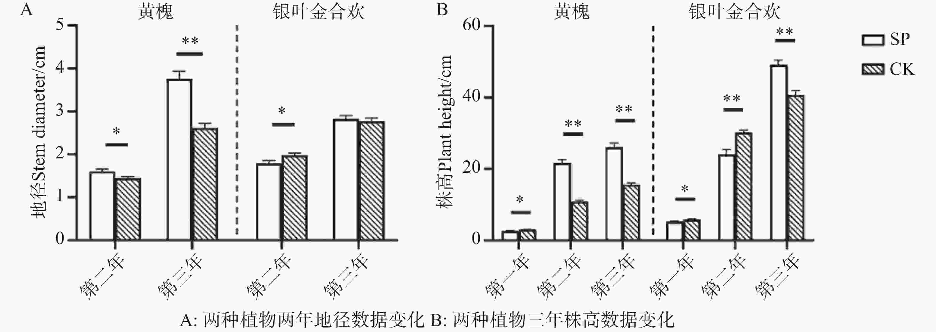 黄槐与银叶金合欢的两年地径数据表现出的趋势差异较大,黄槐处理组地径两年均较对照组显著增加,分别增加11.05%和43.80%;变异系数则从第二年的增加8.64%转变为第三年的降低4.99%。银叶金合欢处理组地径在第二年显著低于对照组,降低了9.71%,变异系数也降低了5.68%,第三年处理组较对照略有增加,变异系数则上升18.71%,但两组数据差距不显著。