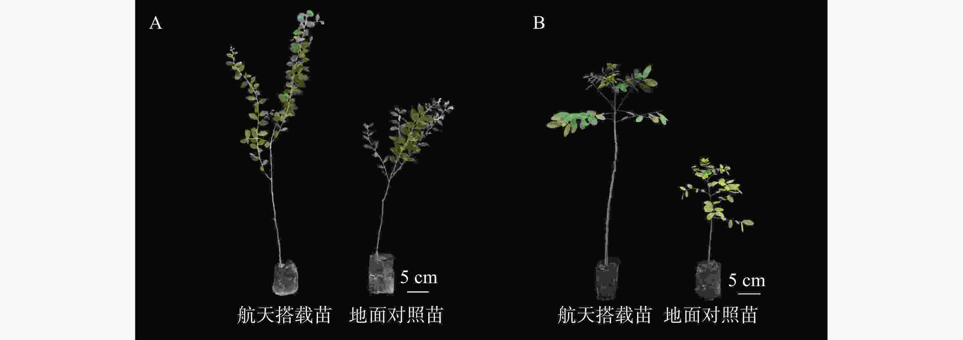 研究表明,航天诱变对种子活力的影响具有双向性[17]。航天诱变对文冠果(Xanthoceras sorbifolium)、刺槐(Robinia pseudoacacia)和五角枫种子发芽率与存活率等早期生长指标起促进作用[18],对刺梨(Rosa roxburghii)种子航天诱变处理后的成苗率也稍高于地面对照[19],但在湿地松(Pinus elliottii)种子经航天诱变后发芽率、出苗率却低于地面对照。本研究发现航天诱变后黄槐种子成苗率较地面对照大幅下降,而银叶金合欢成苗率则提高,这与已有研究相符,推测成苗率受抑制可能是在微重力条件下储存过久导致种子老化[20],或是受到太空中辐射等环境胁迫,成苗率上升则可能是太空环境一定程度上削弱种皮的机械屏障导致。