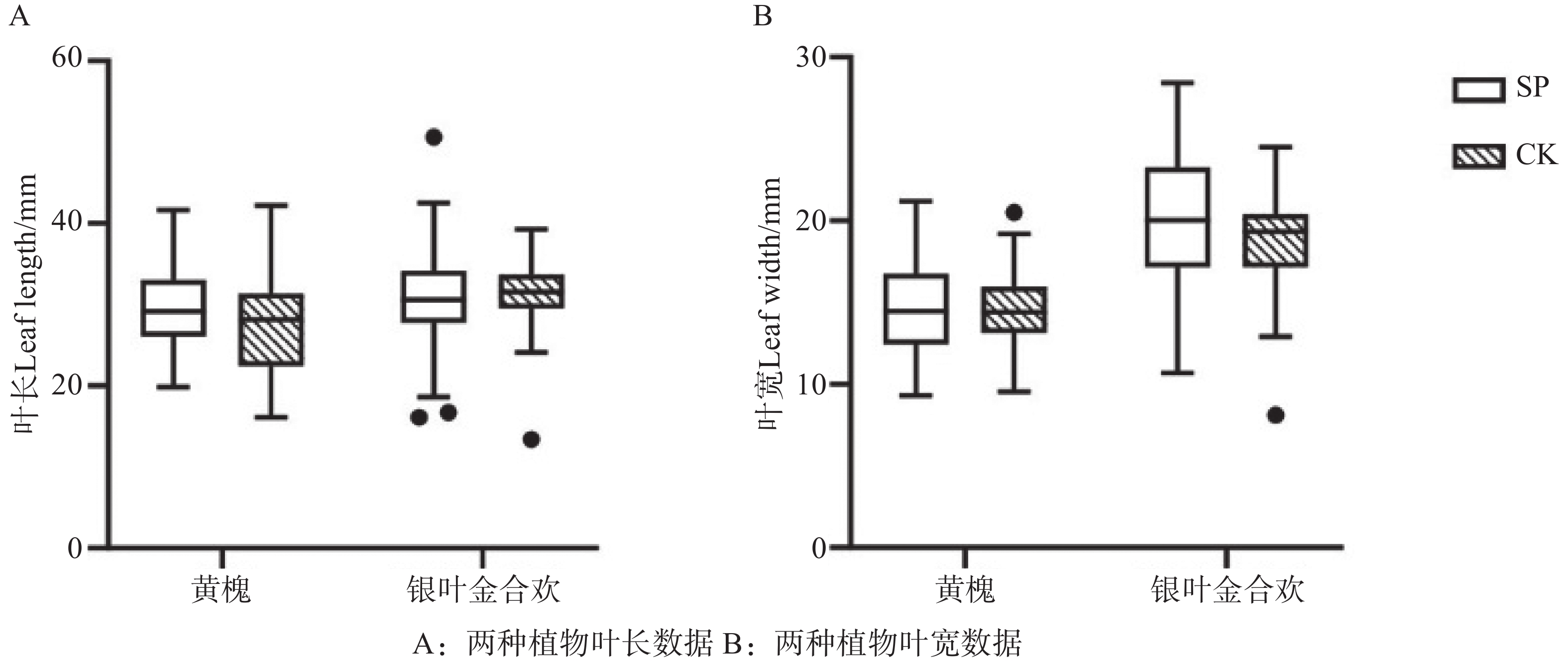 黄槐与银叶金合欢处理组的叶宽对比对照组均有所增加,分别增加1.64%和6.79%。黄槐与银叶金合欢叶宽变异系数也统一呈增大趋势,分别增加了1.43%与4.75%。