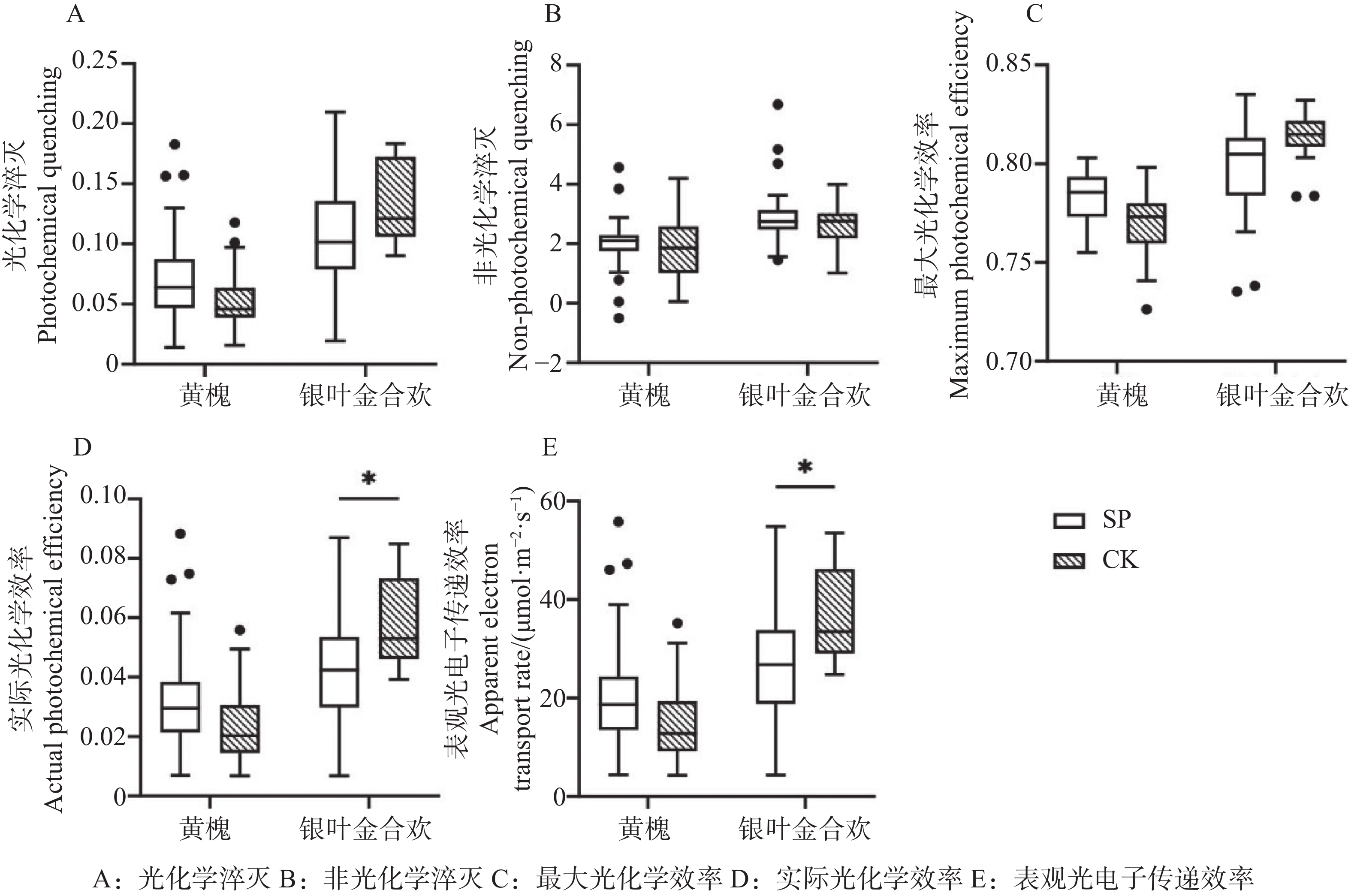 综上所述,航天诱变对黄槐与银叶金合欢的生长特性起促进作用,同时提升了黄槐的光合效率和水分利用能力,在一定程度上抑制银叶金合欢的光化学效率。