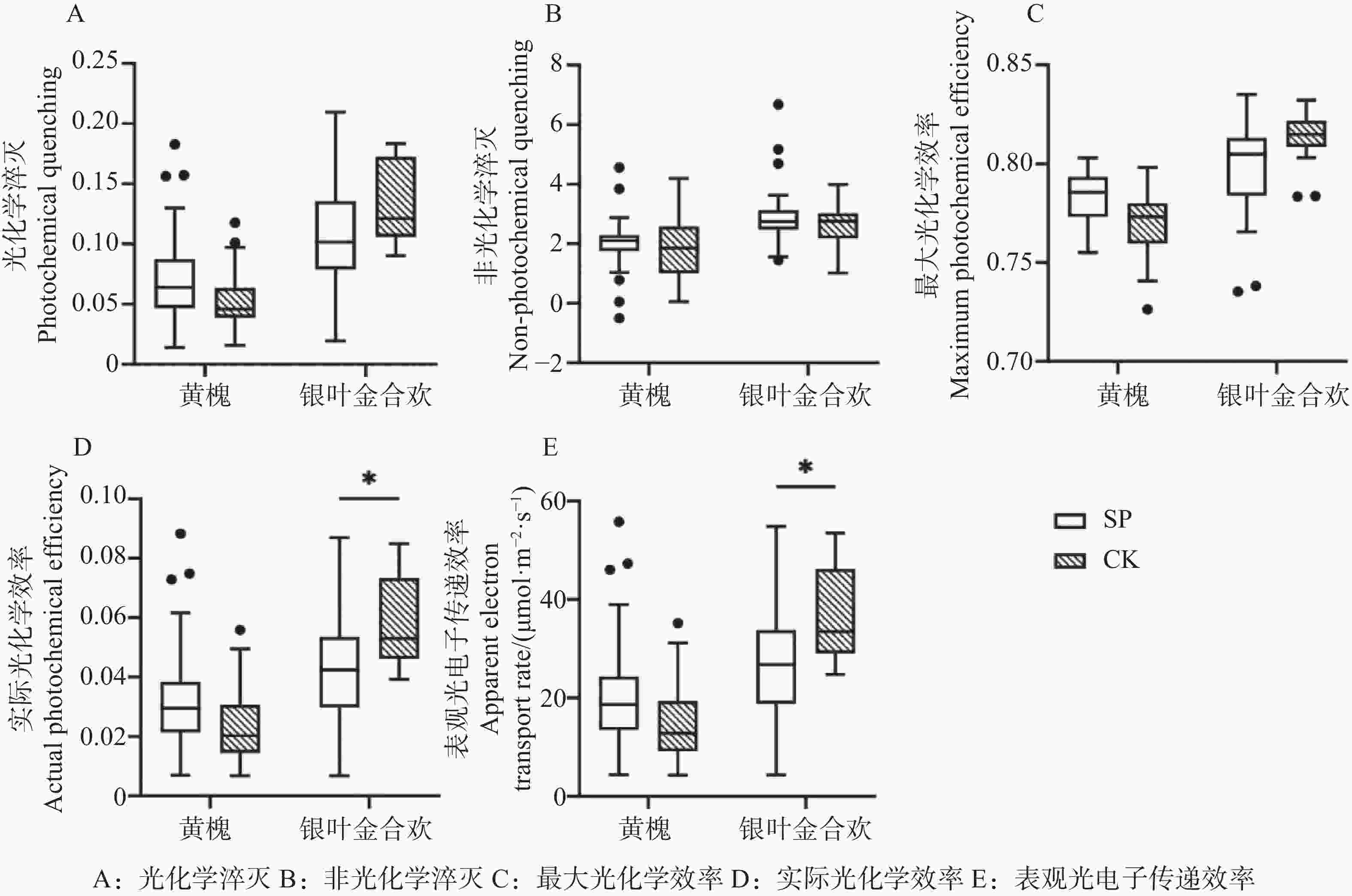 6800 便携式光合测定仪测定2个树种叶片的最大光化学效率(Fv/Fm)、表观光电子传递效率(ETR)、非光化学淬灭(NPQ)、光化学淬灭(qP)和实际光化学效率(Y(II))。光合参数测定的环境与叶室参数设定相同,暗反应测定前一晚用锡箔纸包裹叶片,以实现充分的暗适应;光反应测定前进行至少30 min的光适应。测定时从每株中上部选择3个不同部位的叶片,每片重复测3次。 -