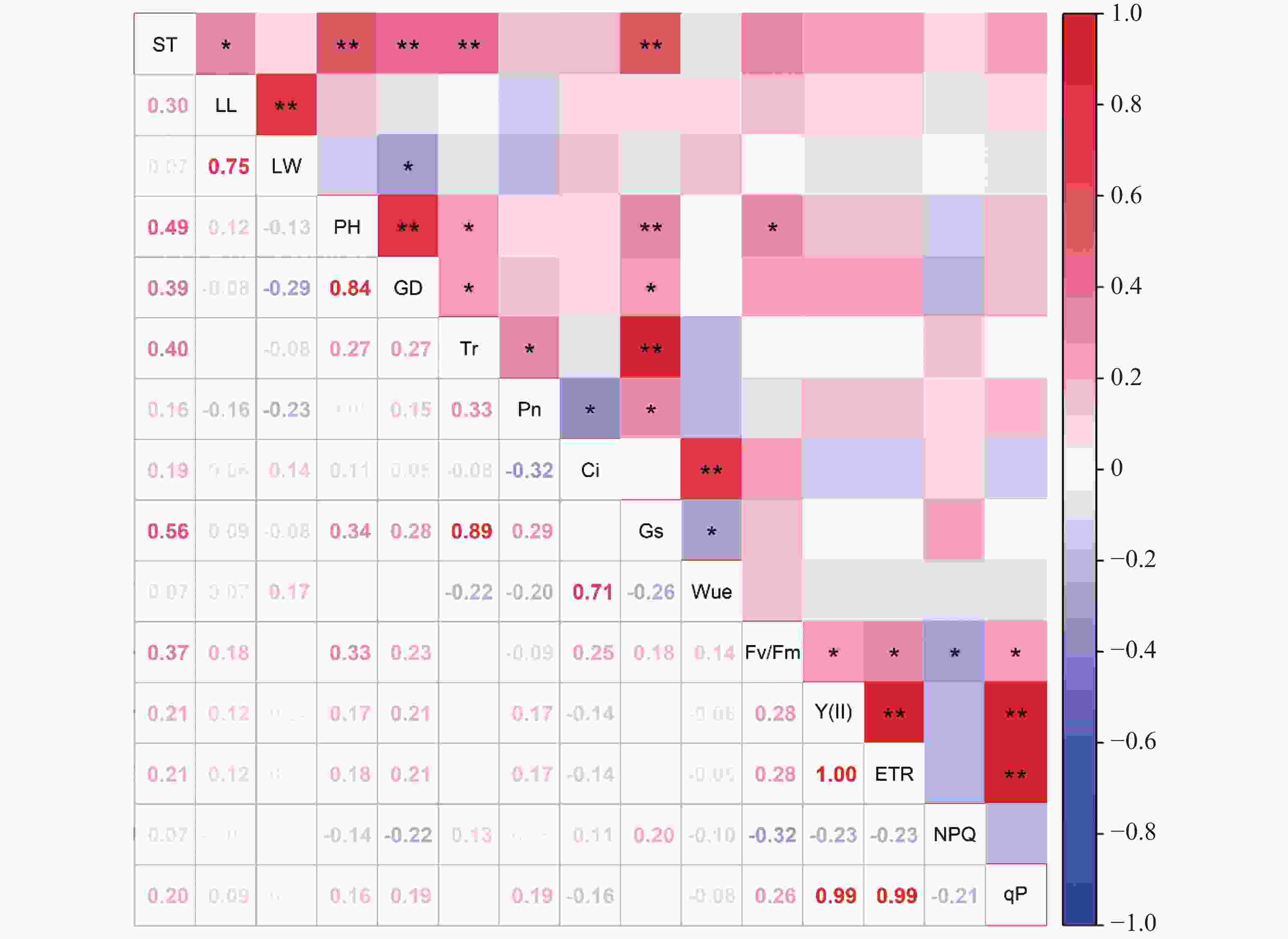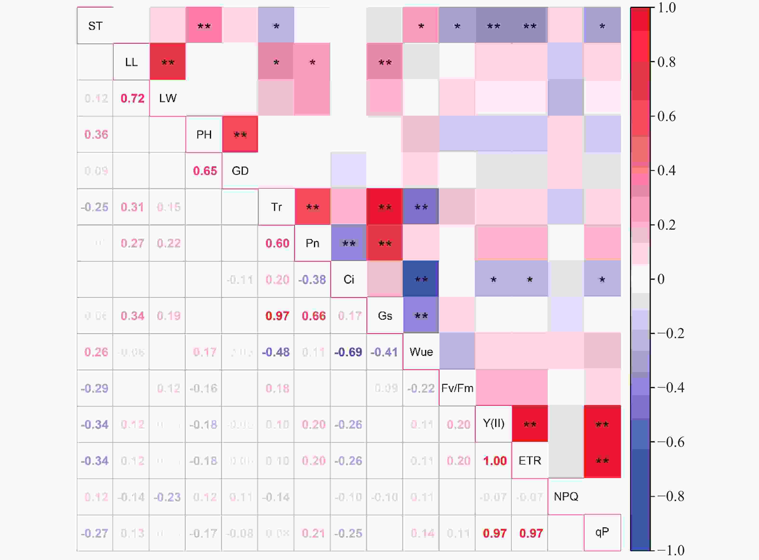 在银叶金合欢中,航天诱变处理与WUE均呈显著正相关,与Tr、Fv/Fm、Y(II)、ETR及qP均呈显著或极显著负相关,反映出植株在水分关系与光能利用之间形成了新的平衡策略。此外,银叶金合欢的叶长与Tr、Pn、Gs等光合参数显著或极显著正相关,表明叶片形态建成与气体交换能力协同变化。Ci与Y(II)、ETR、qP呈显著负相关,暗示在CO2供应充足时光合机构可能通过下调光化学效率以启动光保护机制。