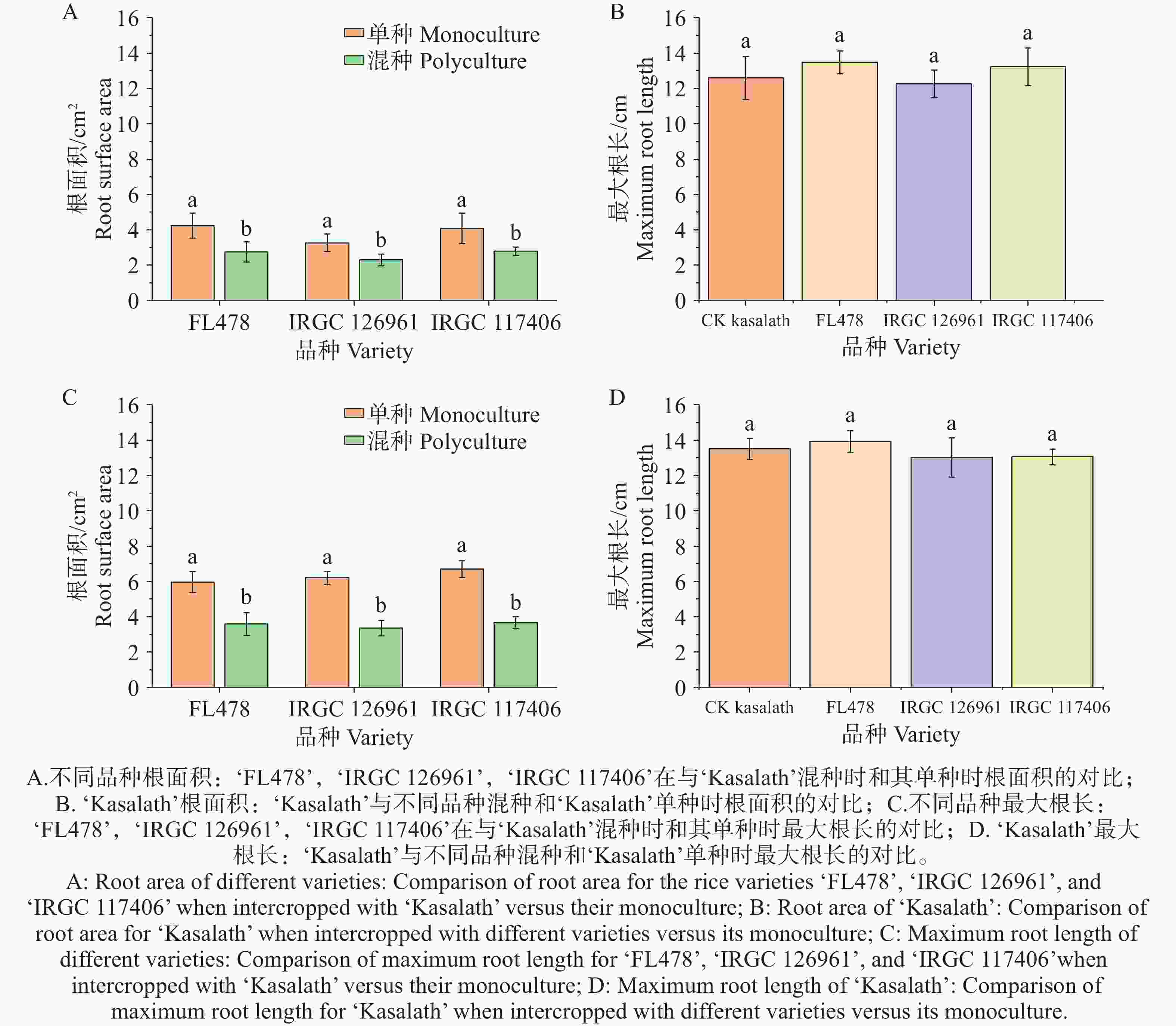 126961 ’和‘IRGC117406 ’在与‘Kasalath’混种条件下的根系生长表现。结果显示,与各自的单种处理相比,这3个品种在混种条件下的根面积和最大根长均显著下降。具体而言,‘FL478’、‘IRGC126961 ’和‘IRGC117406 ’的根面积分别下降39.8%、45.9%和45.2%;最大根长分别下降 35.24%、29.48% 和 31.54%,其中‘IRGC126961 ’的根系抑制最为显著(P < 0.05)(图2-A、C)。相比之下,‘Kasalath’的根系面积和最大根长在3种混种组合中与其自身单种对照相比均无显著变化(P > 0.05)(图2-B、D),表明其在混种条件下保持了稳定的根系生长。 -