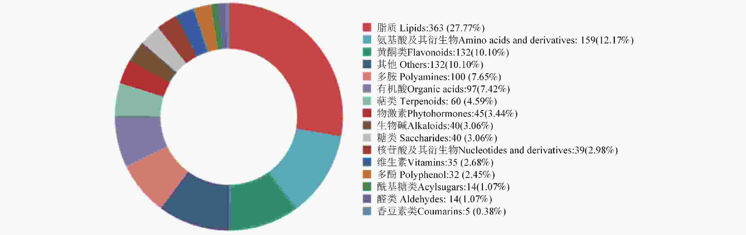 利用广泛靶向的代谢物检测技术,在水稻根系组织中共检测了1 307种代谢物的表达丰度,实验中所测定的水稻组织中的代谢物组为15个类别。代谢物分类的统计结果及各种物质的比例分布如下:脂质(Lipids)占比最大,为27.77%;氨基酸衍生物(Amino acid derivative)占12.17%;黄酮类(Flavonoid)占10.10%;有机酸(Organic acid)占7.42%;多胺(Polyamines)占7.65%;萜类化合物(Terpenoids)占4.59%;植物激素(Plant Hormones)占3.44%;生物碱(Alkaloids)占3.06%;糖类(Saccharides)占3.00%;核苷酸及其衍生物(Nucleotide derivatives)占2.98%;及维生素(Vitamins)占2.68%等。这些比例揭示了本研究样本中不同类别代谢物的组成特征(图3)。为系统解析混种互作的代谢基础,重点分析了各品种在混种处理与其自身单种对照间的差异代谢物。