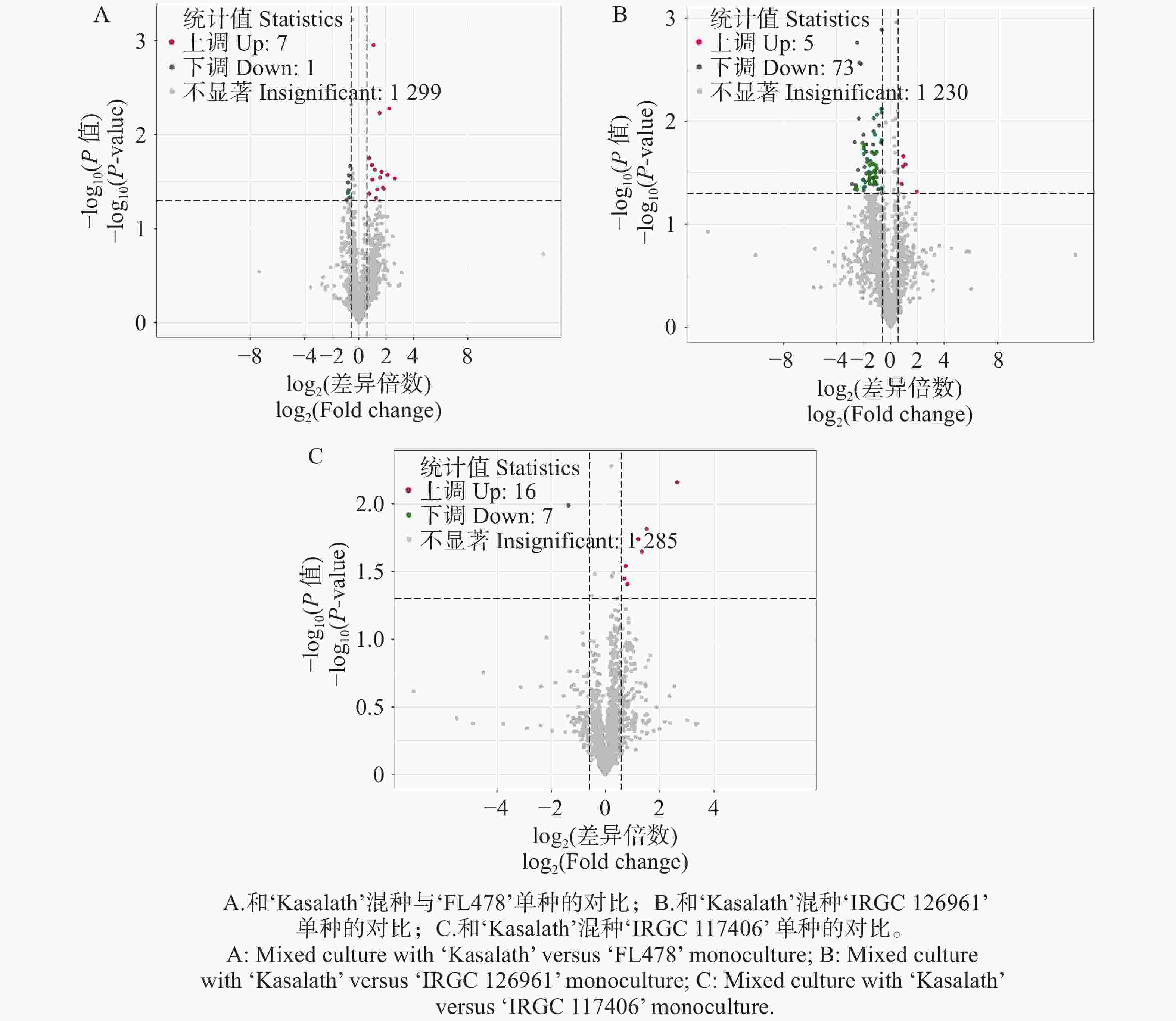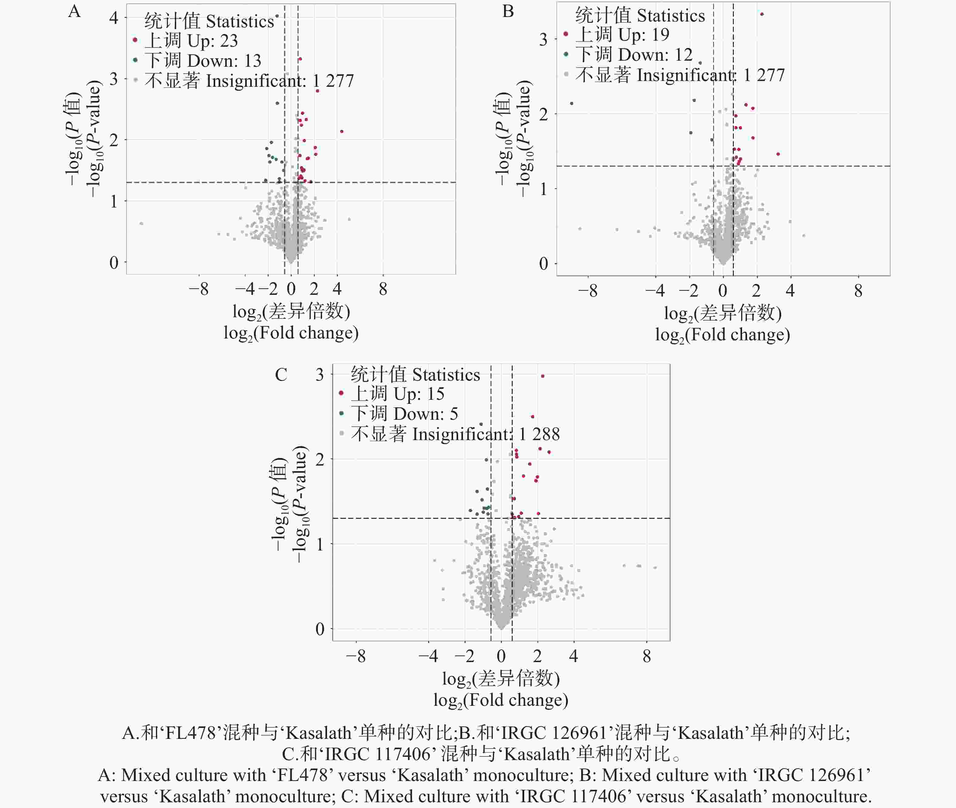 代谢组学分析表明,‘Kasalath’在与3种不同水稻材料混种时,相较于其单种条件,均能检测到一定数量的显著差异代谢物,但各组合间的代谢响应强度存在明显差异(图6)。与‘FL478’混种时,‘Kasalath’共检测到23个上调和13个下调的代谢物(图6-A),表明混种对其代谢状态产生较强影响。与‘IRGC