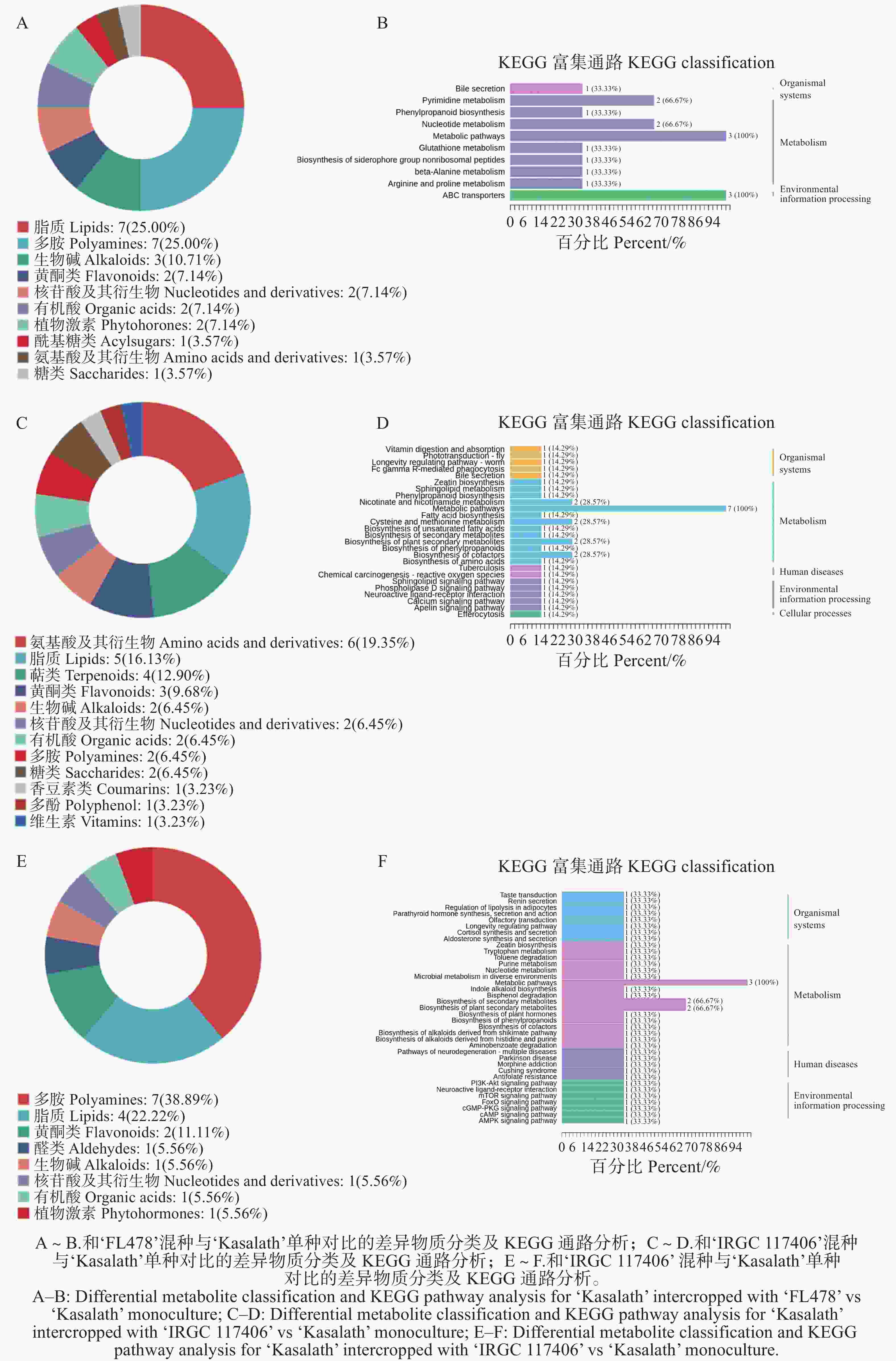 图 5 不同水稻品种混种条件下与单种时比较的差异物质分类及KEGG通路分析