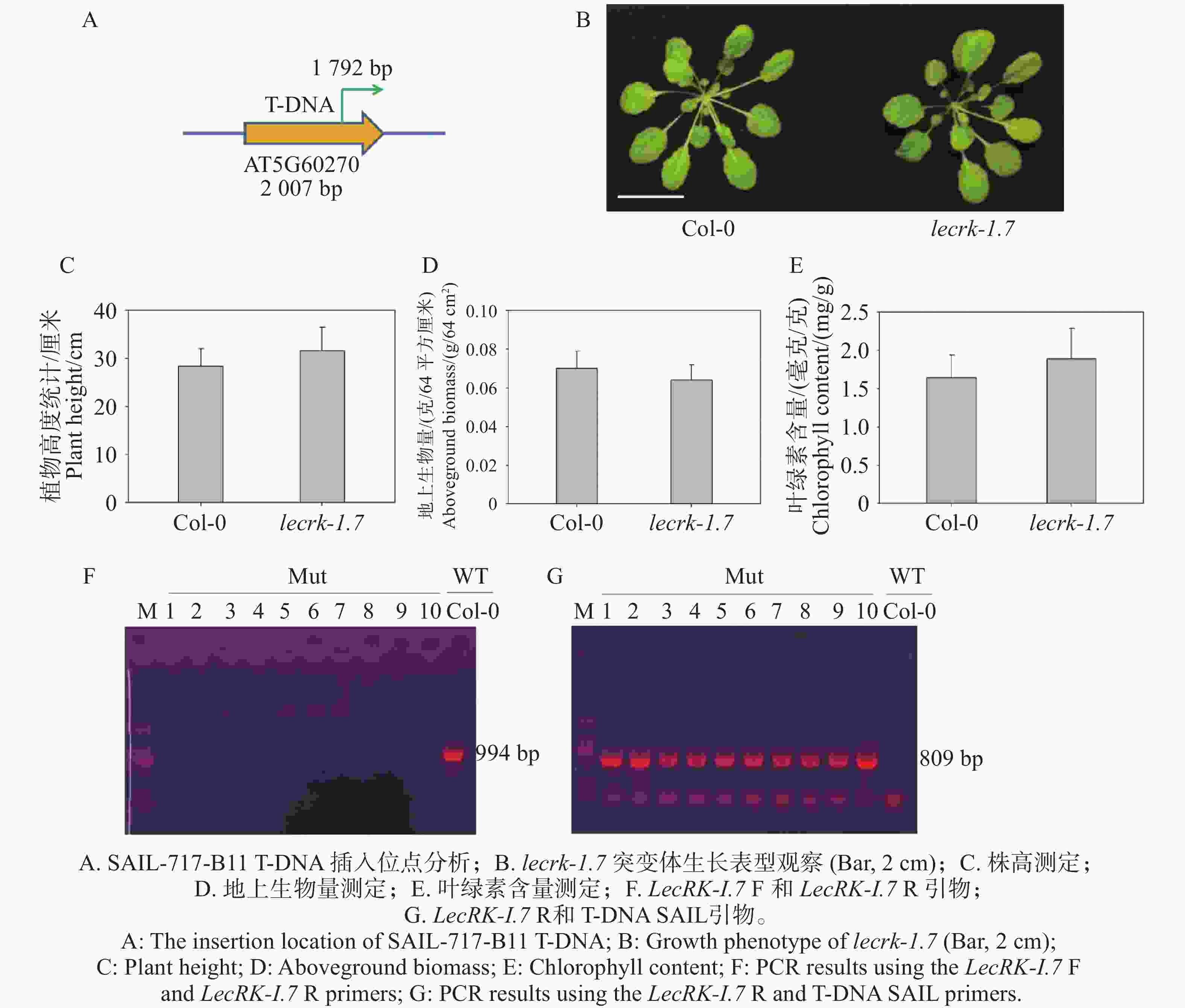 • 提取野生型拟南芥Col-0和凝集素类受体激酶LecRK-I.7基因T-DNA插入突变体lecrk-1.7(SAIL-717-B11)基因组DNA,LecRK-I.7基因由1个外显子编码,T-DNA插入位置为1 792 bp,插入方向为正向插入(图1-A),并通过三引物法验证纯合突变体植株。结果表明,利用T-DNA插入位点上下游引物进行PCR扩增,只有Col-0扩增出目的条带(图1-F),突变体不能扩增出特异性条带(图1-F);因T-DNA插入方向为正向插入,利用T-DNA引物和插入位点下游引物进行扩增,lecrk-1.7突变体1~10均扩增出目的条带(图1-G),而野生型Col-0未扩增出目的条带(图1-G)。这说明10株lecrk-1.7均为突变植株纯合系。纯合系突变体植株种植过程中,对生长4周龄的植株大小进行观察(图1-B),并且统计了地上生物量(图1-D)和叶绿素含量(图1-E)及抽苔后的株高(图1-C)。结果表明,突变体与野生型Col-0植株相比,差异性不显著;SAIL_717_B11突变体未表现出明显生长性状差异。