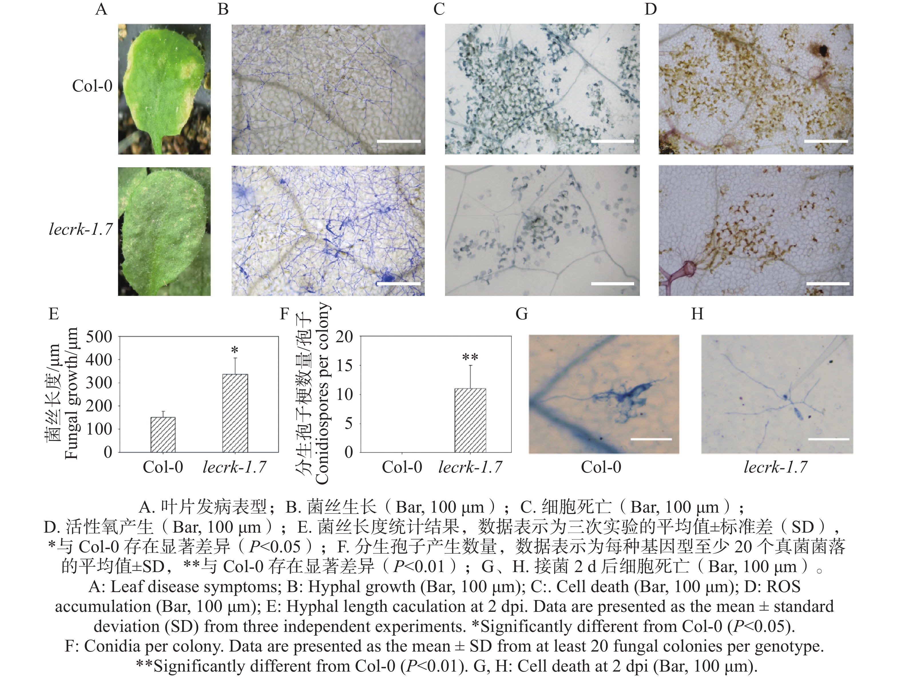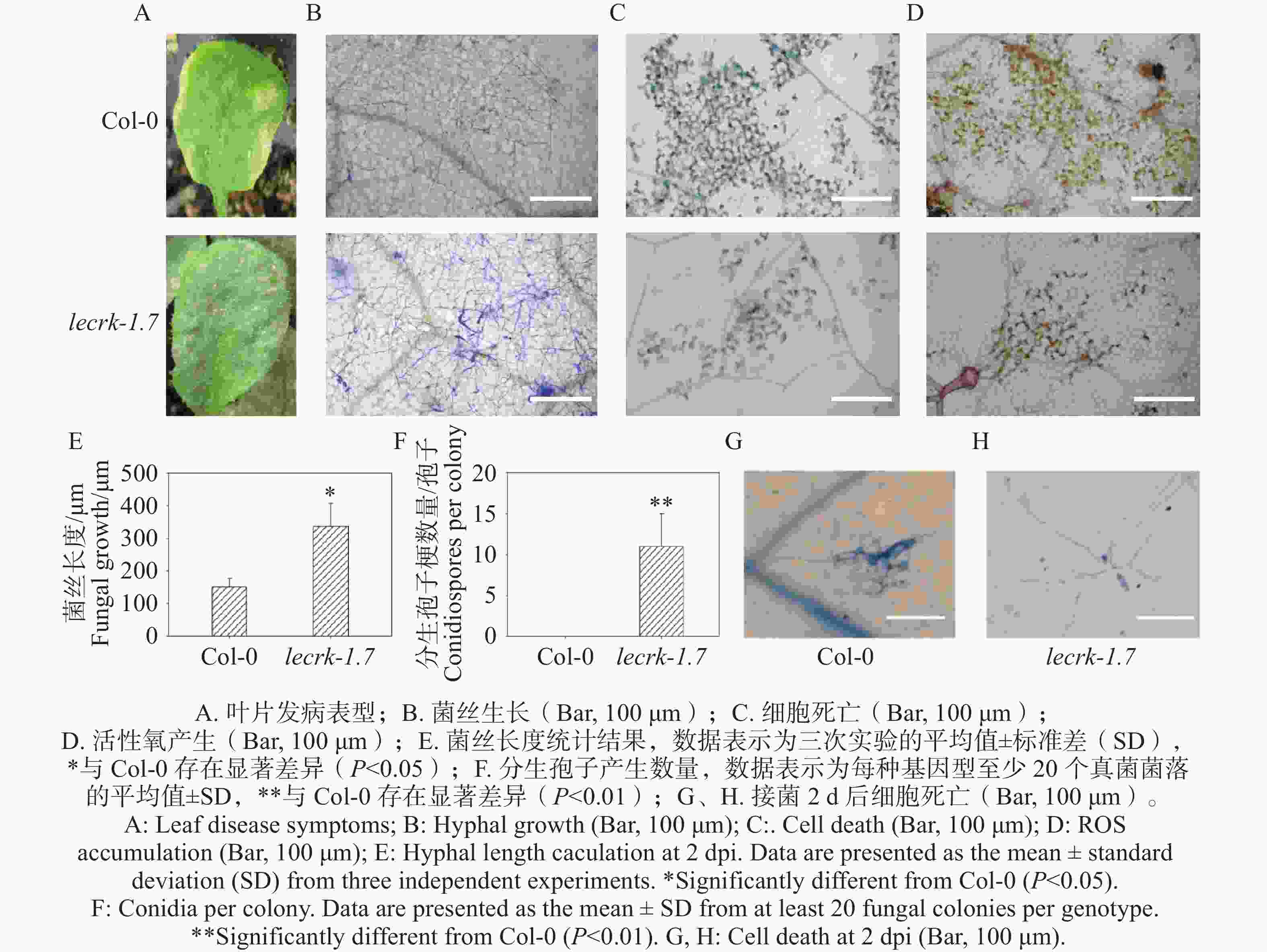• 选择生长期为4周龄拟南芥Col-0和lecrk-1.7植株同时接种O. heveae,接种10 d,lecrk-1.7叶片出现点状白粉病病斑(图2-A),而Col-0叶片表现黄化的症状(图2-A),可以初步确定LecRK-I.7基因参与了拟南芥抗对白粉菌的抗病性。进一步通过对接菌10 d的Col-0和lecrk-1.7叶片进行考马斯亮蓝染色。显微镜观察显示,与野生型Col-0相比,突变体lecrk-1.7叶片上形成了更为浓密的菌丝网络,且有少量分生孢子的产生,而Col-0叶片上仅形成稀疏的菌丝网络,未观察到分生孢子的产生(图2-B,F)。同时, O. heveaelecrk-1.7激发的细胞死亡和活性氧比在野生型Col-0都显著降低(图2-C,D),这进一步说明了凝集素受体激酶基因LecRK-I.7O. heveae发挥抗病功能。