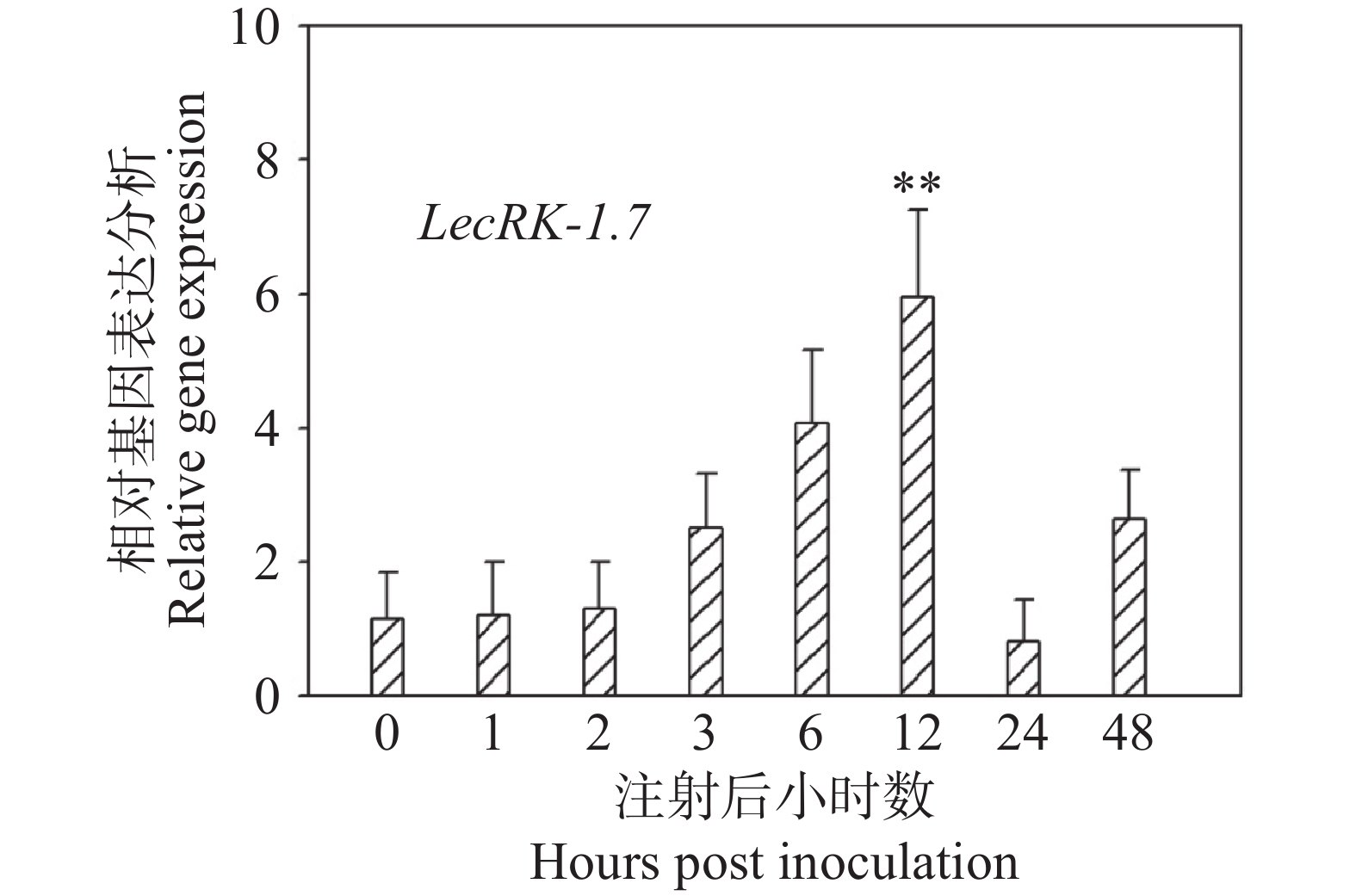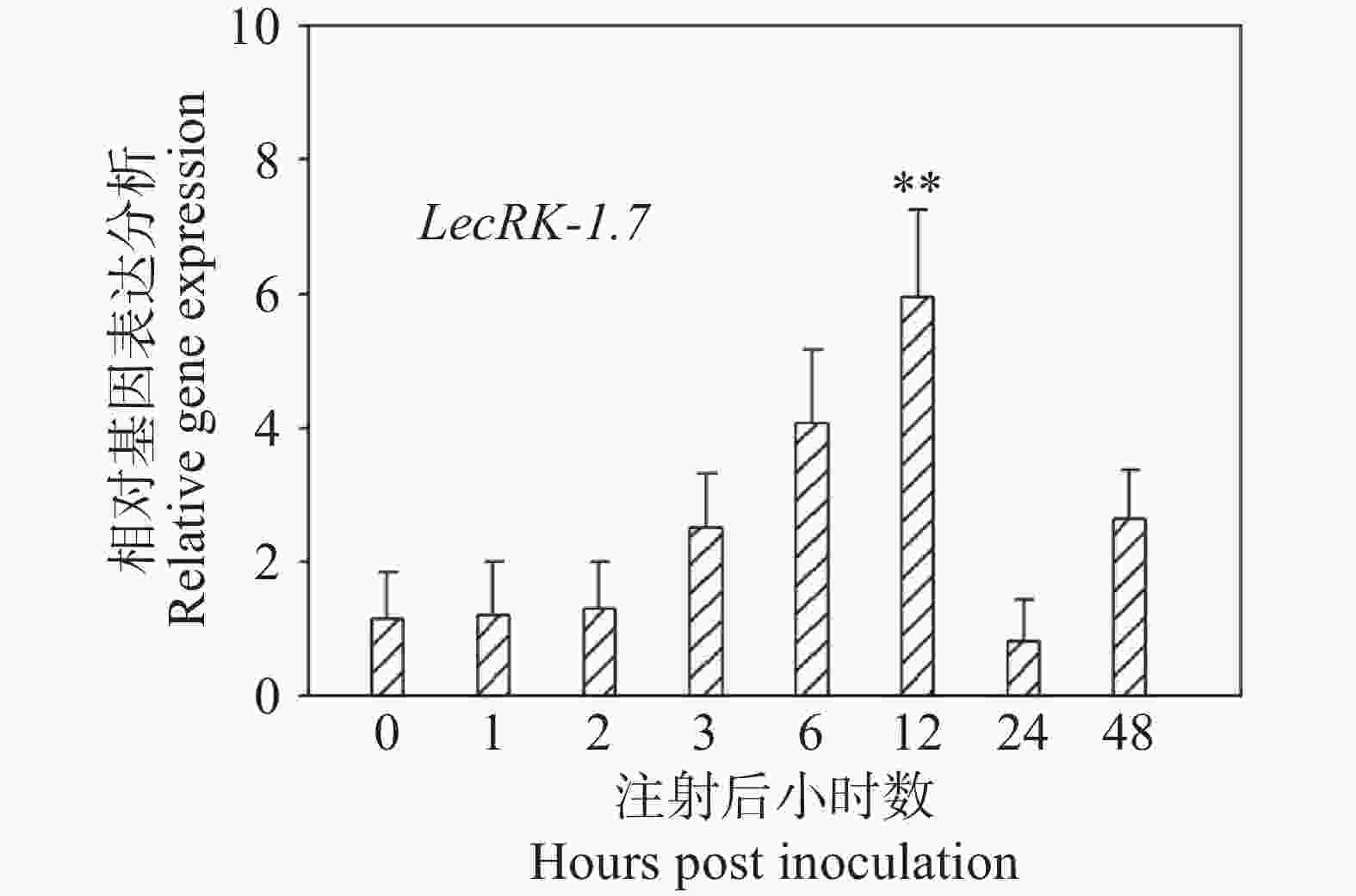 • 实验室(海南大学植物白粉病抗性分子育种研究室)通过前期RNA-seq数据发现LecRK-I.7基因在O. heveae侵染12 h时发生了上调表达,但为了进一步探索LecRK-I.7在白粉菌侵染过程中的表达模式,本研究团队对接菌后0 、1 、2 、3 、6 、12 、24 和48 h的Col-0取样,提取总RNA并进行反转录后,利用荧光定量PCR检测LecRK-I.7的表达水平,结果发现,与0 h相比,LecRK-I.7基因在白粉菌接种后3、6、12 h均发生了不同程度的上调表达,接种12 h后LecRK-I.7的表达量达到最高,是接种0 h的6倍左右。接种24 h后,基本回复到0 h正常水平(图3)。O. heveae在拟南芥侵染后12 h是第一根芽管形成附着孢刺入植物细胞形成初生吸器的关键阶段,因此推测LecRK-I.7基因可能在白粉菌进入植物细胞阶段表达发挥抗性功能。