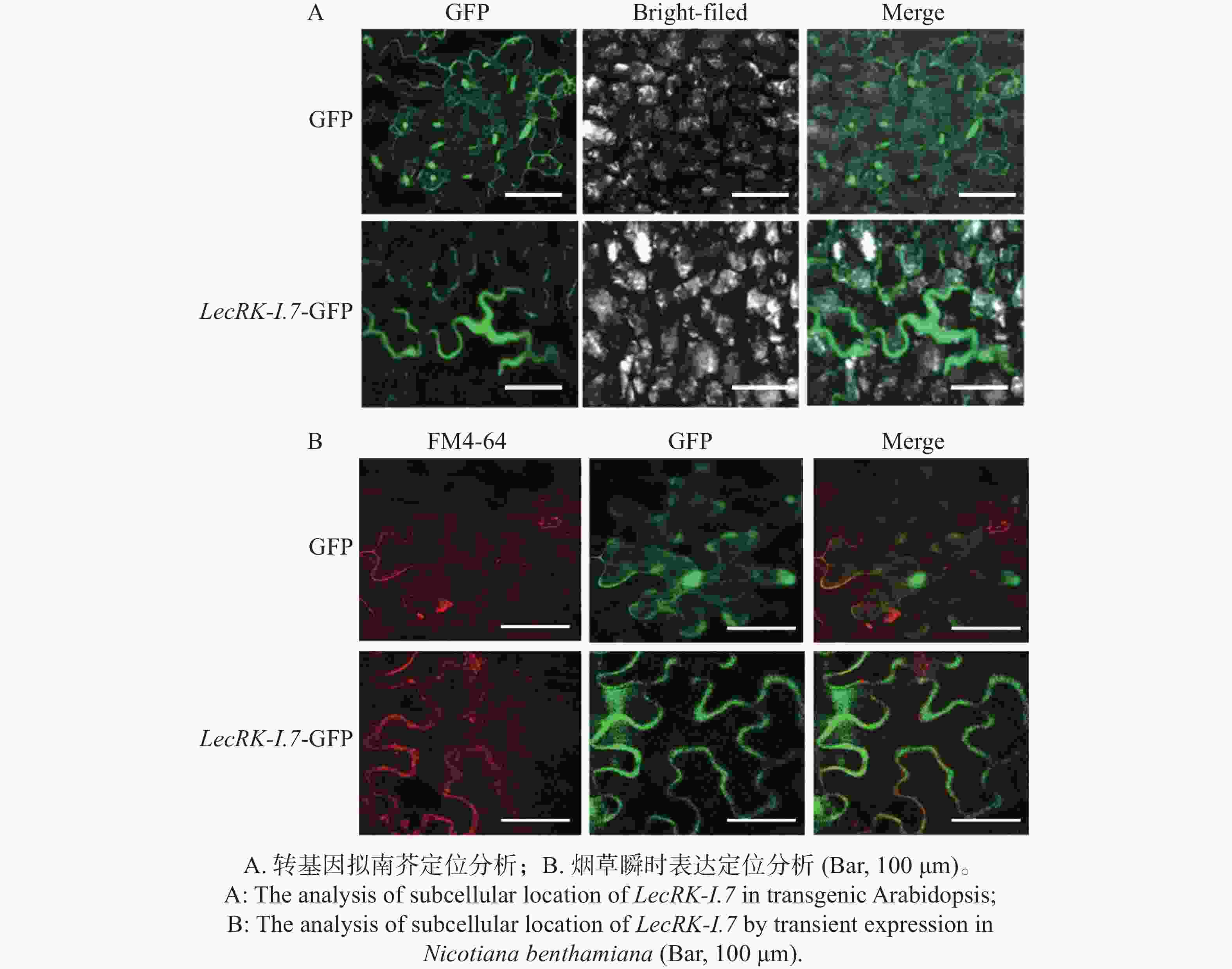 • 凝集素类受体激酶定位于植物细胞膜发挥功能[9]。通过蛋白结构预测发现LecRK-I.7蛋白具有胞内激酶结构域、胞外凝集素结构域和2个跨膜结构域,跨膜结构域分别位于233-255 AA和286-308 AA,因此推测LecRK-I.7基因定位于植物细胞膜发挥功能。为了确定LecRK-I.7基因是否定位于植物细胞膜,本研究构建了35S组成型启动子驱动的LecRK-I.7-GFP融合表达载体,利用农杆菌转化,将LecRK-I.7-GFP基因转入拟南芥Col-0,并筛选出阳性转基因植株,通过激光共聚焦显微镜对其叶片进行观察。结果发现,在488 nm激发光下,LecRK-I.7-GFP融合蛋白的绿色荧光信号主要分布于细胞膜(图4-A),对照GFP在细胞膜、细胞核和细胞质均有表达(图4-A)。利用本生烟瞬时表达系统,分别注射含有GFP空载体和LecRK-I.7-GFP载体的农杆菌,并用细胞膜染料FM4-64处理注射叶片,结果与拟南芥转基因相似,细胞膜、细胞核和细胞质均可以观察到对照GFP的存在,而LecRK-I.7-GFP融合蛋白的绿色荧光信号主要分布于细胞膜并与FM4-64信号相融合(图4-B),暗示着LecRK-I.7基因主要定位于细胞膜发挥功能。