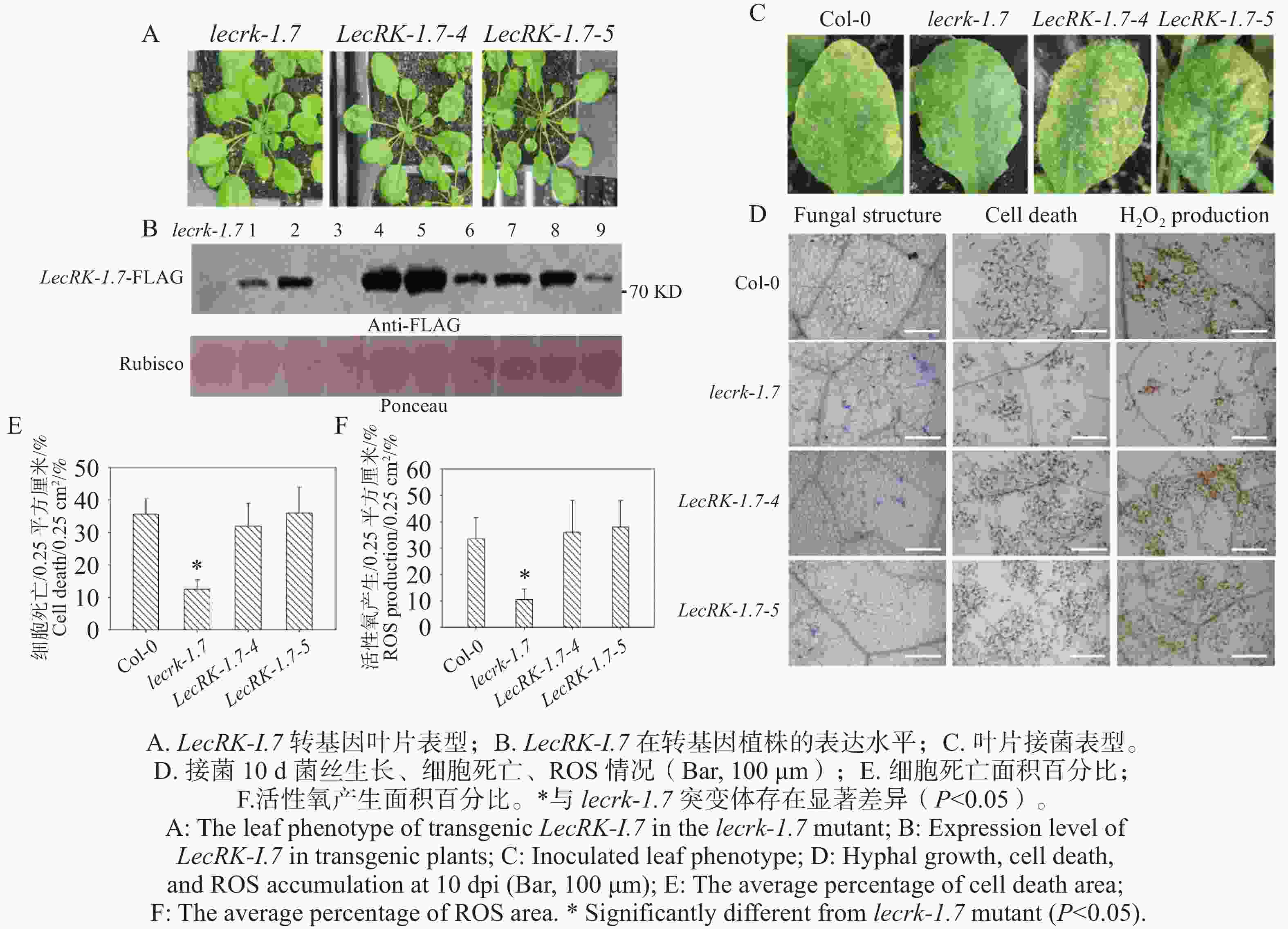 • 本研究构建了35S组成型启动子驱动的LecRK-I.7-FLAG融合表达载体,导入农杆菌,将LecRK-I.7-FLAG载体转化拟南芥lecrk-I.7突变体,利用免疫印迹筛选出高表达阳性转基因植株Line 4和Line 5(图5-B),通过表型观察,2个高表达阳性转基因植株Line 4和Line 5与突变体lecrk-1.7相比,未表现出明显抗性表型(图5-A)。分别对Col-0、lecrk-1.7突变体和2个LecRK-I.7转基因植株接种O. heveae,接种后10 d,野生型Col-0和2个LecRK-I.7转基因系叶片均表现典型黄化症状(图5-C),而lecrk-1.7叶片出现白粉病点状病斑(图5-C),未表现出发黄表型。进一步通过考马斯亮蓝染色,显微观察发现O. heveae在Col-0和2个LecRK-I.7转基因系形成相似的菌丝网络,未检测到分生孢子的产生,而在突变体lecrk-1.7形成浓密的菌丝网络和少量的分生孢子(图5-D)。利用台盼蓝和DAB染色,经显微观察发现在接菌后转基因叶片与野生型Col-0叶片均表现出明显细胞死亡与活性氧产生(图5-D)。进一步统计活性氧产生(图5-F)和细胞死亡(图5-E)面积百分比,野生型Col-0和2个转基因系与lecrk-1.7突变体存在显著差异,说明LecRK-I.7回复了突变体lecrk-1.7O. heveae的抗病性。