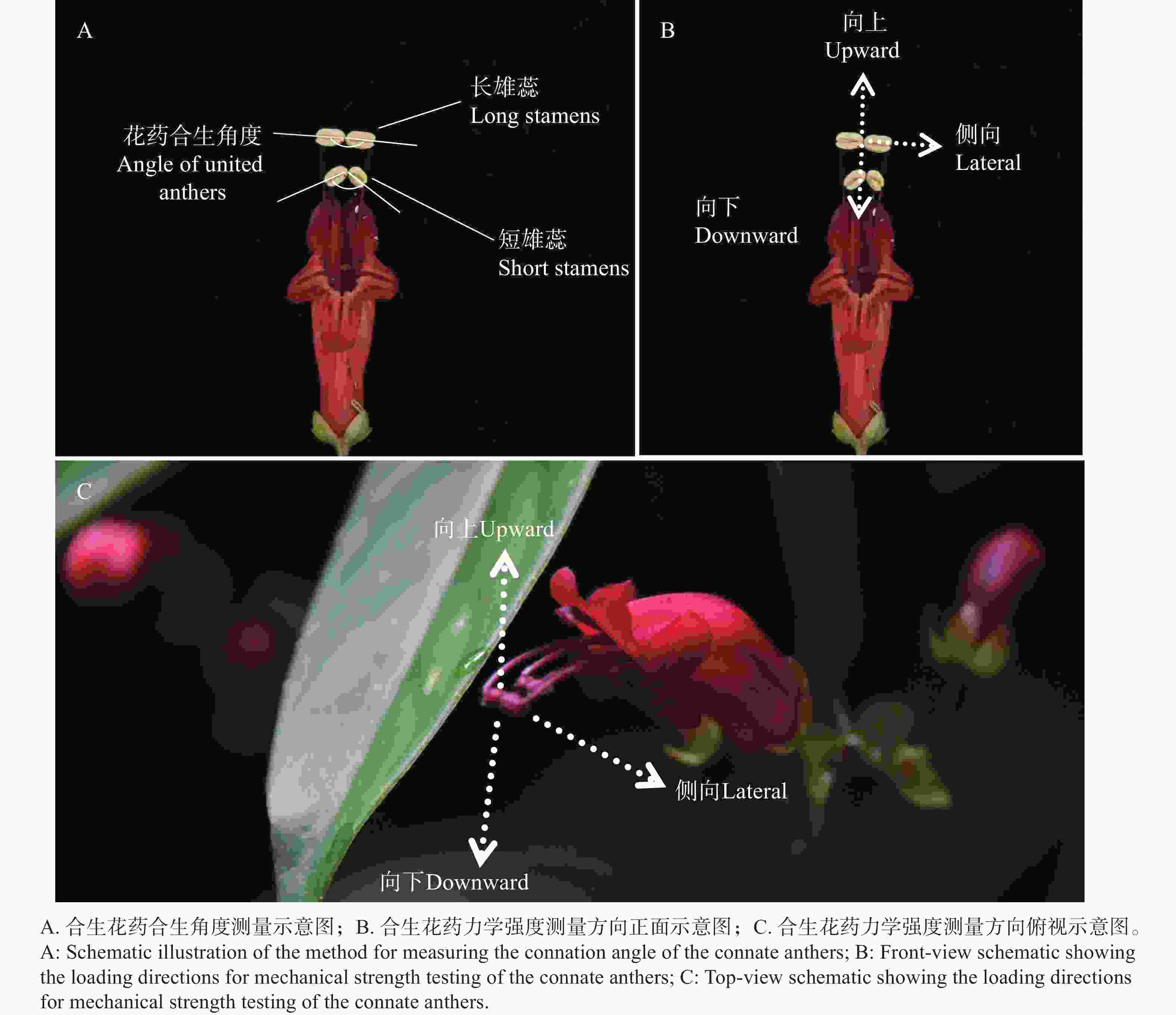 • 雄蕊合生是花内雄蕊通过花丝和(或)花药愈合生长在一起的现象,可分为花丝合生、花药合生、花丝花药均合生3大类[1-2]。雄蕊合生直接影响着花内雌雄蕊的空间位置和传粉过程,是传粉生物学和植物学研究中的一个重要性状和主要分类依据[1]。花药合生(anther union)是雄蕊合生的主要方式之一,花内的雄蕊全部或部分通过花药合生在一起, 花丝相互分离[1-2]。这种合生方式能够将花内花药和花粉聚集在同一个空间位置,并通过合生结构稳定花药的空间位置、调节雌蕊和雄蕊之间的空间距离,提高花粉落置在传粉者身体上的精确性,降低了花粉浪费[2-3]。花药合生现象集中出现在菊科(Asteraceae)、堇菜科(Violaceae)、葫芦科(Cucurbitaceae)、爵床科(Acanthaceae)、苦苣苔科(Gesneriaceae)、夹竹桃科(Apocynaceae)等植物中[1]。花药合生又可分为两种类型:聚药雄蕊(花内所有花药共同合生)、花药成对合生(花内雄蕊成对分别合生,常出现在二强雄蕊中)[1-3]。在苦苣苔科芒毛苣苔属(Aeschynanthus[4]和长冠苣苔属(Rhabdothamnopsis[5]的二强雄蕊中,花药合生现象非常典型,一对长雄蕊和一对短雄蕊的花药分别以顶端紧密黏合的方式成对合生[4]。但是,目前关于花药合生程度(即合生部位黏合程度)和合生强度(黏合部位被分离开的力学强度)对传粉过程和传粉者适应机制还缺乏针对性研究。