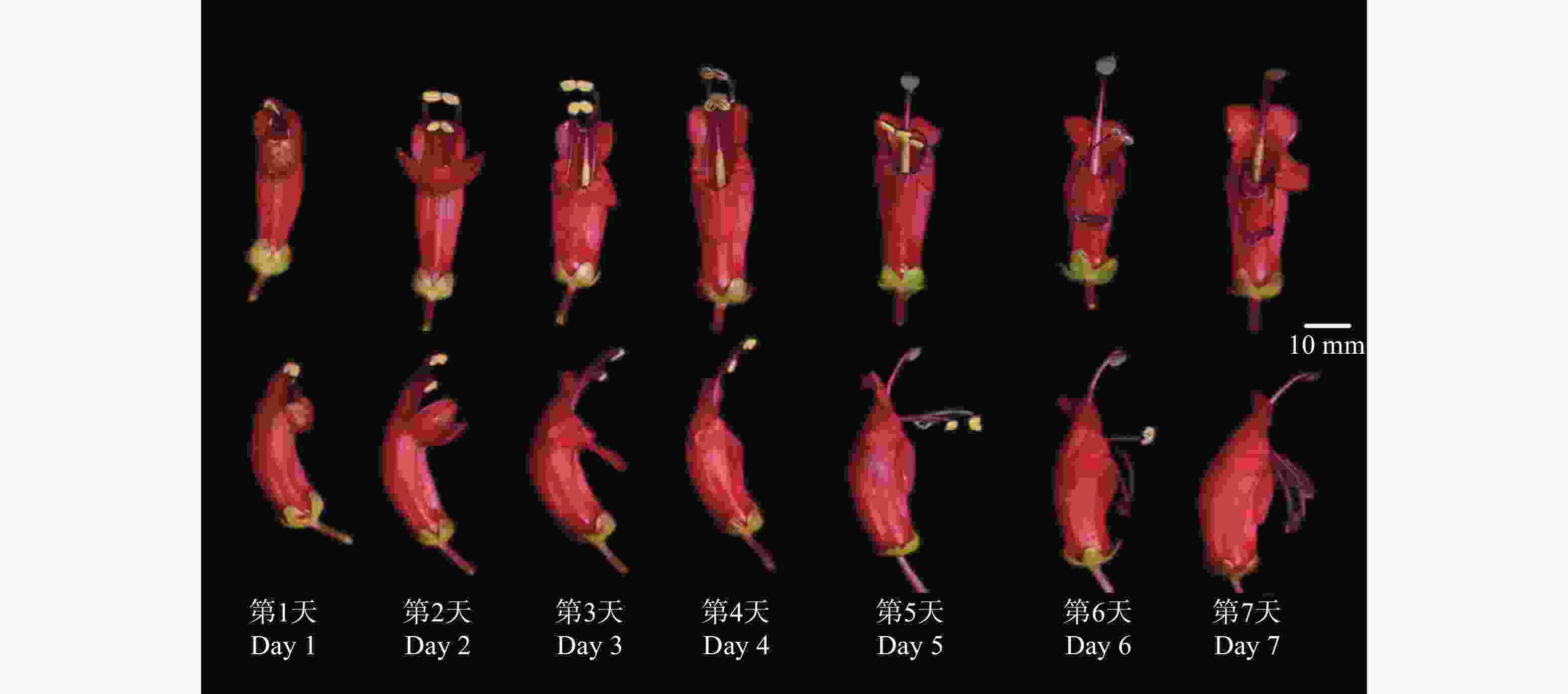 在花开第1天(花蕾期),雌雄蕊被包裹在花冠筒内,2对合生雄蕊弯曲折叠,位于雌蕊上方,部分花蕾中雄蕊花药已经开裂,露出花粉。第2天,雌蕊位于花冠筒喉处,柱头颜色为紫红色,2对合生雄蕊完全伸出花冠筒,花药饱满,花粉丰富(散粉期)。随后,花柱逐渐伸长伸出花冠筒,接近雄蕊,当花柱伸长到短雄蕊花药下方时,柱头膨大,颜色从紫红色变透明,分泌黏液;雄蕊花药略变扁,雄蕊花丝还未明显向下弯曲(柱头可授期)。在第5天时,雌蕊花柱继续伸长,超出花药位置,柱头仍然分泌有少量黏液。第6天,两对合生雄蕊花丝变软变细,颜色变暗,向下弯曲超过90°,花粉色泽变淡。第7天后,2对合生雄蕊花药干扁,雄蕊花丝完全下垂,紧贴花冠筒下腹面。