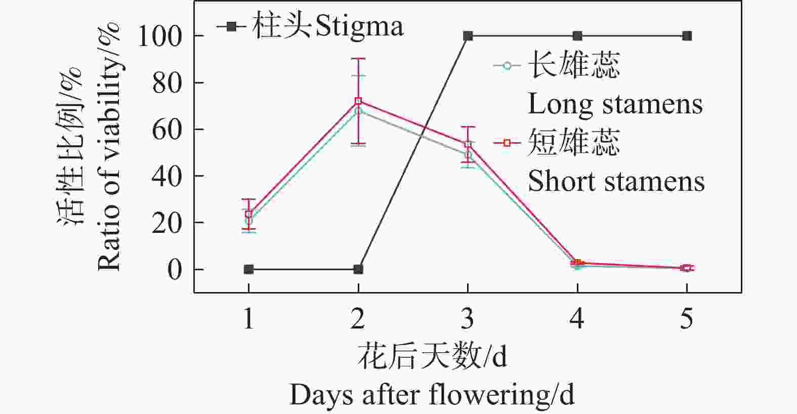 • 红花芒毛苣苔的花粉在花瓣裂片打开时就有一定活性,但其活性较低(长雄蕊,20.75%±4.94%;短雄蕊,23.64%±6.50%),花粉活性在花开后第1~2天达到最大值(长雄蕊,67.90%±14.97%;短雄蕊,72.13%±18.25%),之后逐渐降低,最后完全失去活性。柱头在开花前没有活性,在花开放后的第3天活性达到最高值,随后活性持续3~4 d(图5)。