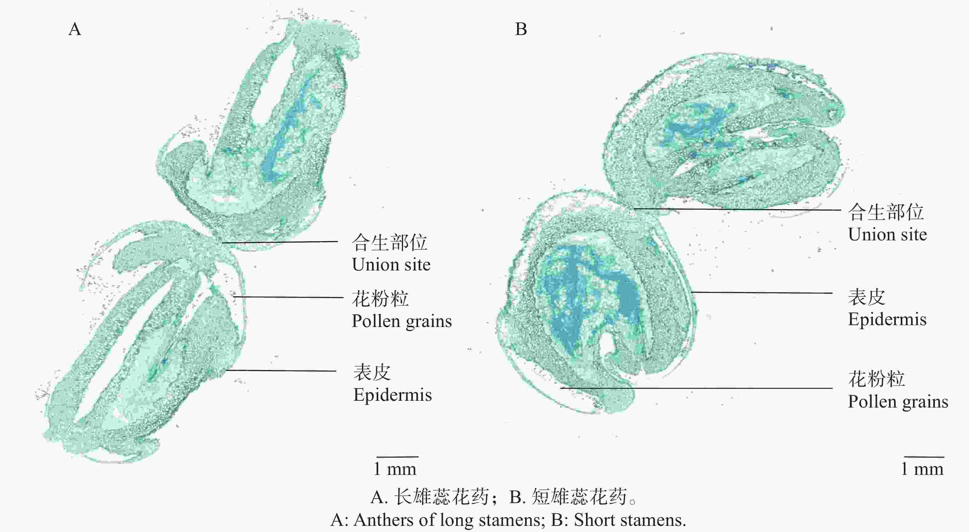 观察2对合生花药解剖结构图,两对合生花药均以顶端表皮黏合的方式形成合生(图6-A、B)。长雄蕊合生花药形状类似长方形,短雄蕊则类似椭圆形状;长雄蕊与短雄蕊花药合生的程度和角度不同,短雄蕊花药合生的接触长度为(521.63±4.57)µm,长雄蕊合生接触长度为(203.33±2.51)µm。短雄蕊花药合生程度即黏合部分更大。