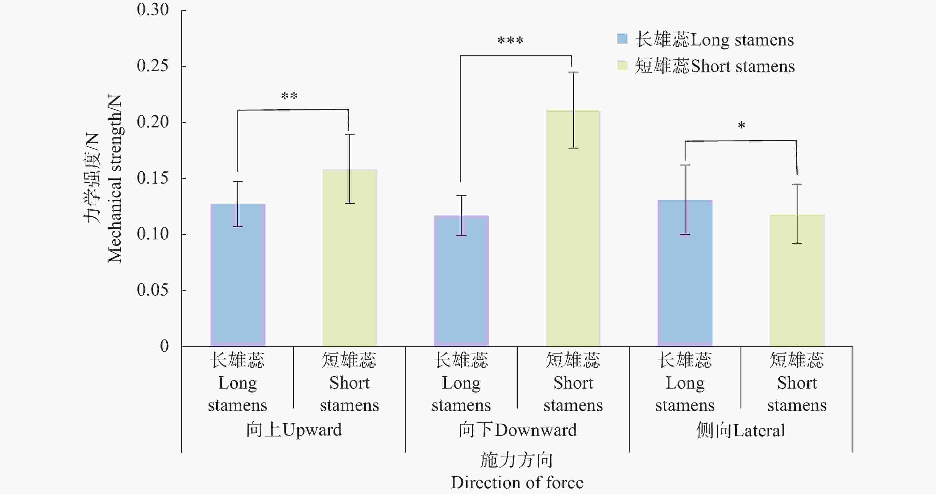 • 在3个不同的施力方向中,短雄蕊合生花药在向上(F=0.159±0.031N)、向下(F=0.211±0.034N)施力时的力学强度显著高于长雄蕊合生花药(向上:F=0.127±0.020 N;向下:F=0.117±0.018 N),说明合生短雄蕊在受力时较合生长雄蕊稳定,花药不易分离 (图7)。在侧向施力时,长雄蕊(F=0.131±0.031N)则强于短雄蕊(F=0.118±0.026N)。