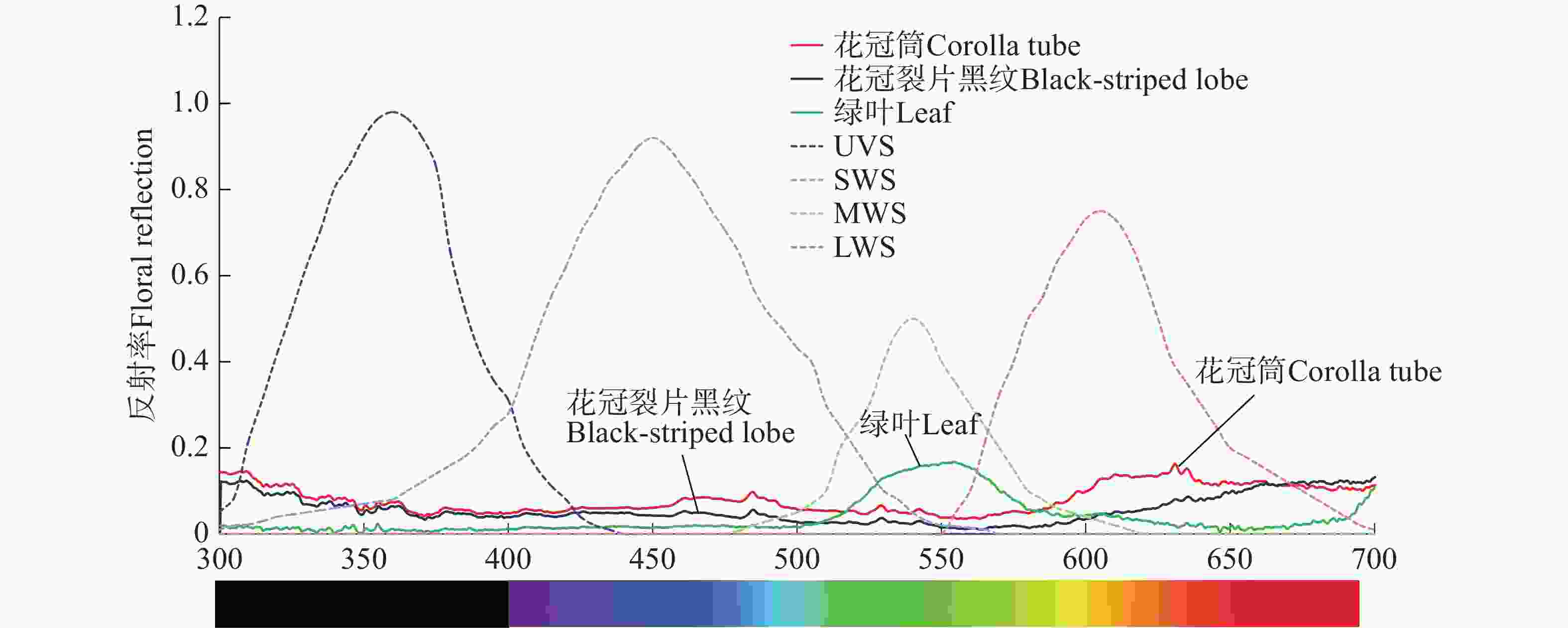 • 取不同植株且刚开放的花6朵,用便携式光谱仪(赛曼S3000-UV-NIR)和光纤反射探针(Fiber Y 400 μm)测量花冠筒、花冠筒裂片上的黑色条纹及花下第1片叶的反射率。光源采用脉冲氙灯(Xe-02),参考光使用标准反射白板(WB-02)。测量时将探针倾斜45°并置于距离花瓣表面5 mm处。用SpectraProV3.3(杭州塞曼科技有限公司)整理反射率数据[8]
