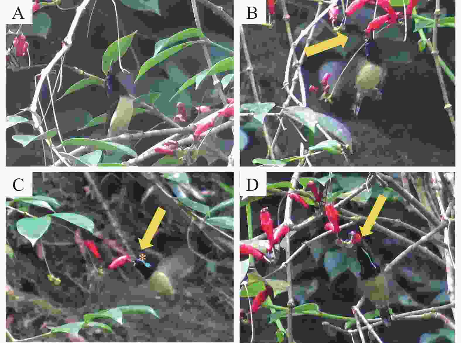 叉尾太阳鸟访问花后第4~7天的雌性功能期的花时,用喙伸入并压低花冠筒,其头部接触到两对雄蕊花药的花粉和雌蕊柱头,当鸟喙基部接触到柱头的时候,可以把鸟喙基部携带的来自短雄蕊合生花药的花粉落置在柱头上(图9-B)。当其鸟喙将两对雄蕊压下,从2对雄蕊和柱头中间伸入花冠筒吸取花蜜,其头部只接触到柱头,此时鸟头部黏着的花粉被传递到已经成熟(柱头膨大)的柱头上(图9-C)。当柱头还未成熟,仍处于花冠筒喉部时,叉尾太阳鸟的身体未能接触到柱头(图9-D)。