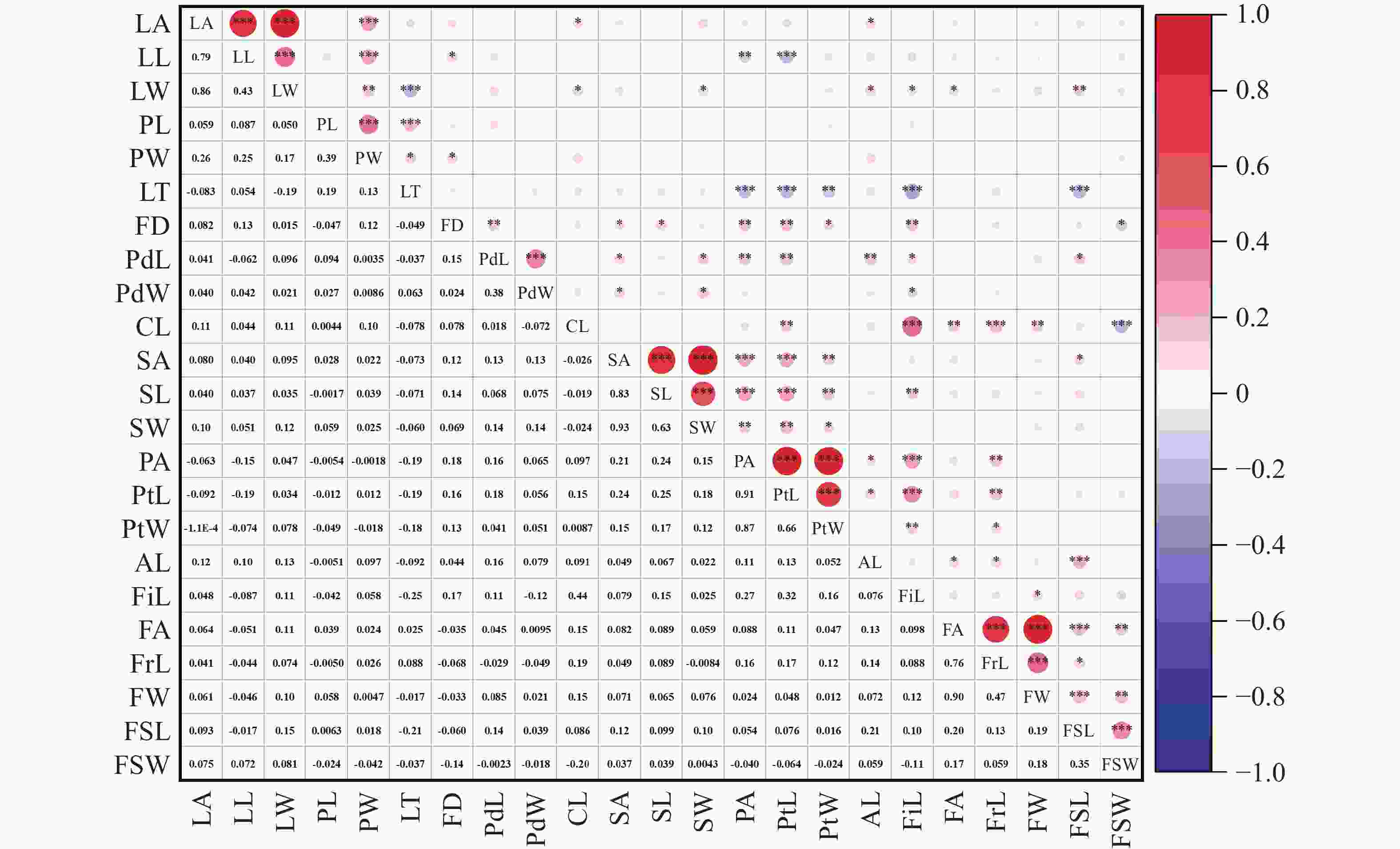 注:左下三角区域显示相关系数值,右上三角区域的彩色圆圈表示相关系数大小和方向(红色表示正相关,蓝色表示负相关),圆圈内的星号表示统计显著性(*表示P<0.05,**表示P<0.01,***表示P<0.001)。颜色条显示相关系数从-1(蓝)到1(红)的连续变化。LA. 叶面积; LL. 叶片长度; LW. 叶片宽度; PL.叶柄长; PW. 叶柄宽; LT. 叶厚度; FD: 花径; PdL. 花梗长; PdW: 花梗宽; CL. 萼筒长; SA. 萼片面积; SL. 萼片长; SW. 萼片宽; PA. 花瓣面积; PtL.花瓣长; PtW. 花瓣宽; AL. 花药长; FiL. 花丝长; FA. 果实面积; FrL. 果实长; FW. 果实宽; FSL. 果柄长; FSW. 果柄宽。