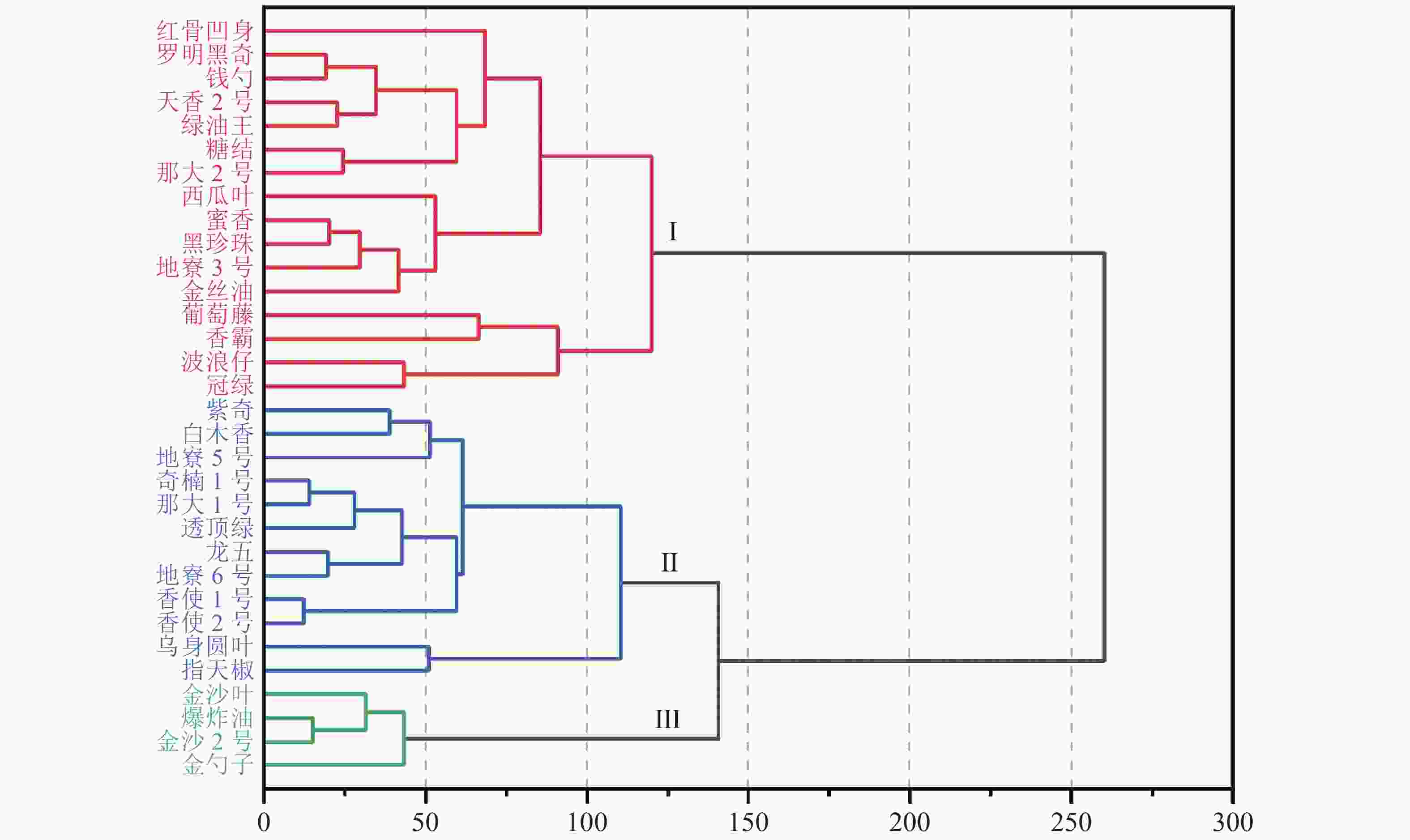 • 表型性状的多样性与变异性是评估遗传多样性的关键依据,种质资源的表型多样性越丰富、变异性越显著,则品种间的遗传分化越大,其遗传多样性水平也越高[28]。田朋佳[29]等认为,当变异系数大于10%时,样本间的差异较大,本研究表型数量性状变异系数为9.04%~34.77%,其中,除花径和萼片长以外的21个数量性状变异系数均大于10%,说明这21个表型性状的变异较丰富。本研究表型数量性状遗传多样性指数(H′)为1.73~2.09,质量性状多样性指数(H′)为0.234~1.285,说明该材料在数量性状和质量性状上均表现出丰富的多样性。同时,数量性状的多样性指数普遍高于同条件下质量性状的多样性指数,与前人的研究结果相同[30]。表明本研究选取的32份白木香奇楠种质表型差异较大,遗传背景丰富,可作为后续品种改良的依据。