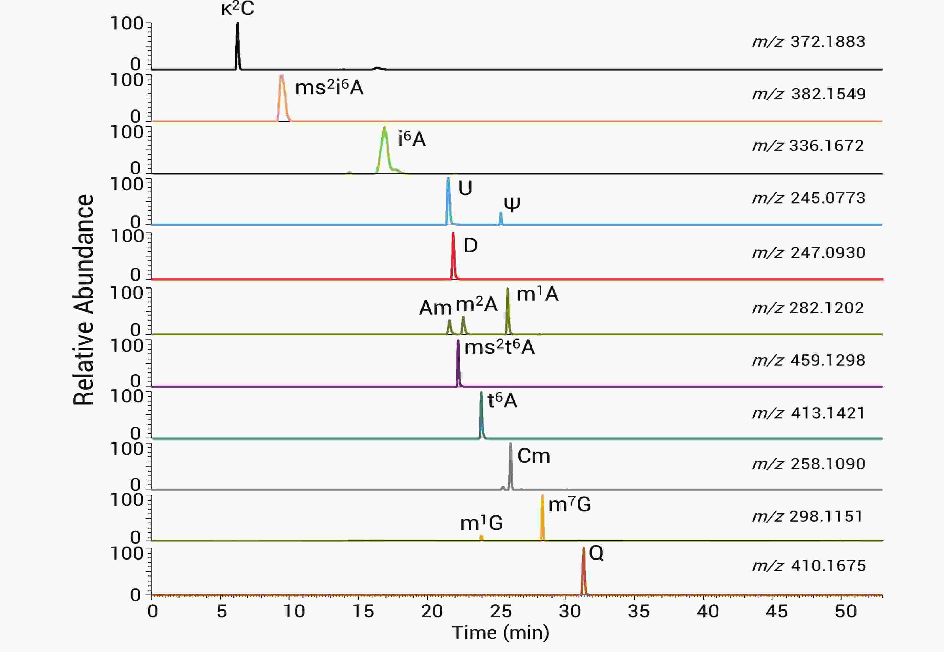 • 采用三重四极杆质谱和高分辨质谱对从巴氏醋杆菌tRNA上消化下来的修饰核苷进行鉴定和相对定量追踪。如图2-A所示,336→136和336→204离子对可用于检测修饰核苷i6A(N6-isopentenyladenosine)。m/z 136和204的产物离子分别对应i6A裂解得到的腺苷碎片及异戊烯基修饰腺苷碎片(图2-B)。同时可以在高分辨质谱上得到i6A正电离子(z=+1)的精确质荷比336.1664(与理论值336.1672质量差为-0.0008 Da)。二级谱显示对应清晰的136和204产物离子(图2-C)。通过这样的方法在质谱上检测出14种tRNA修饰核苷,包括κ2C(2-lysidine), ms2i6A(2-methylthio-N6-isopentenyladenosine), i6A(N6-isopentenyladenosine), Ψ(pseudouridine), D(dihydrouridine), Am(2'-O-methyladenosine), m2A(2-methyladenosine), m1A(1-methyladenosine), ms2t6A(2-methylthio-N6-threonylcarbamoyladenosine), t6A(N6-threonylcarbamoyladenosine), Cm(2'-O-methylcytidine), m1G(1-methylguanosine), m7G(7-methylguanosine)以及Q(queuosine),同分异构体通过保留时间区分,各修饰核苷的提取离子色谱峰如图3所示。
