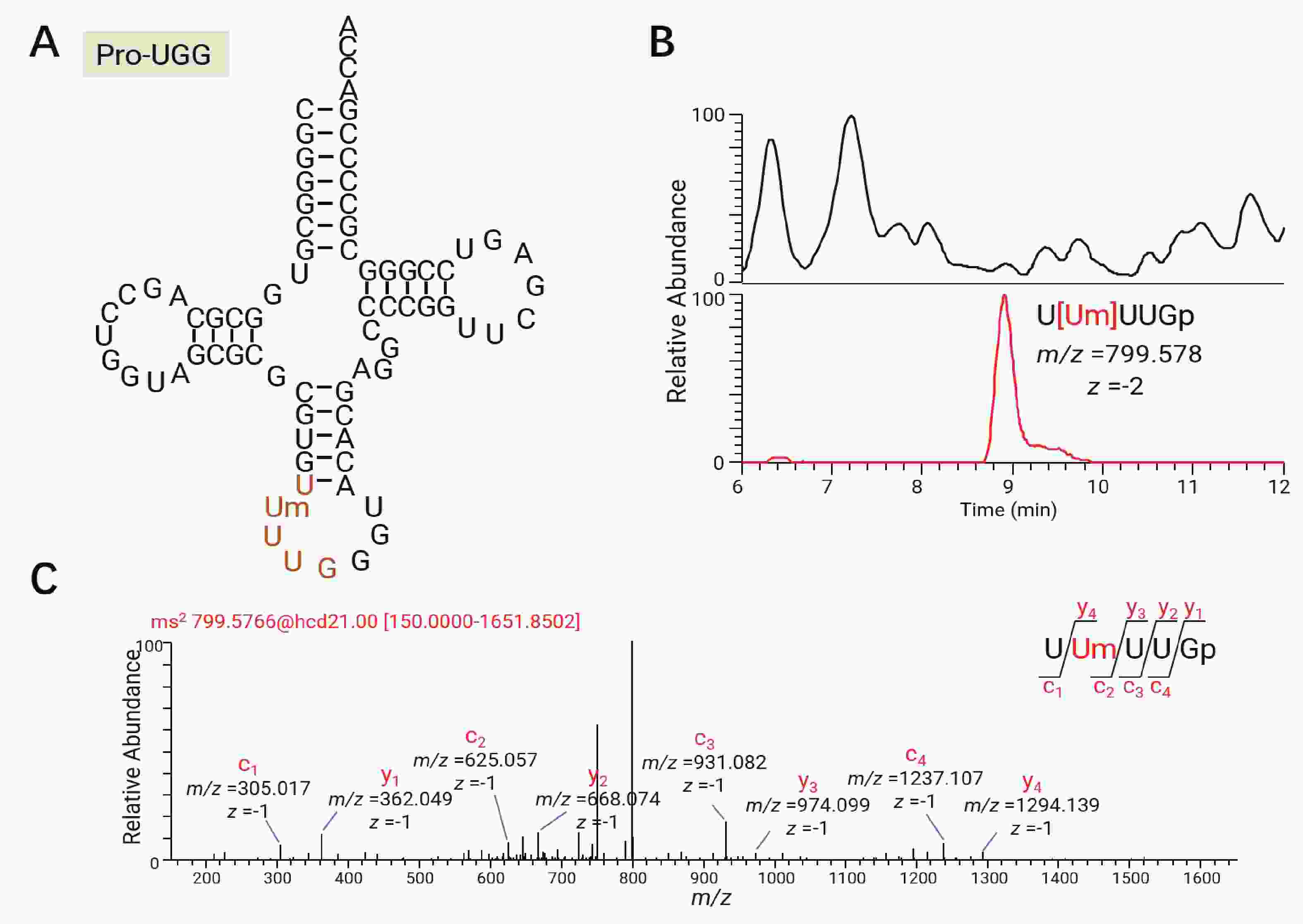 • tRNA修饰所在的位点与它的功能密切相关。例如前面提到的Inosine在tRNA 第34位上参与wobble摆动拓宽了tRNA解读密码子的范围。将巴氏醋杆菌的总tRNA进行限制性核苷酸酶T1和限制性核苷酸酶A的消化,可以通过寡核苷酸分析定位tRNA修饰的具体位点。以巴氏醋杆菌tRNAPro-UGG为例,该tRNA经RNase T1消化切割后产生特征片段U[Um]UUGp,位于反密码子环,且携带一个甲基化修饰(图4-A)。通过观察该片段的一级精确质荷比(图4-B)和对碰撞诱导碎裂的特定产物离子的鉴定,得到其中的修饰Um的位置(图4-C)。在这里仅采用具有序列独特性的片段进行鉴定,即某片段的序列在巴氏醋杆菌所有tRNA中仅能在特定某一个tRNA上找到时,才认为其中的修饰位点是可信的。通过寡核苷酸分析方法,在核苷分析鉴定的14种tRNA修饰的基础上还鉴定出了Um,cmnm5Um,mnm5U,cmnm5U,cmnm5s2U五种修饰。这五种修饰都是正电模式下难以电离的尿苷衍生物,在负电模式的寡核苷酸分析中得以检出。序列独特性片段及修饰位点的汇总结果如表1所示。