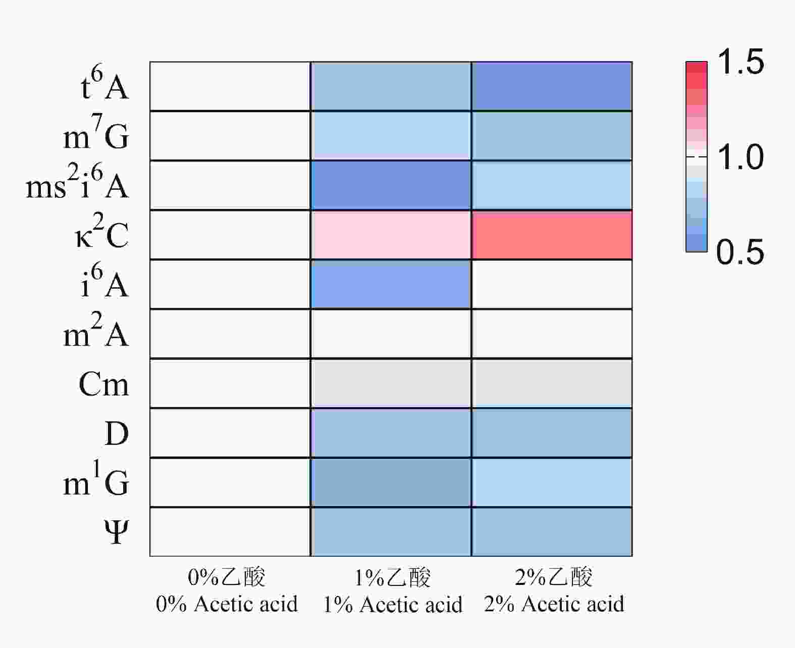 • 巴氏醋杆菌耐酸性能突出,即使在2%乙酸环境下仍可维持代谢活性与生长。尿苷(U)是RNA分子中的基础核苷之一,含量相对稳定,且在质谱分析中信号响应可靠,其峰面积可在一定程度上反映RNA总量,因此常被用作修饰核苷相对定量的归一化参照[30-31]。基于此,本研究采用三重四极杆质谱追踪1%与2%乙酸胁迫条件下巴氏醋杆菌tRNA中t6A、m7G、ms2i6A、κ2C、i6A、m2A、Cm、D、m1G及Ψ等修饰的信号强度,并以尿苷峰面积进行归一化处理,绘制获得tRNA修饰动态变化热图(图6)。热图结果显示,乙酸胁迫下κ2C水平呈剂量依赖性升高,而t6A、m7G、ms2i6A、D、m1G及Ψ等修饰则出现不同程度降低。上述下调可能与胁迫条件下整体代谢与能量供给受限有关:菌体通过重新分配资源,在保证生存与基本翻译需求的前提下降低部分修饰水平,仅维持满足tRNA功能与氨酰化效率所需的最低修饰率;而变化不明显的修饰则提示满足tRNA功能与氨酰化效率在胁迫状态下仍被优先维持,可能具有“house-keeping”性质。值得注意的是,κ2C的核心作用在于保障tRNAIle2(CAU)对AUA密码子的解码并且抑制对AUG的错误解码,而κ2C缺失会导致密码子误读并降低翻译效率[32]。因此,κ2C在酸胁迫下的上调提示巴氏醋杆菌可能通过提升AUA相关解码能力参与耐酸适应,甚至可能涉及AUA富集基因的表达调控。这一猜测需进一步实验验证。