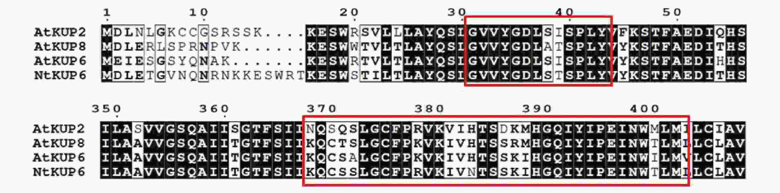 • 以烟草中烟100根部cDNA为模板,经PCR扩增,PCR产物的琼脂糖电泳检测结果如图1所示,获得了一条大小约2500bp的DNA片段。目的片段回收后测序,分析发现该段序列包含一个完整的开放阅读框(ORF),全长2355 bp,编码784个氨基酸。使用Clustal W将NtKUP6与NCBI中下载拟南芥KUP6亚家族蛋白进行比对分析,发现NtKUP6具有KUP/HAK/KT家族的保守区域GXXXGDXXXSPLY和KQXXALGCFPKXKIVHTSXKXXGQIYIPENWILM [26]图2)。