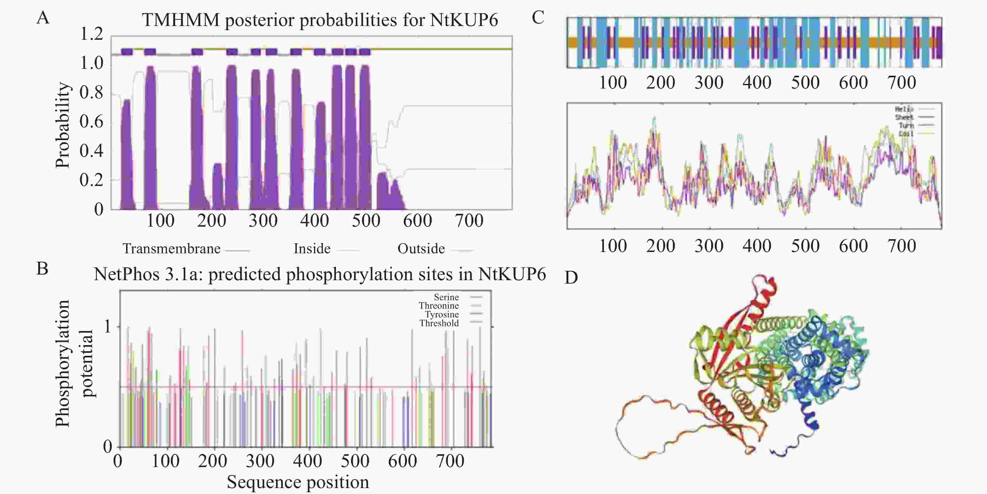 • 使用在线分析工具ProtParam对NtKUP6蛋白序列进行分析,该蛋白相对分子质量为87.9 kDa,理论等电点为8.76,不稳定系数为37.48,说明该蛋白属于稳定蛋白。NtKUP6蛋白包含了20种氨基酸,含量最高的是亮氨酸(11.2%),含量最低的是色氨酸(1.4%)。脂肪族氨基酸指数为107.86,具有高脂肪族性质。利用TMHMM-2.0对NtKUP6蛋白进行跨膜结构分析,结果显示,该蛋白共有11个跨膜结构域(图3-A),其中第2、3跨膜区之间存在1个胞质环(Loop)结构,C端具有较长的胞外区。利用Plant-mPLoc预测NtKUP6蛋白的亚细胞定位于细胞膜、液泡。利用NetPhos-3.1对NtKUP6蛋白进行磷酸化位点预测,共发现44个丝氨酸、23个苏氨酸和7个酪氨酸位点(图3-B)。二级结构分析显示,α-螺旋(40.82%,320个氨基酸)和无规则卷曲(41.71%,327个氨基酸)是构成NtKUP6蛋白的主要结构元件,延伸链(17.47%,137个氨基酸)则分散在整个蛋白中(图3-C)。进一步三级结构预测以V4VGN3.1.A柑橘(Citrus clementina)钾离子通道蛋白三级结构(AlphaFold DB model)为参考模型,相似度为82.63%,GMQE值为0.77,蛋白含有丰富的无规则卷曲和α-螺旋(图3-D),与二级结构预测结果一致。