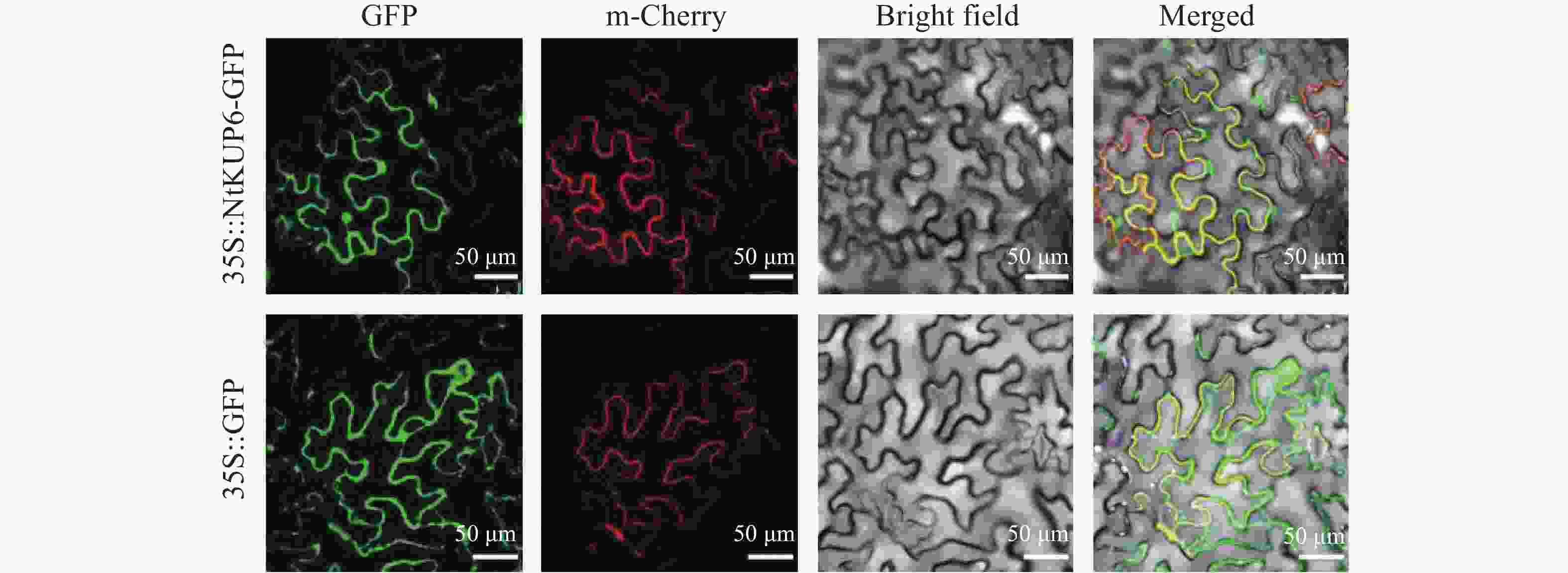 • 为明确NtKUP6蛋白的亚细胞定位,本研究构建了NtKUP6-GFP融合表达载体,转化农杆菌后注射本氏烟叶片,以细胞膜mCherry为marker,通过激光共聚焦显微镜观察绿色荧光信号,结果如图4所示,NtKUP6-GFP融合蛋白在细胞边缘呈现清晰的环状绿色荧光信号,与膜蛋白marker蛋白mCherry的红色荧光信号叠加后呈现黄色荧光,表明NtKUP6蛋白定位于细胞膜。