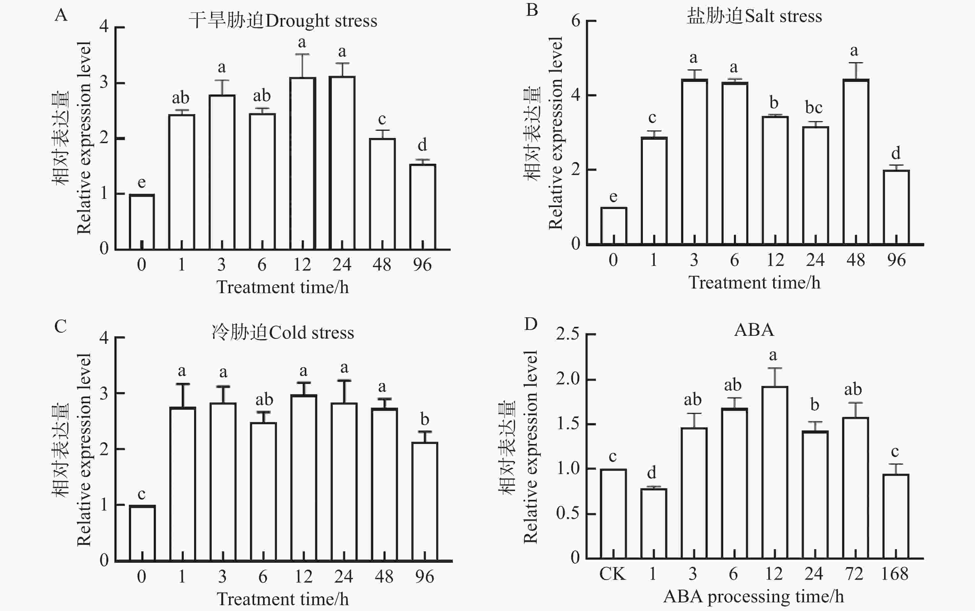 注:A. 干旱胁迫;B. 盐胁迫;C. 冷胁迫;D. ABA处理。NtKUP6基因在0 h的表达量设置为1.0。所有数据至少包含三个生物重复,每个生物重复中约有10株小幼苗。采用单因素方差分析(One-way ANOVA) 结合 Duncan 氏多重比较法分析差异显著性,不同字母表示P< 0.05的差异显著性