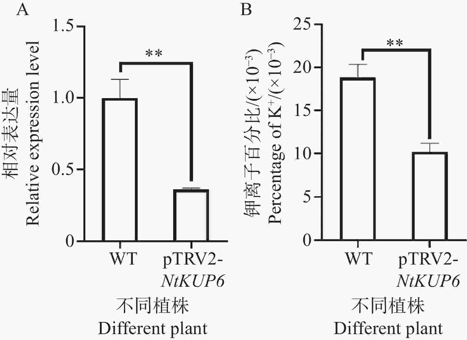 Note: A: Silencing efficiency of the NtKUP6 gene (the expression level of the NtKUP6 gene in the control plants was set at 1.0); B: Potassium ion content in the leaves of VIGS plants. All data included at least three biological replicates, and each biological replicate contained at least 3 plant leaves. The differences in significance were analyzed using the independent sample t-test, and ** indicates P< 0.01.