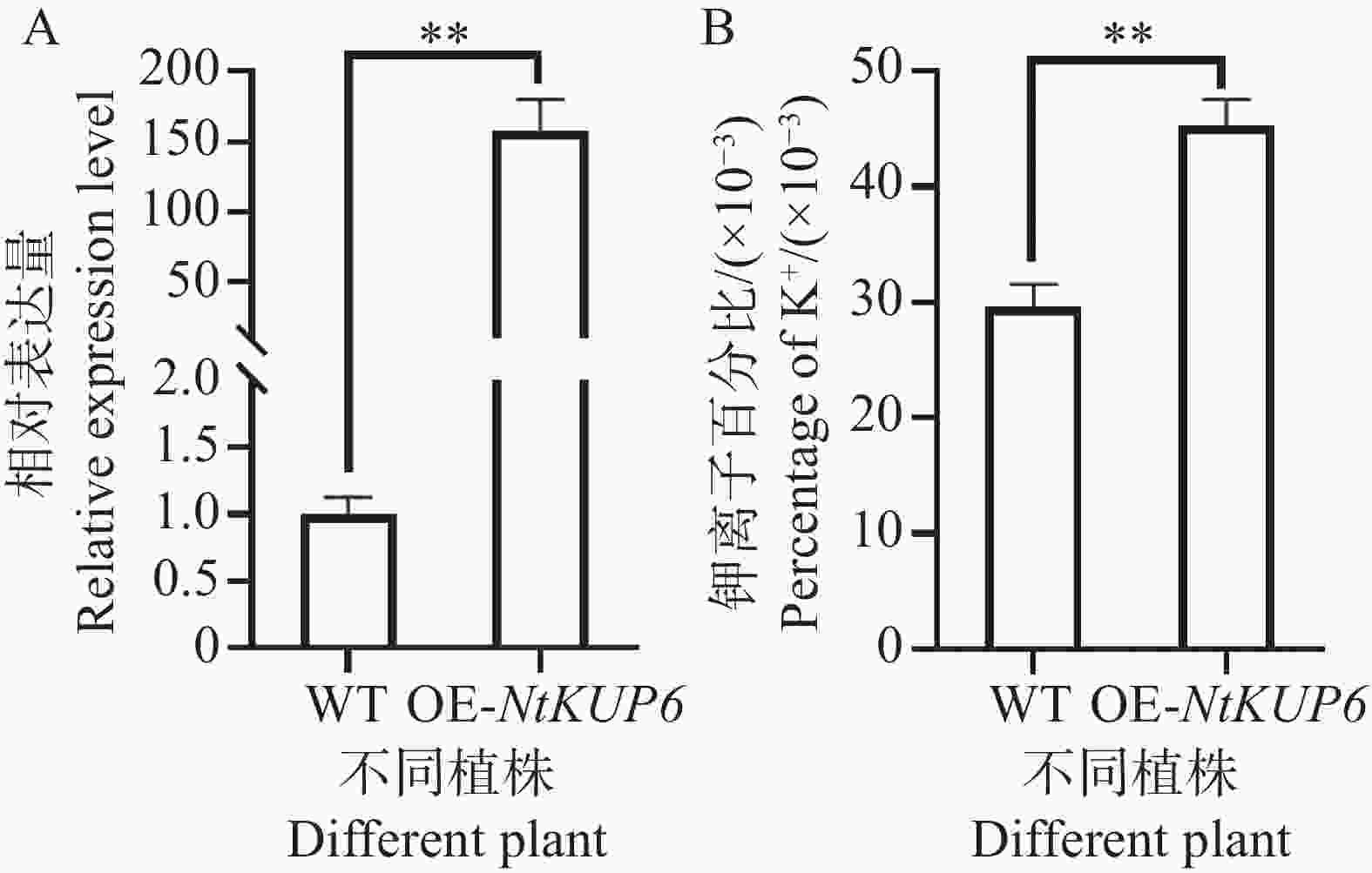 Note: A: The expression level of the NtKUP6 gene in the leaves of overexpressing plants (the expression level of the NtKUP6 gene in the control plants was set to 1.0); B: The potassium ion content in the leaves of overexpressing plants. All data include at least three biological replicates, and each biological replicate contains at least 3 plant leaves. The significance of differences was analyzed using the independent sample t-test, and ** represents P< 0.01.