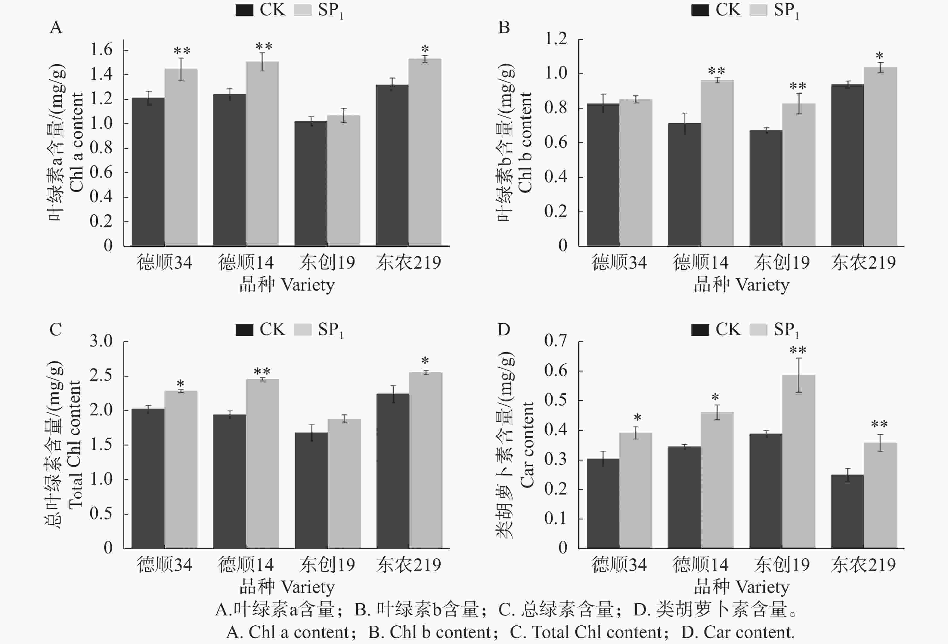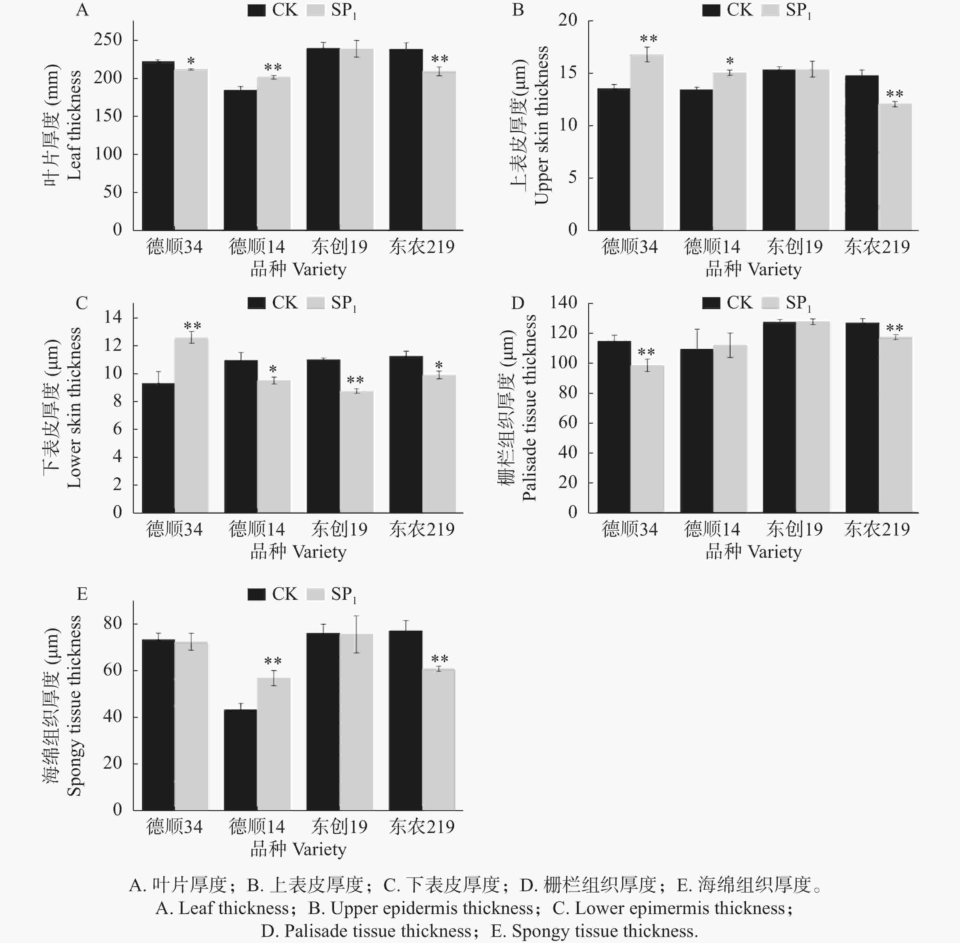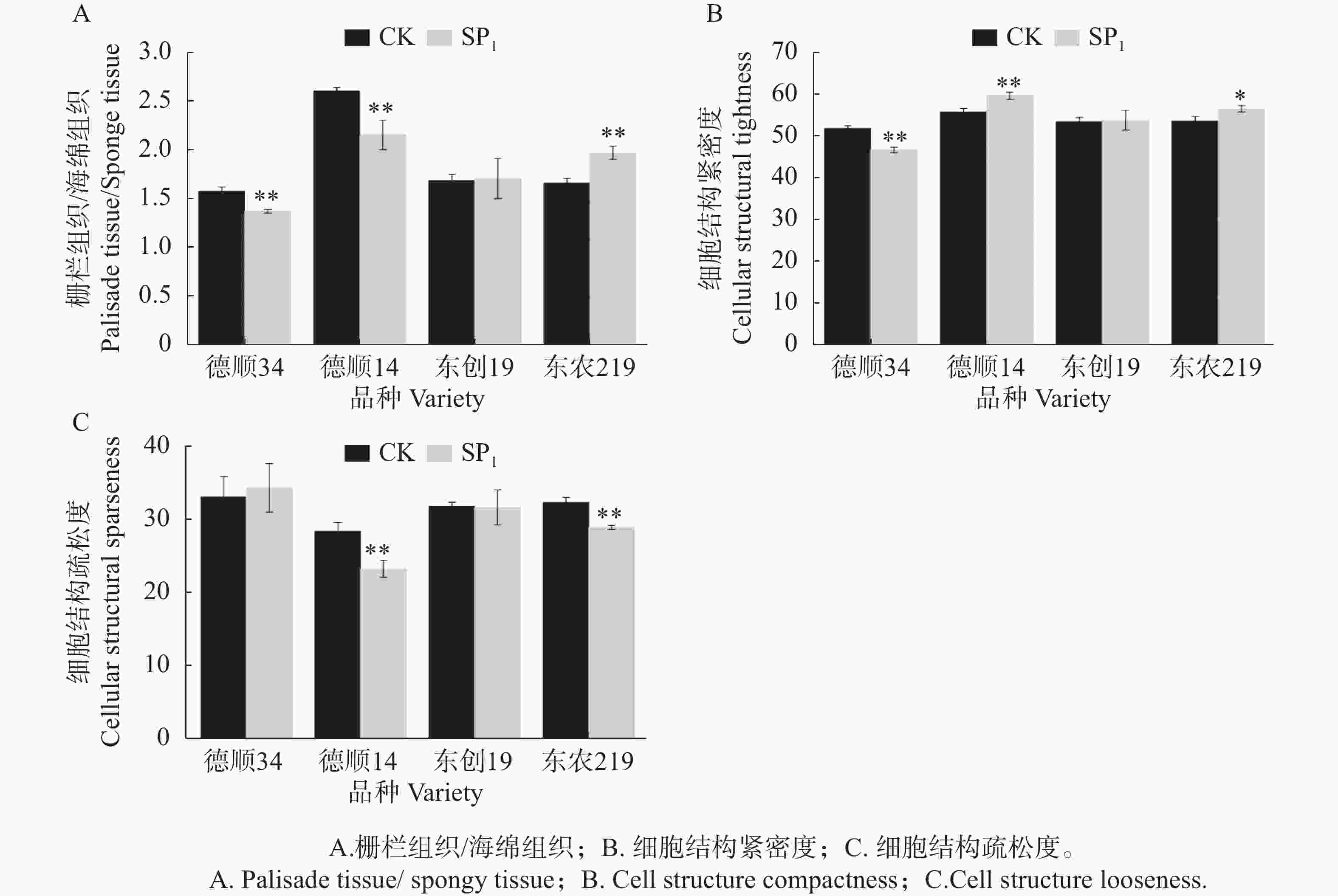 摘要: 为探讨航天诱变对不同品种大豆叶片光合色素及叶片显微结构的影响,本研究以“实践十九号”卫星搭载的4种优良大豆种子为研究对象。经航天诱变处理后返回地面进行SP1代地面种植,未经搭载的大豆种子为CK,对其光合色素以及叶片显微结构参数进行了测定和分析,结果表明:航天诱变后‘德顺34’、‘德顺14’、‘东农219’叶片总叶绿素含量显著高于对照12.91%~26.38%,而‘东创19’较对照未达显著水平。航天诱变后各品种类胡萝卜素含量显著高于对照 28.93%~51.40%。航天诱变后大豆各品种叶片细胞发生明显变化,航天诱变后‘德顺14’叶片细胞饱满,细胞排列整齐,胞间隙较小,叶片厚度、海绵组织厚度、细胞结构紧密度极显著高于对照、‘东农219’栅栏组织厚度/海绵组织厚度极显著高于对照,增加量达18.52%。‘德顺14’、‘东农219’细胞结构疏松度低于对照,比对照降低了10.64%~18.17%。本研究为大豆种质改良和品种选育提供基础材料,为大豆航天诱变育种的深化及该技术在豆科作物遗传改良中的应用提供了基础与参考。Abstract: Seeds of four superior soybean varieties carried by the "Shijian-19" satellite were selected for experiment to explore the effects of space mutation on the photosynthetic pigments and microscopic structure of leaves in different soybean varieties. After space mutation treatment, the plants of SP1 generation of these four soybean varieties were planted on the ground. The soybean seeds that were not carried by the satellete were used as the control (CK). The photosynthetic pigments and microscopic structure parameters of the leaves of the soybean plants under space mutation treatment and the control were measured and analyzed. The results showed that the soybean varieties Deshun 34, Deshun 14, and Dongnong 219 under space mutation were 12.91% to 26.38% higher, significantly higher in total chlorophyll content than the control. After space mutation, the carotenoid content of each variety was 28.93% to 51.40% higher, significantly higher than that of the control. After space mutation, the cell morphology, arrangement, and thickness of the leaves of each soybean variety changed significantly. The leaf cells of Deshun 14 were plump, arranged neatly, and had small intercellular spaces. After space mutation, the leaf thickness, spongy tissue thickness, and cell structure compactness of Deshun 14 soybeans were highly significantly higher than those of the control, and the palisade tissue thickness/spongy tissue thickness of Dongnong 219 was highly significantly higher than that of the control, with an increase of 18.52%. However, the cell structure looseness of Deshun 14 and Dongnong 219 was lower than that of the control, decreasing by 10.64% to 18.17%. This experiment provides basic materials for soybean germplasm improvement and variety selection, and offers a foundation and reference for further soybean space mutation breeding and the application of space mutagenesis in the genetic improvement of leguminous crops.