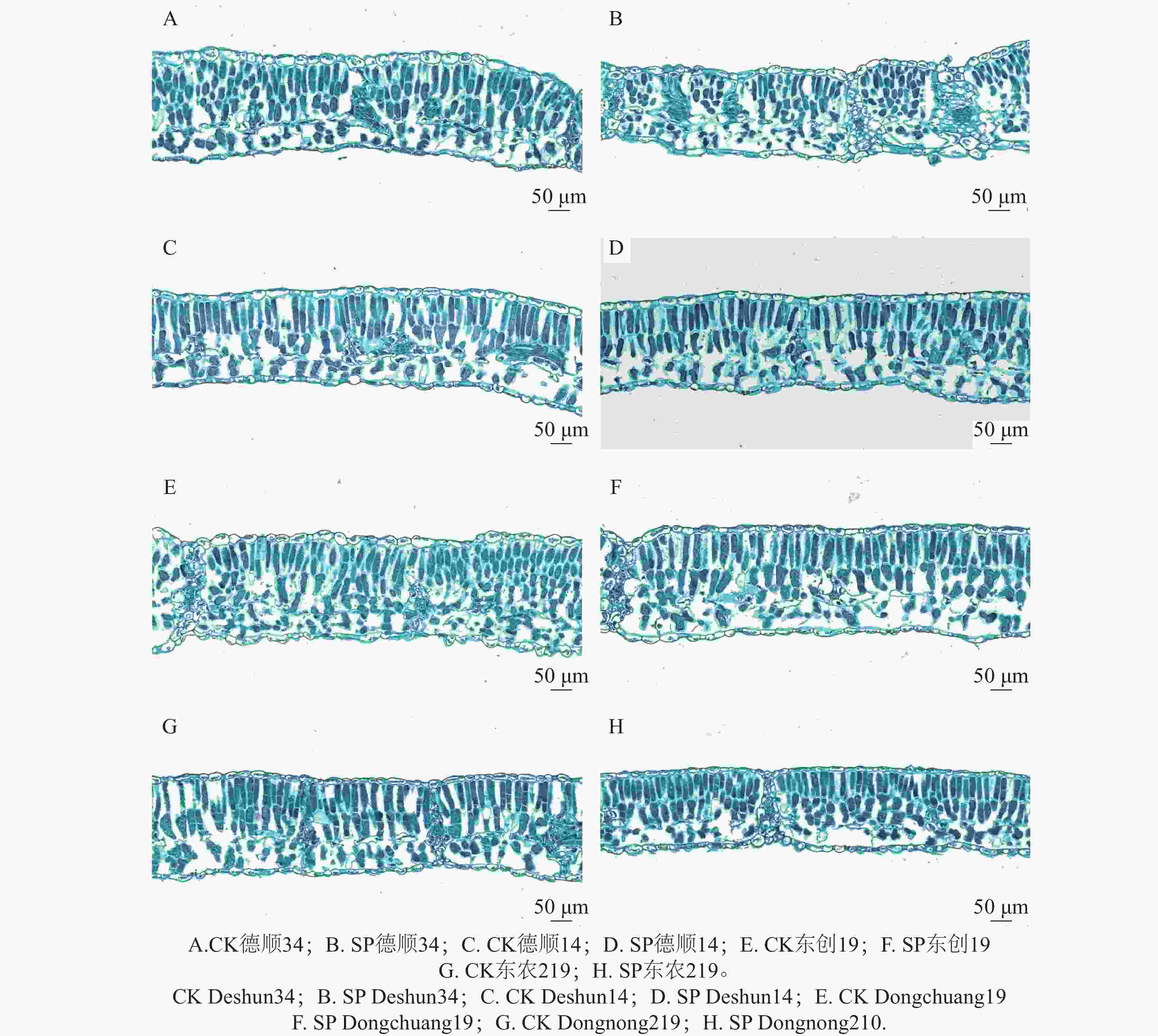 如图2可见,经过航天诱变后各品种大豆叶片细胞形态、排列方式较对照明显变化。‘德顺34’叶片的栅栏组织和海绵组织分界明显,细胞排列相对整齐,形态饱满,结构清晰。栅栏组织细胞呈近圆柱形,层数较为稳定,海绵组织细胞虽排列不规则但间隙发达。航天诱变后‘德顺34’叶片各部分细胞出现皱缩,结构模糊,栅栏组织和海绵组织的分界不明显,细胞排列混乱且分散。整体形态皱缩,细胞饱满度下降,与对照相比,细胞形态和排列方式发生了显著变化。‘德顺14’栅栏组织由4~5层短圆柱形细胞组成,细胞间隙较大,排列较规则。整体清晰,分界明确。经航天诱变后栅栏组织由2~3层圆柱状细胞组成,排列较整齐且间隙较小,细胞饱满,海绵组织细胞呈近椭圆形。‘东创19’细胞较大且排列较疏松;海绵组织排列不规则、形状不一,间隙发达;栅栏组织和海绵组织分界明显。经航天诱变后栅栏组织细胞结构清晰,呈长圆柱形,排列有序,间隙发达;海绵组织细胞形状多样,分布混乱。‘东农219’叶片上下表皮细胞呈近椭圆形,且饱满;栅栏组织和海绵组织均为近圆柱形细胞,排列整齐,间隙较小。经过航天诱变后叶片细胞皱缩,形态模糊,排列混乱且分散。