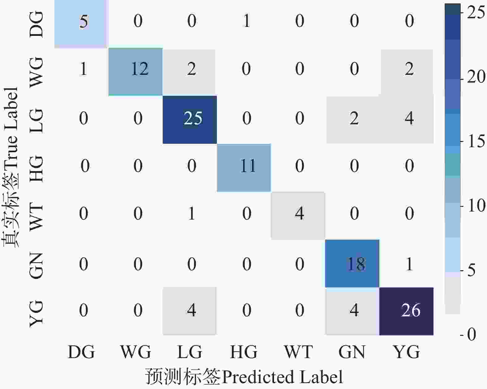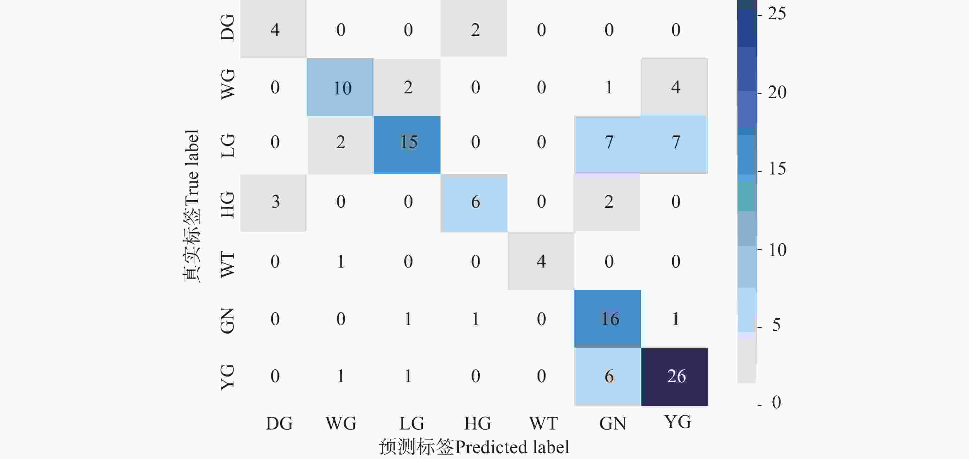 注:矩阵中数值表示对应类别样本数量,颜色深浅表示样本数大小,颜色越深表示样本数越多。对角线元素代表被正确分类的样本,非对角线元素表示不同颜色类别之间的误判情况;DG:墨绿色,WG:白绿色,LG:浅绿色,HG:深绿色,WT:白色,GN:绿色,YG:黄绿色。下同。