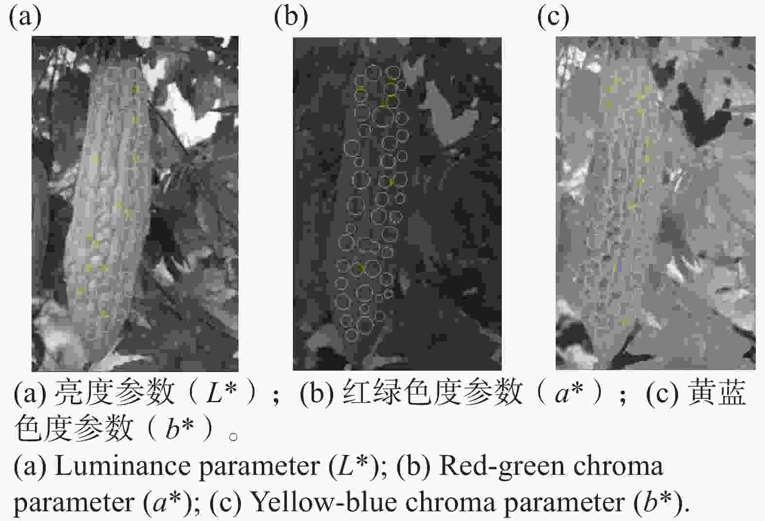 ImageJ作为一种成熟的开源图像分析软件,已被广泛应用于果蔬颜色等表型参数的提取与分析,在果蔬颜色分类与品质评价研究中具有良好的适用性和可靠性[12]。采用ImageJ软件对采集的苦瓜果实图像进行颜色特征提取。针对每张果实图像,在果皮表面选取30~40个避光测量点,测量点均匀分布于果皮上、中、下3个区域,并刻意避开果柄、病斑及机械损伤部位,以降低非目标区域对颜色测定结果的干扰。在此基础上,提取各测量点在CIE Lab颜色空间中的亮度(L*)、红绿色度(a*)和黄蓝色度(b*)参数(图2)。