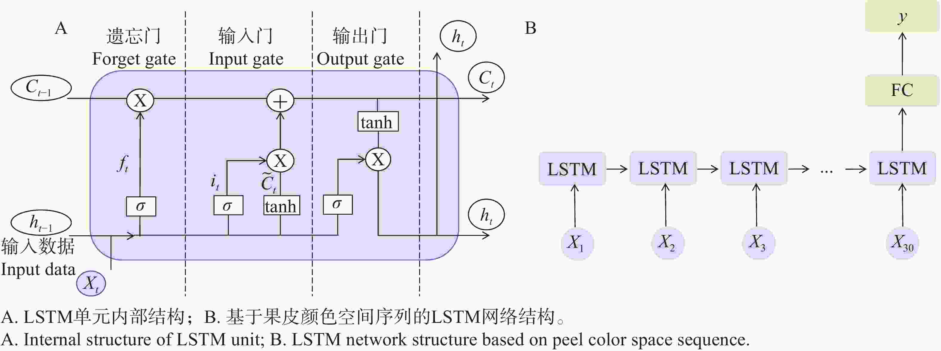 $$ {{f}}_{{t}}{=σ(}{{W}}_{{f}}{∙[}{{h}}_{{t}}{-1,}{{x}}_{{t}}{]+}{{b}}_{{f}}{)} {,} $$ (2) $$ {{i}}_{{t}}{=σ(}{{W}}_{{i}}{∙[}{{h}}_{{t}}{-1,}{{x}}_{{t}}{]+}{{b}}_{{i}}{)} {,} $$ (3) $$ {\tilde{{C}}}_{{t}}=\tan {h(}{{W}}_{{C}}{∙[}{{h}}_{{t}}{-1,}{{x}}_{{t}}{]+}{{b}}_{{C}}{)} {,} $$ (4) $$ {{C}}_{{t}}={{f}}_{{t}}{∙}{{C}}_{{t}}{-1+}{{i}}_{{t}}\cdot {\widetilde{{C}}}_{{t}}{} {,} $$ (6) $$ {{o}}_{{t}}{=σ(}{{W}}_{{o}}{∙[}{{h}}_{{t}}{-1,}{{x}}_{{t}}{]+}{{b}}_{{o}}{)} {,} $$ (7) $$ {{h}}_{{t}}={{o}}_{{t}}{∙}\tan {h(}{{C}}_{{t}}{)} {,} $$ (8) 如图3-A表示,$ {{x}}_{{t}} $表示第t个果皮测量点的输入特征向量(即Lab值),$ {{{\mathrm{h}}}}_{{t-1}} $和$ {\text{h}}_{{t}} $分别表示前一时间步与当前时间步的隐藏状态输出,$ {{C}}_{{t-1}} $和$ {{C}}_{{t}} $分别表示前一时间步与当前时间步的单元记忆状态;$ {{f}}_{{t}} $、$ {{i}}_{{t}} $和$ {{o}}_{{t}} $分别表示遗忘门、输入门和输出门的激活结果;$ {\sigma (\cdot)} $为Sigmoid激活函数,$ tan \text{h(∙)} $为双曲正切函数;$ {{W}}_{{f}} $、$ {{W}}_{i} $、$ {{W}}_{c} $、$ {{W}}_{o} $分别为遗忘门、输入门、候选记忆单元和输出门对应的权重矩阵,$ {{b}}_{{f}} $、$ {{b}}_{i} $、$ {{b}}_{c} $、$ {{b}}_{o} $为相应的偏置项。该门控结构使得LSTM能够在建模过程中动态保留对颜色判别具有贡献的关键测量点信息,同时削弱噪声点或局部异常值的影响,从而提高模型对果皮颜色类别的整体判别能力。如图3-B所示,将单个果实果皮上连续获取的30个颜色测量点视为一维空间序列(X1~X30),每个测量点包含CIE Lab颜色空间中的L、a、b 3个特征值。序列特征依次输入LSTM网络进行递归建模,最终通过全连接层(FC)输出果皮颜色类别(y)预测结果。