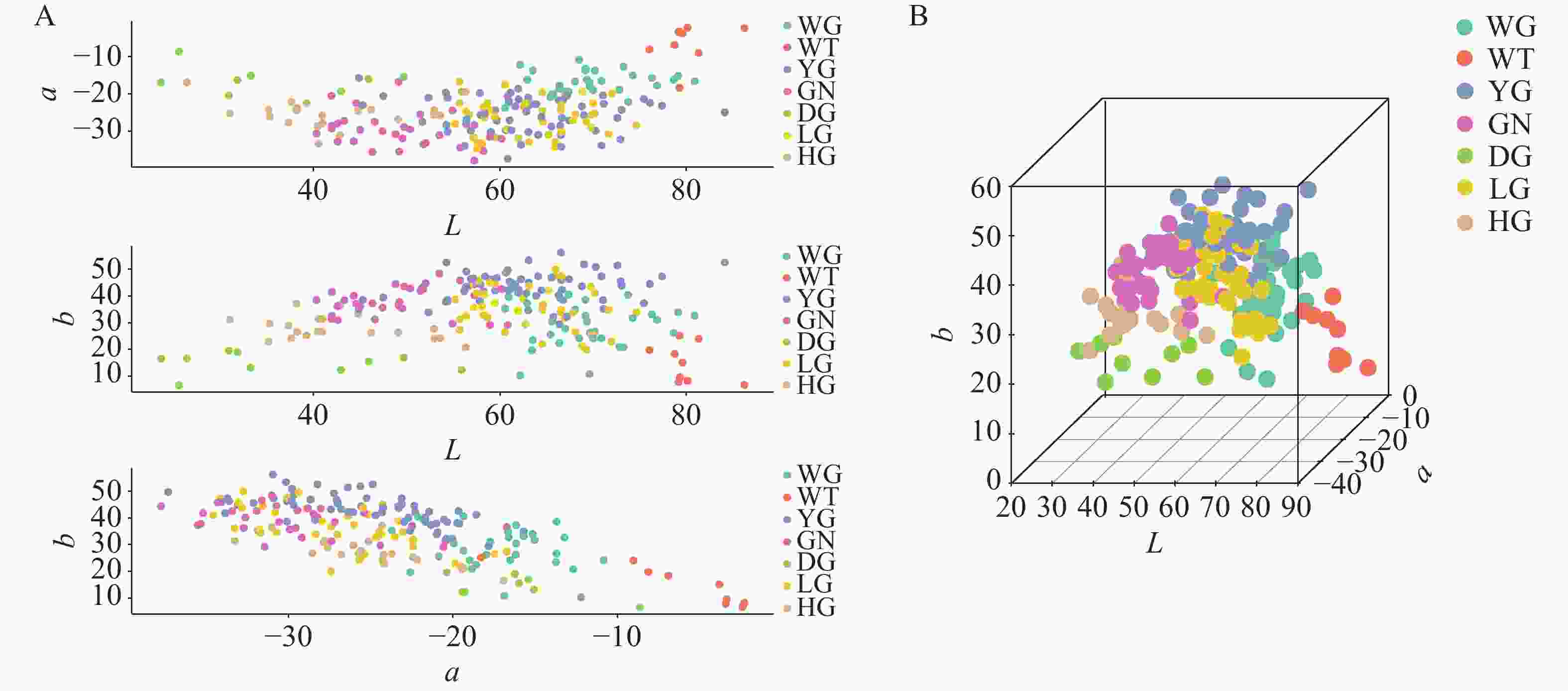 如图4-A所示,在以L–a、L–b及a–b为坐标轴的二维特征平面散点图中,白色与墨绿色的分布区分度较高,而浅绿色、绿色和黄绿色等相邻类别在局部区域存在明显重叠,表明苦瓜果皮颜色具有明显的连续性特征。图4-B显示,各颜色类别在三维空间中整体呈现一定的分层结构,与二维分析结果保持一致,但不同类别之间的空间边界并非完全清晰。