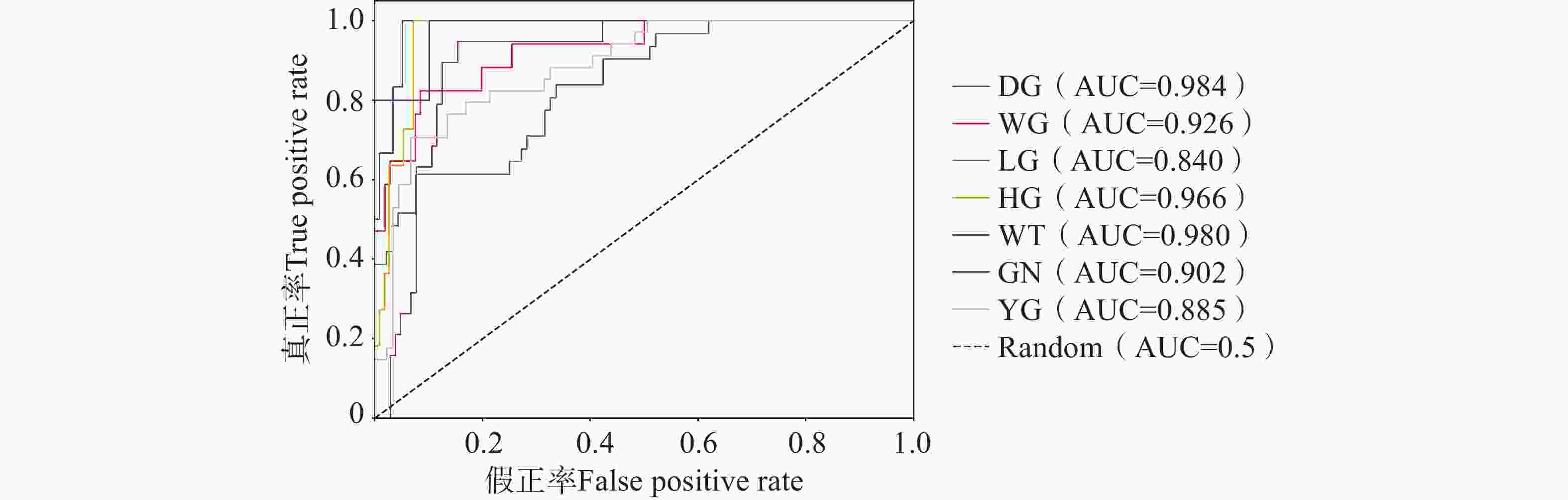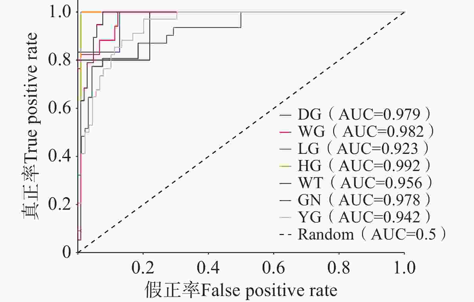 注:曲线下方面积(AUC)用于评价各颜色类别的分类判别能力;DG:墨绿色,WG:白绿色,LG:浅绿色,HG:深绿色,WT:白色,GN:绿色,YG:黄绿色;Random 为随机分类器。下同。