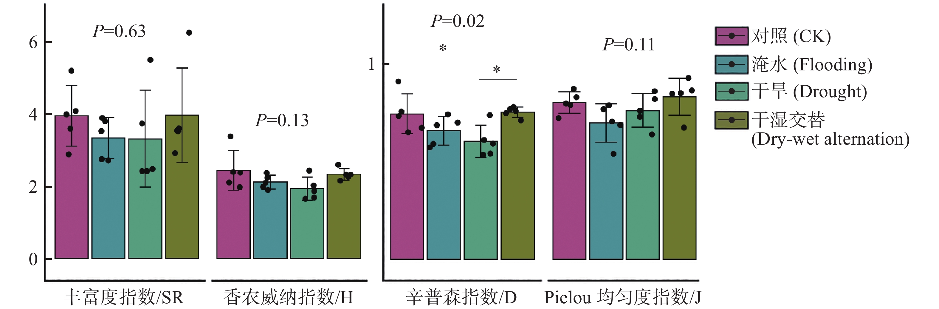 Extreme climate-driven alterations in precipitation patterns lead to frequent heavy rainfall, drought, and dry-wet alternation events, and hence significantly impact plant growth and soil community stability. Cinnamomum camphora, a crucial economic species for greening, is particularly sensitive to these environmental changes. Understanding the influence of altered precipitation patterns on the growth of C. camphora and its associated soil systems holds significant implications for cultivation, management and planting strategies in the context of global extreme climate change. A pot experiment was designed to simulate precipitation patterns to cultivate C. camphora seedlings to determine the soil physicochemical properties (pH, soil organic carbon, and soil total nitrogen) and microbial biomass in the pot soil. The seedlings were treated with stress of flooding, drought, or wet-dry alternation, with no stress as a control. Results indicated that the three stress treatments notably increased soil total nitrogen content (P<0.001 as against the control. Soil total phospholipid fatty acids and bacterial biomass were significantly higher in the stress treatment of flooding or dry-wet alternation compared to the drought stress, whereas fungal biomass remained relatively stable under stress conditions. Additionally, the microbial Simpson index was significantly lower under the drought stress treatment compared to the other treatments. In conclusion under extreme stress events the growth of C. camphora was inhibited, and the soil microorganisms become more constrained by carbon substrates. The drought stress had a more pronounced impact on soil physiochemical properties and microbial communities compared to the stress treatments of flooding and dry-wet alternation. Under the extreme climate events the coupling of microorganisms and plants should be enhanced to improve the ability of plants to adapt to extreme climate, thereby preserving the stability and functionality of the soil ecosystem and benefiting plant recovery.