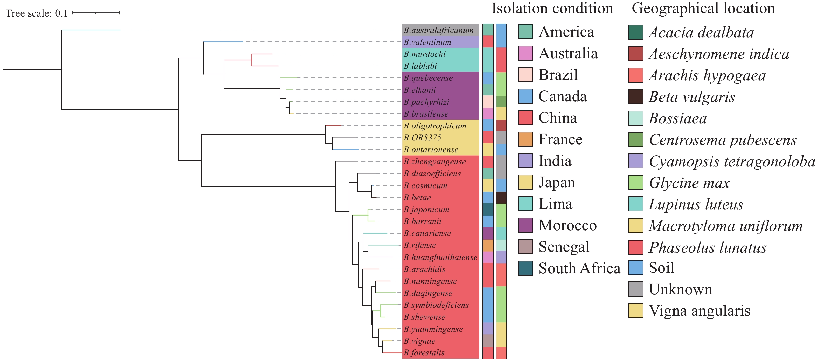 To explore the evolutionary history of the Bradyrhizobium and its plastic degradation-related gene the hydroxylase gene CYP450, and to understand the mechanisms by which the genus acquires its plastic degradation potential. In this study, 28 fully assembled strains of Bradyrhizobium were collected to investigate the evolution and dissemination of Bradyrhizobium and their hydroxylase genes CYP450 through comparative genomic and phylogenetic analyses. The results revealed that, compared to the core genes, the unique and accessory genes of Bradyrhizobium exhibited an increase in functions related to plastic degradation, such as membrane transport, xenobiotic biodegradation and metabolism, lipid metabolism, and signal transduction. Bradyrhizobium has an open pan-genome, enabling it to acquire genes from other species, adapt to new environments, and evolve new functions. Analysis of the flow of the hydroxylase gene CYP450 in bacteria and archaea revealed that Bradyrhizobium likely acquired hydroxylase gene CYP450 from the Actinobacteria phylum through horizontal gene transfer, thus gaining the potential for plastic degradation.