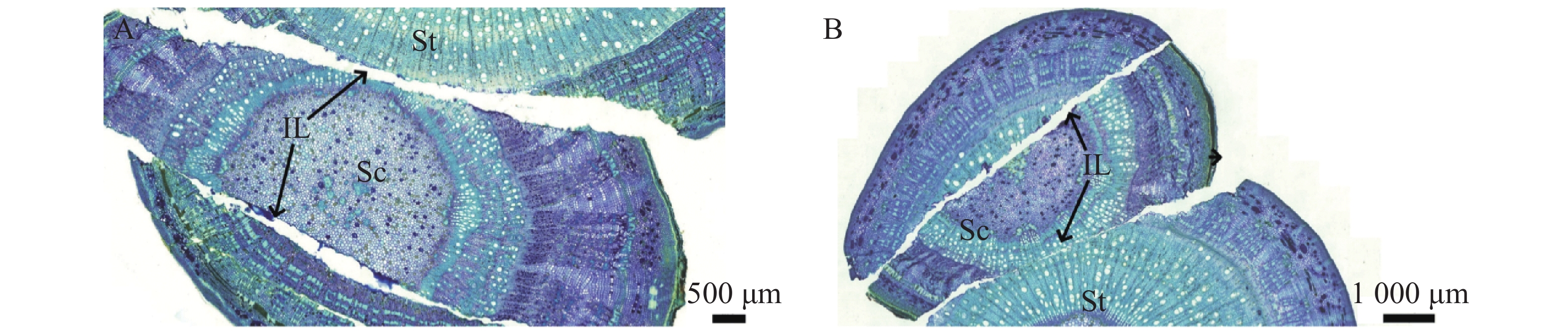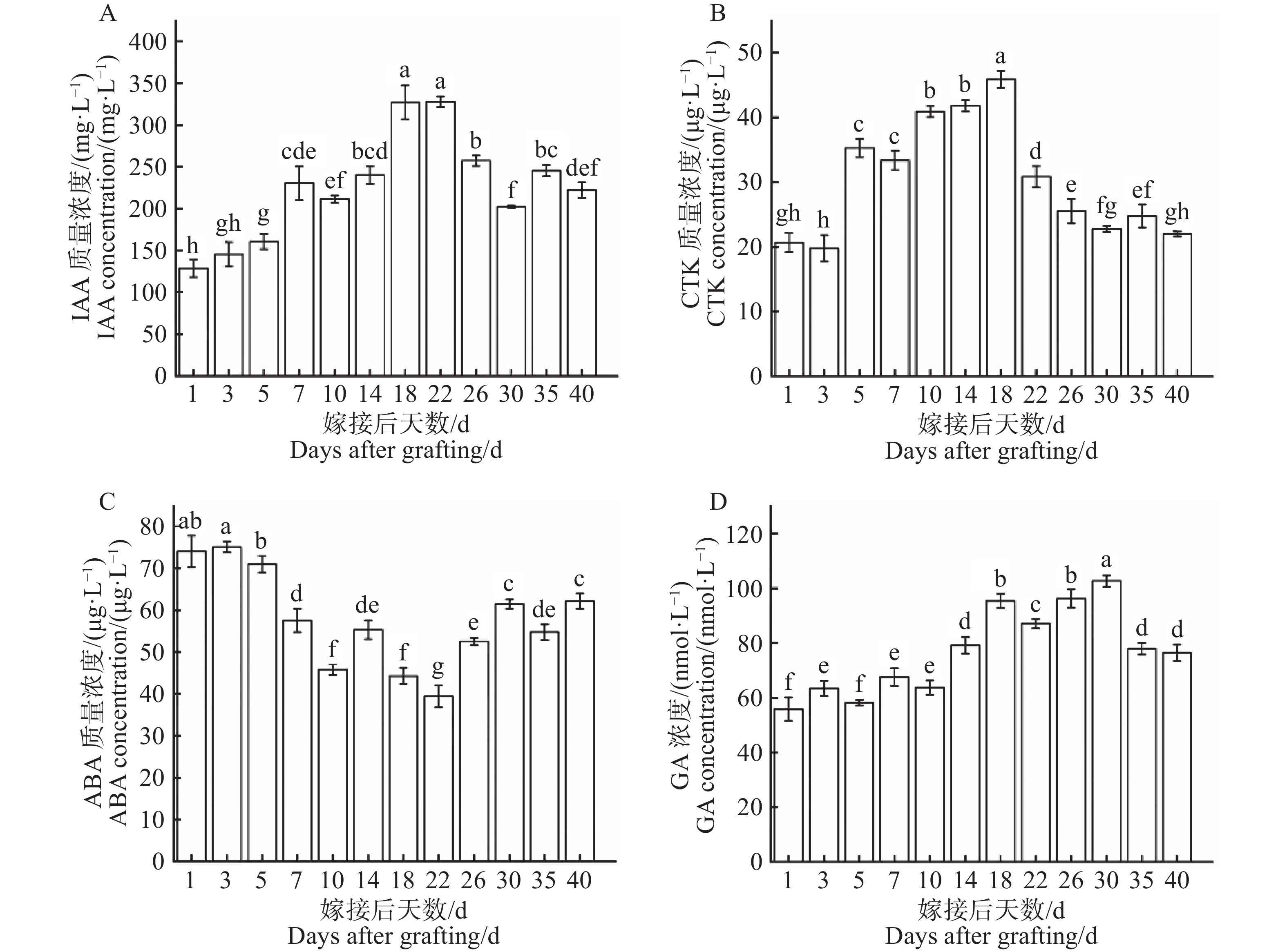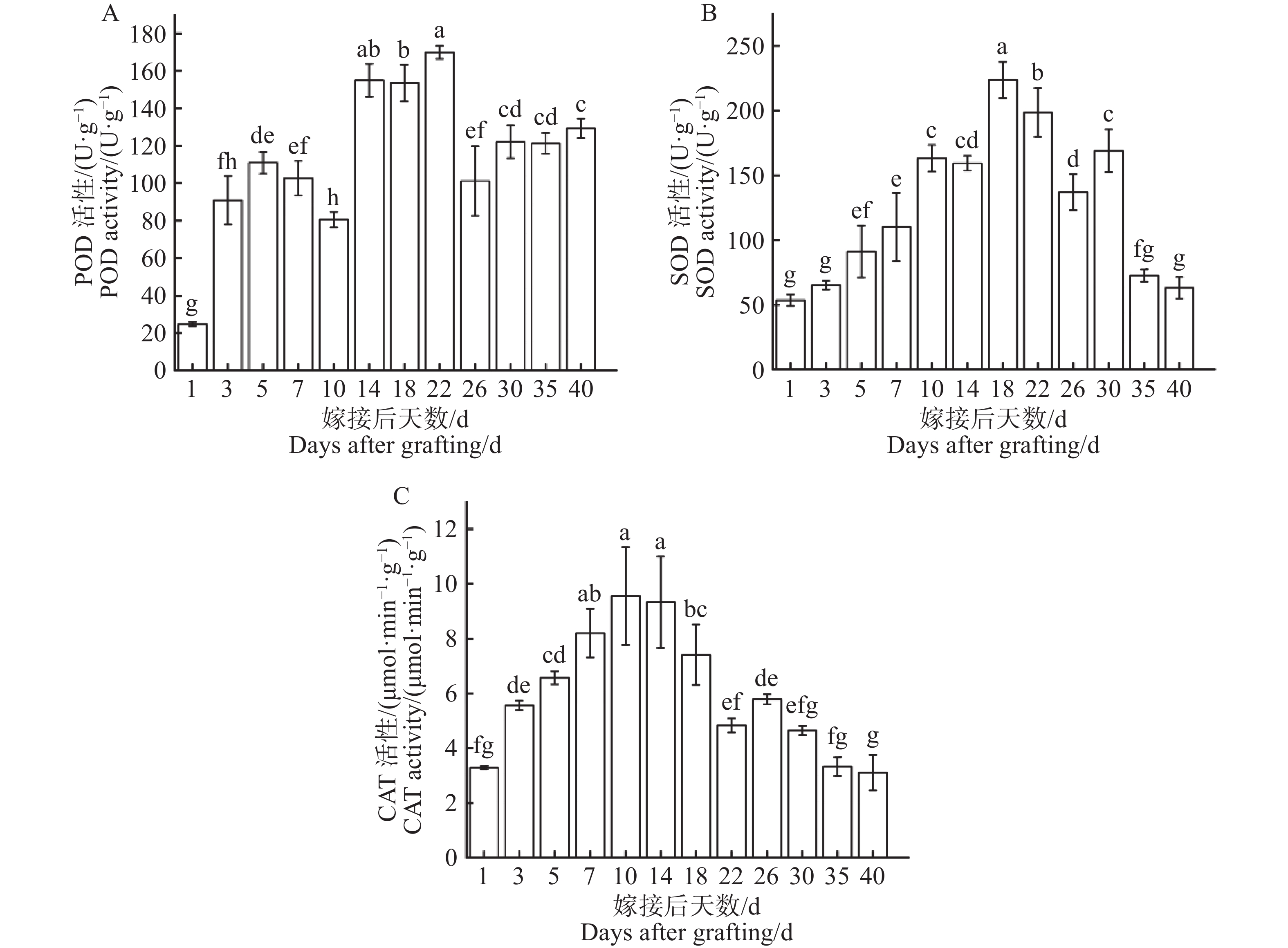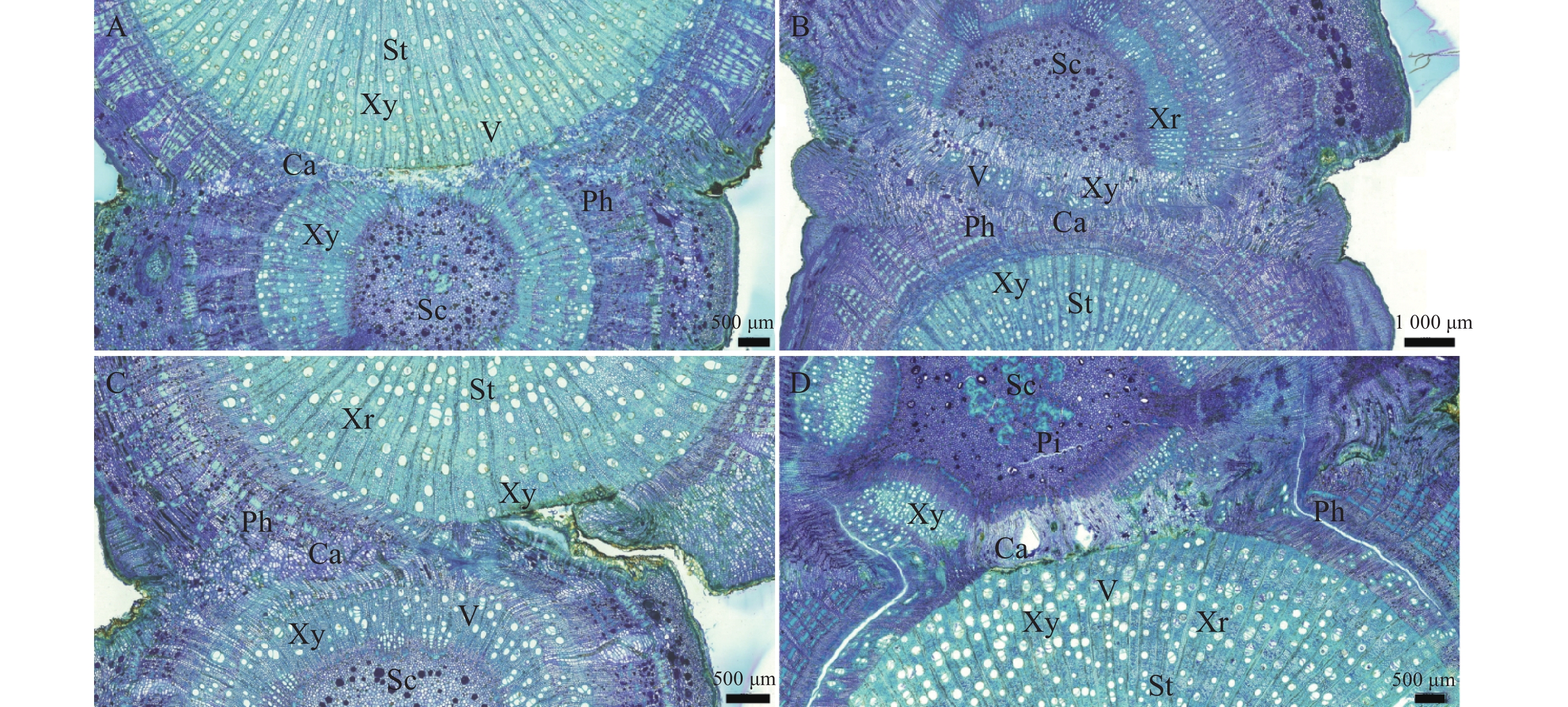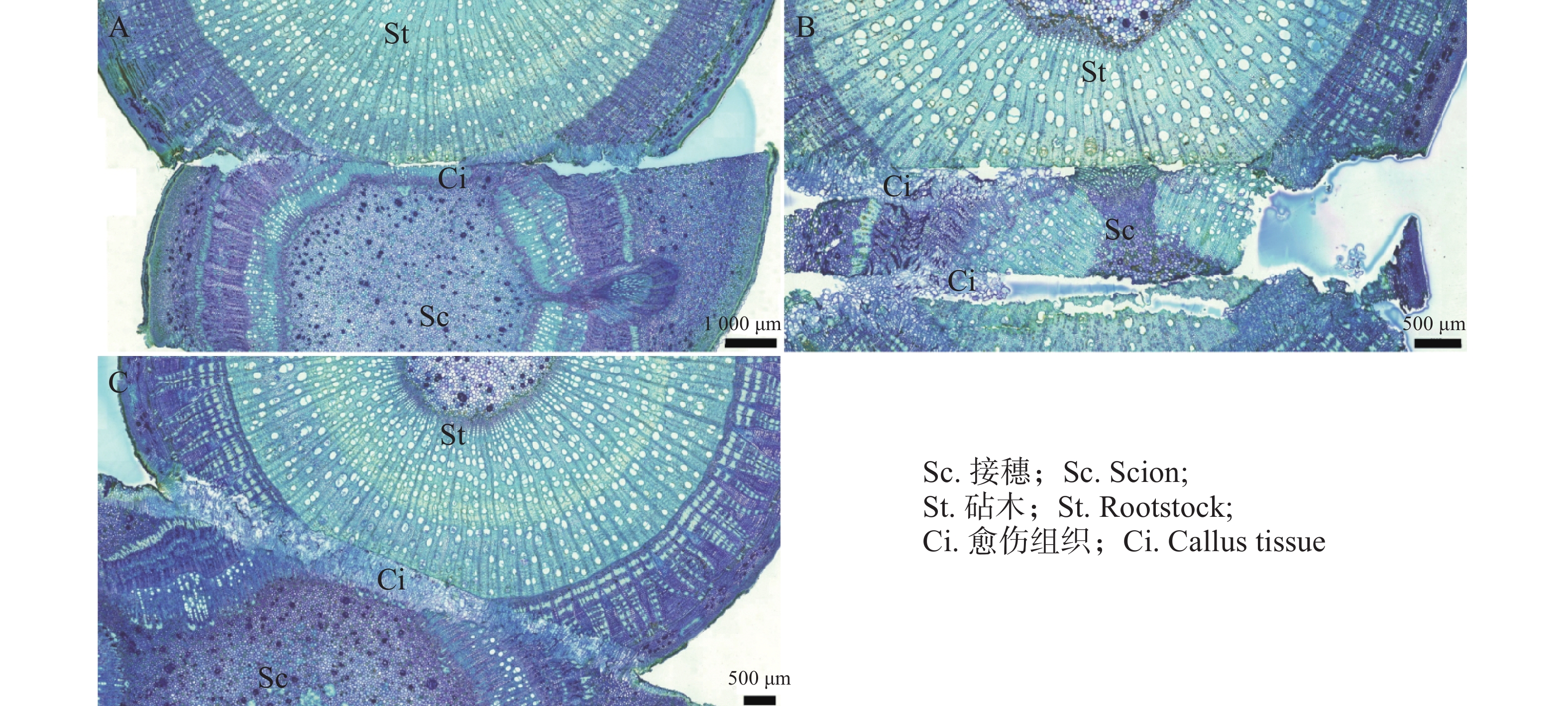 To investigate the grafting compatibility and healing mechanisms of Bombax ceiba, one-year-old branches of Bombax ceiba were grafted onto Ceiba speciosaby using the cleft grafting method, and graft union tissues were collected at various post-grafting stages for histological observation via hard tissue sectioning to analyze structural changes during the healing of graft union. Physiological activities of soluble sugars, soluble proteins, peroxidase (POD), catalase (CAT), and superoxide dismutase (SOD) were quantitatively assessed, while endogenous hormone levels at the graft union were determined using enzyme-linked immunosorbent assay (ELISA).The healing process of the graft is divided into four distinct stages: isolation layer formation stage (Day 0–3), callus formation stage (Day 3–10), callus differentiation and connection stage (Day 10–22), and cambial connection and vascular tissue differentiation stage (Day 22–40). The first 22 days after grafting are critical for determining whether a viable graft union can form, and the first 40 days are crucial for graft survival. The activities of POD, SOD, and CAT initially increased and then decreased during the healing process, with their peak activities observed during the callus differentiation and connection stage. The hormones IAA, GA, and CTK promoted cell division and vascular tissue formation. The concentrations of IAA and CTK peaked during the callus differentiation and connection stage, while GA reached its highest concentration during the cambial connection and vascular tissue differentiation stage. ABA levels showed a decreasing trend followed by an increase, with ABA inhibiting the proliferation of callus cells.