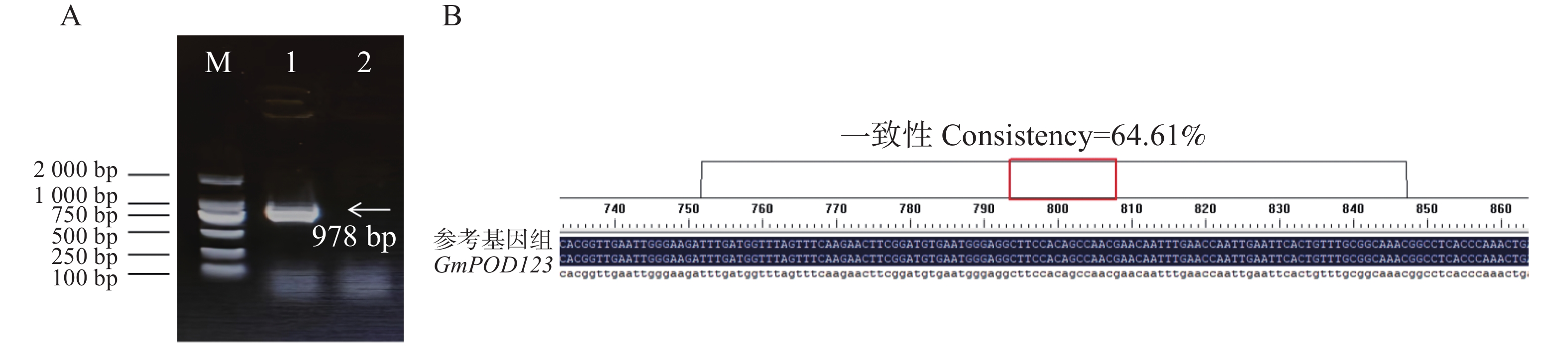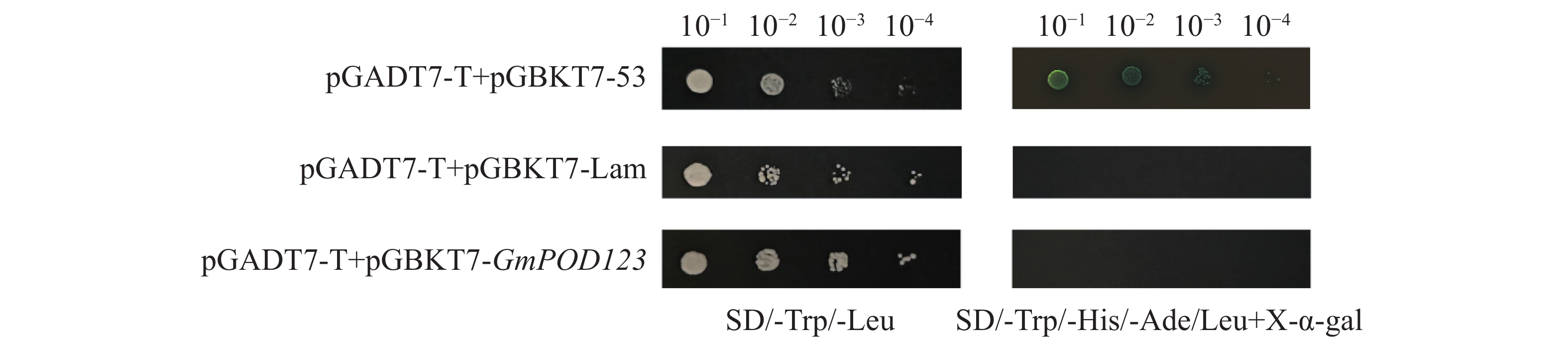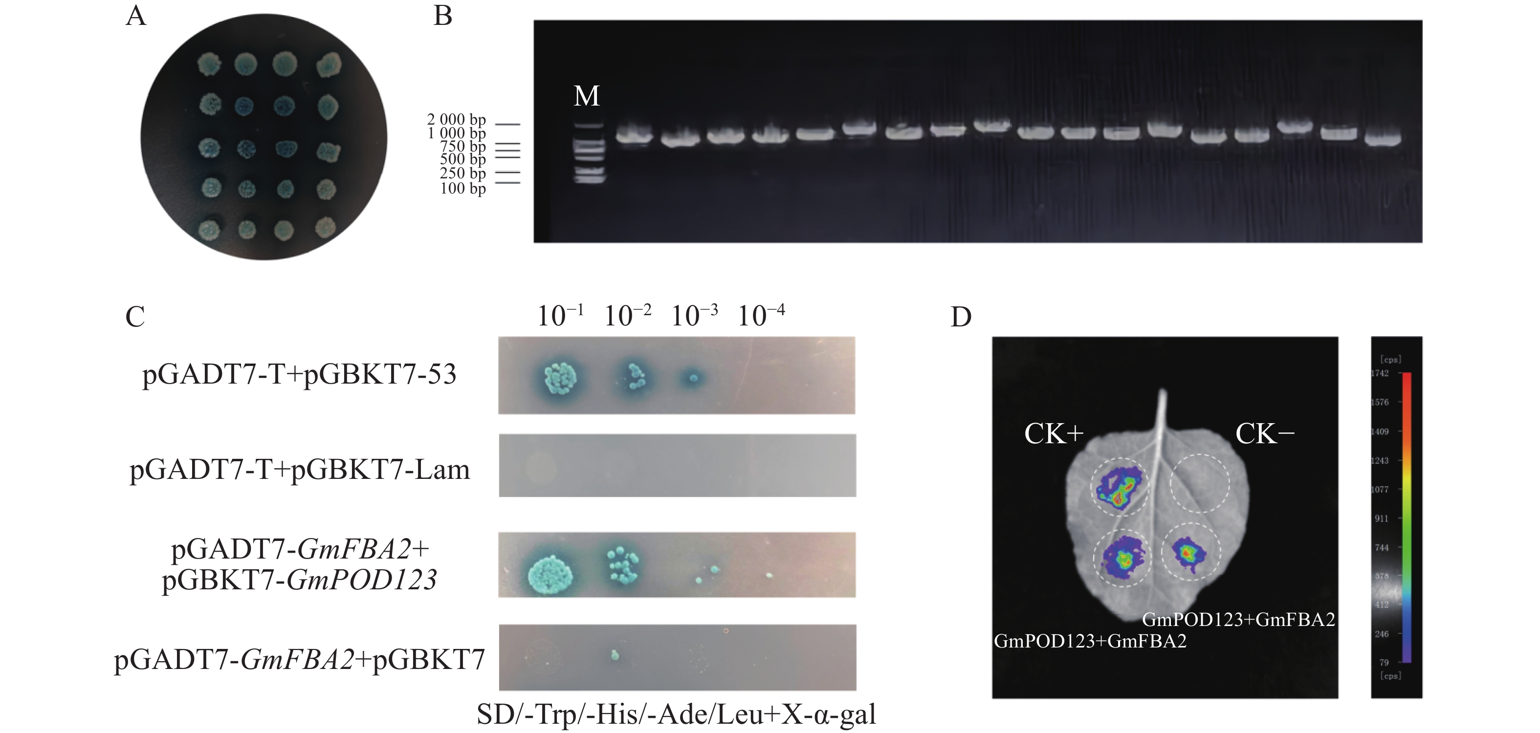 To further explore the key genes regulating drought resistance in soybean, the peroxidase gene GmPOD123, which is significantly induced under drought stress, was screened based on previous transcriptomic analyses (RNA-Seq) of soybean leaves under drought stress. An expression analysis of the soybean GmPOD123 gene under drought stress was performed to identify whether GmPOD123 is involved in response to drought stress, and the results showed that GmPOD123 was significantly up-regulated after 3 h stress treatment. Moreover, phenotype identification of transgenic Arabidopsis plants of overexpressing GmPOD123 showed that overexpression of GmPOD123 in Arabidopsis could increase the drought tolerance, which was compared to wild type Arabidopsis. To further explore the drought-resistant molecular mechanism of GmPOD123, fructose-1,6-bisphosphate aldolase (GmFBA2), an interacting protein of GmPOD123, was screened from the soybean cDNA yeast library by Mating, and its interaction with GmPOD123 was identified by yeast two-hybrid system and luciferase complementation assay (LCA). In summary, GmFBA2 may influence ROS levels by interacting with GmPOD123, thereby regulating soybean drought resistance.