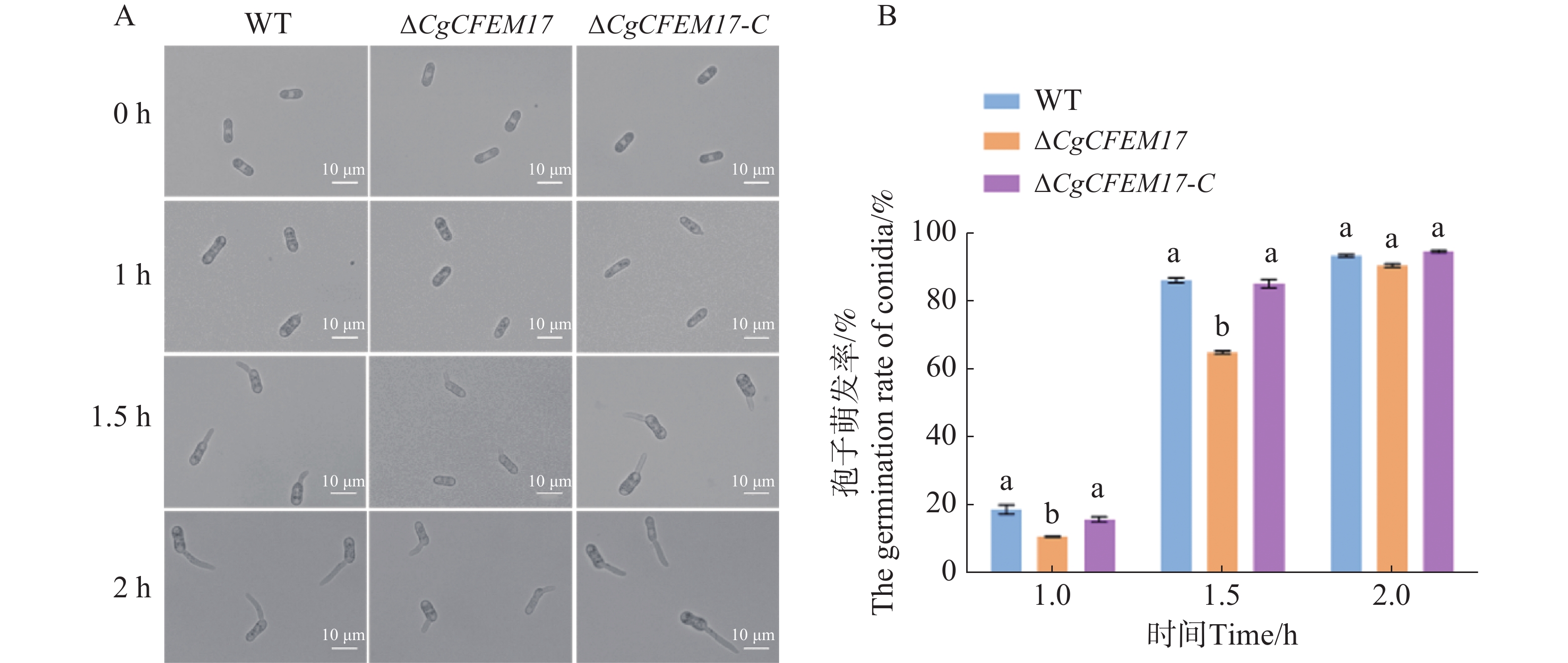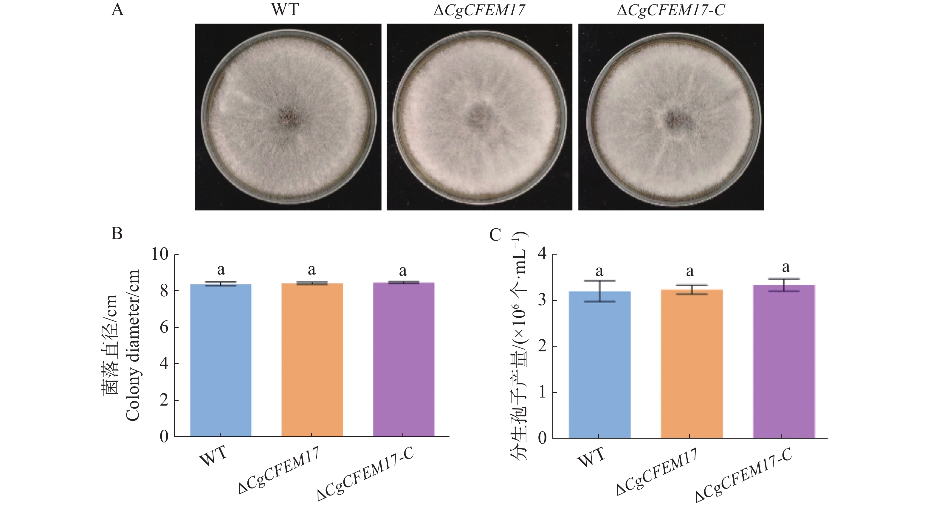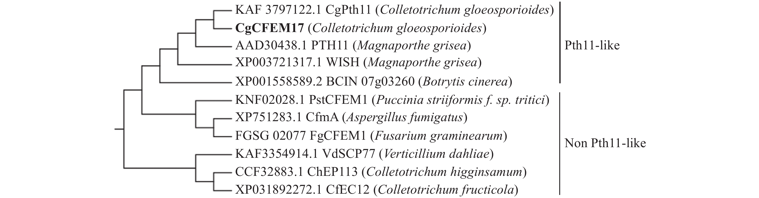 Colletotrichum gloeosporioides is the main pathogen causing anthracnose of rubber tree (Hevea brasiliensis). The common in fungal extracellular membrane (CFEM) domain is a unique motif of fungi, and the proteins containing CFEM and transmembrane domains are defined as Pth11-like CFEM protein, which plays important roles in regulating the development and pathogenicity of pathogenic fungi. In order to study the pathogenesis of C. gloeosporiorides, a gene encoding Pth11-like CFEM protein was screened from the transcriptome of C. gloeospriorides and named as CgCFEM17. The encoding region of the gene CgCFEM17 is 1341bp in length and encodes a peptide with 446 amino acids. Bioinformatics analysis showed that the N-terminus of CgCFEM17 has a signal peptide with 26 amino acids and a conserved CFEM domain, and the C-terminus contained six transmembrane domains. The knockout mutant strain (∆CgCFEM17) and complementary strain (∆CgCFEM17-C) of the gene CgCFEM17 were constructed to analyze the function of CgCFEM17. The results showed that the conidium germination and invasion structure of ∆CgCFEM17 were delayed compared with the wild type and complementary strain, but the colony growth rate, conidiation, appressorium formation rate, and morphogenesis were not changed. These results indicated that the gene CgCFEM17 could affect the pathogenicity of C. gloeosporioides on rubber tree by regulating the germination process of conidia and delaying the formation of infection structure, which lays a theoretical foundation for exploring of the pathogenic mechanism of C. gloeosporioides and establishing of a new control strategy for anthracnose of rubber trees.
