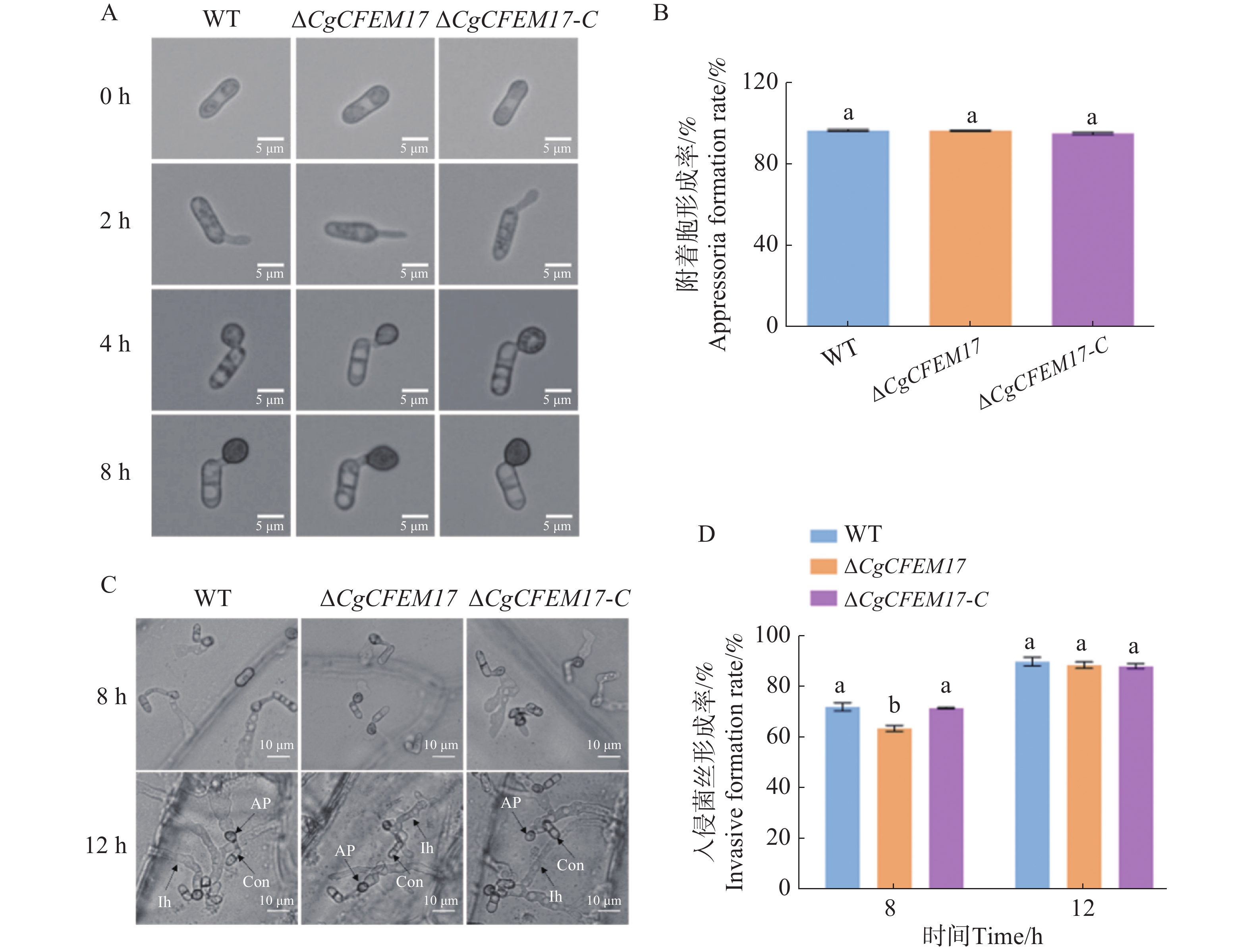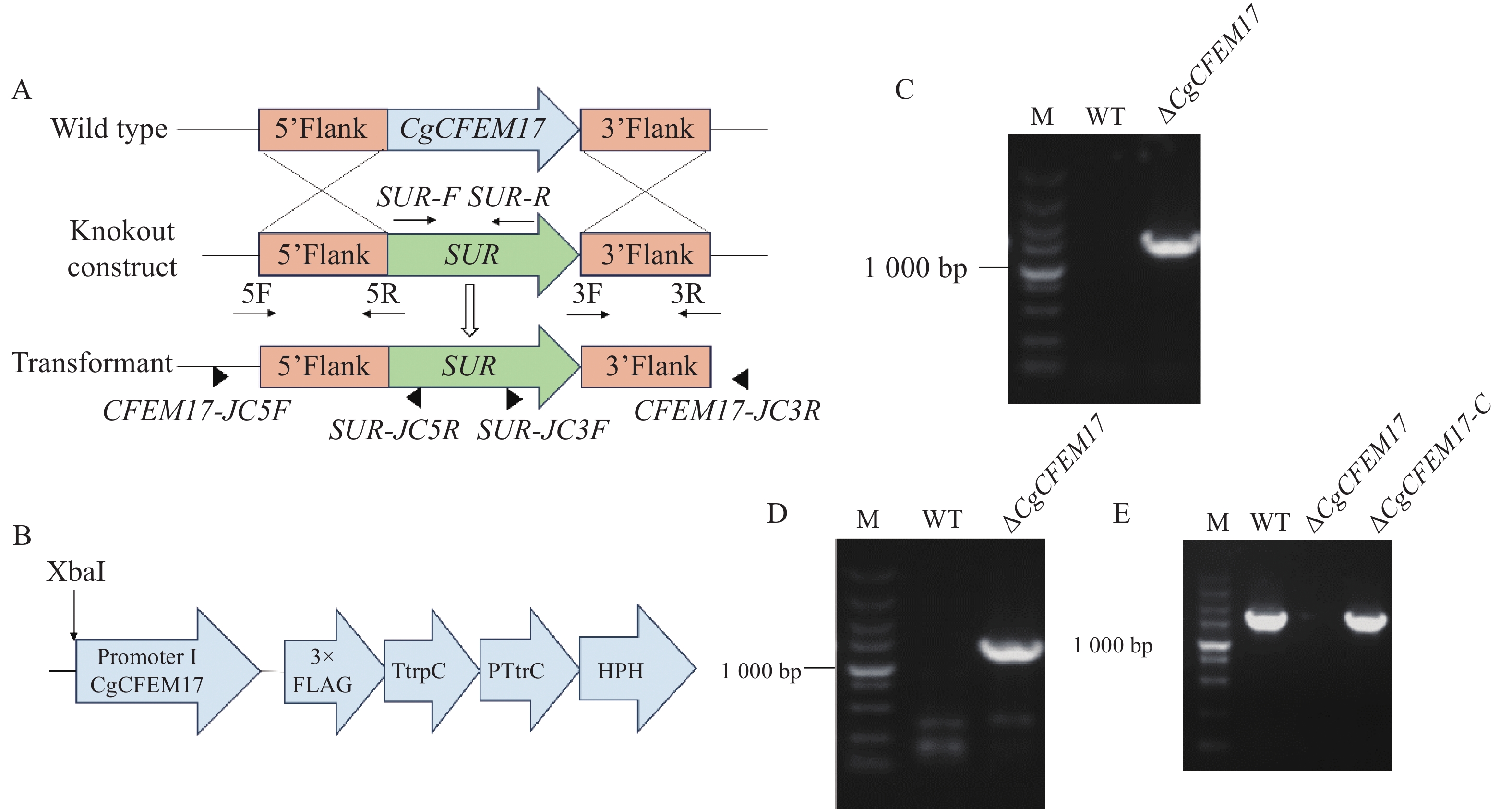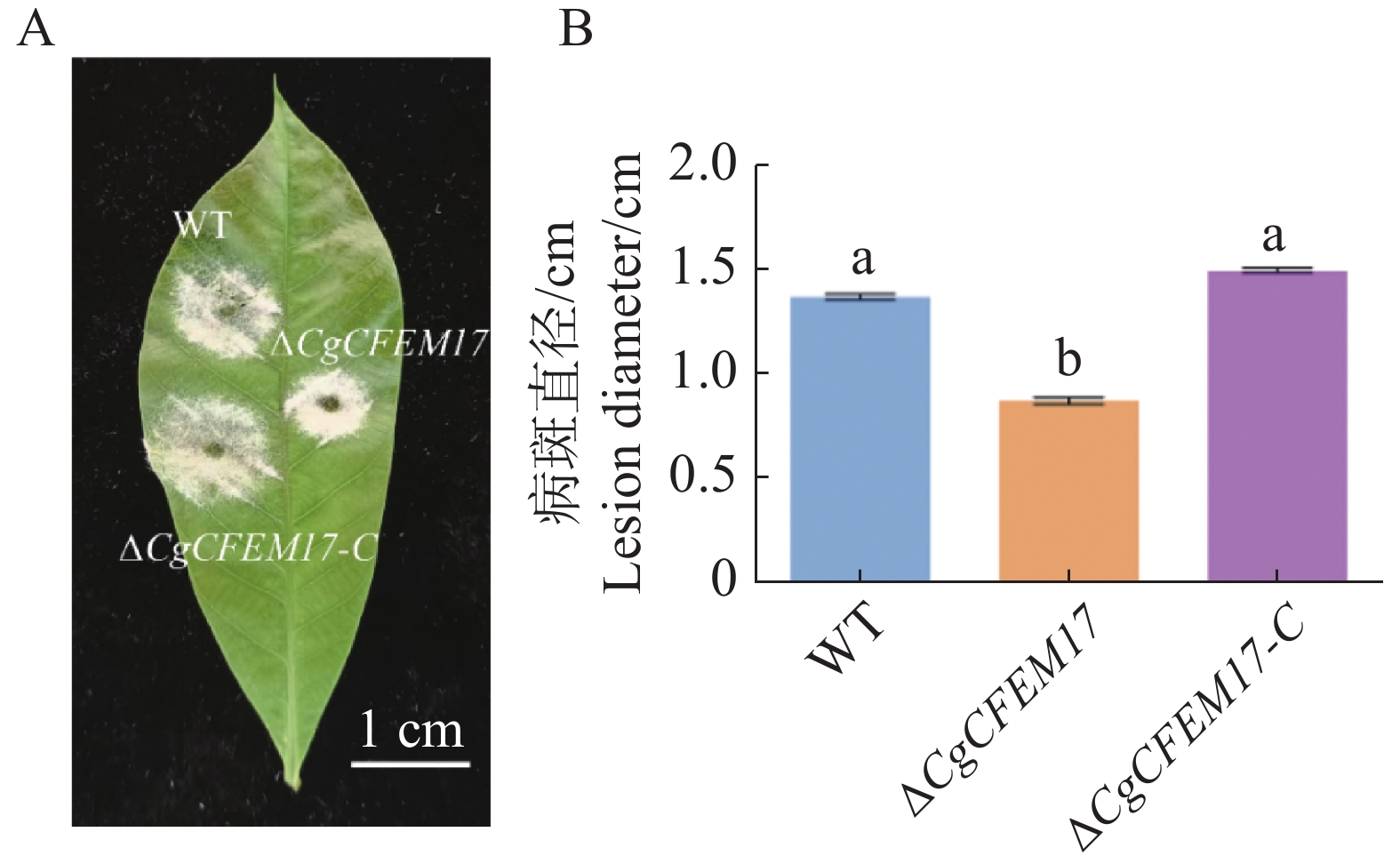 Colletotrichum gloeosporioides is the main pathogen causing anthracnose of rubber tree (Hevea brasiliensis). The common in fungal extracellular membrane (CFEM) domain is a unique motif of fungi, and the proteins containing CFEM and transmembrane domains are defined as Pth11-like CFEM protein, which plays important roles in regulating the development and pathogenicity of pathogenic fungi. In order to study the pathogenesis of C. gloeosporiorides, a gene encoding Pth11-like CFEM protein was screened from the transcriptome of C. gloeospriorides and named as CgCFEM17. The encoding region of the gene CgCFEM17 is 1341bp in length and encodes a peptide with 446 amino acids. Bioinformatics analysis showed that the N-terminus of CgCFEM17 has a signal peptide with 26 amino acids and a conserved CFEM domain, and the C-terminus contained six transmembrane domains. The knockout mutant strain (∆CgCFEM17) and complementary strain (∆CgCFEM17-C) of the gene CgCFEM17 were constructed to analyze the function of CgCFEM17. The results showed that the conidium germination and invasion structure of ∆CgCFEM17 were delayed compared with the wild type and complementary strain, but the colony growth rate, conidiation, appressorium formation rate, and morphogenesis were not changed. These results indicated that the gene CgCFEM17 could affect the pathogenicity of C. gloeosporioides on rubber tree by regulating the germination process of conidia and delaying the formation of infection structure, which lays a theoretical foundation for exploring of the pathogenic mechanism of C. gloeosporioides and establishing of a new control strategy for anthracnose of rubber trees.