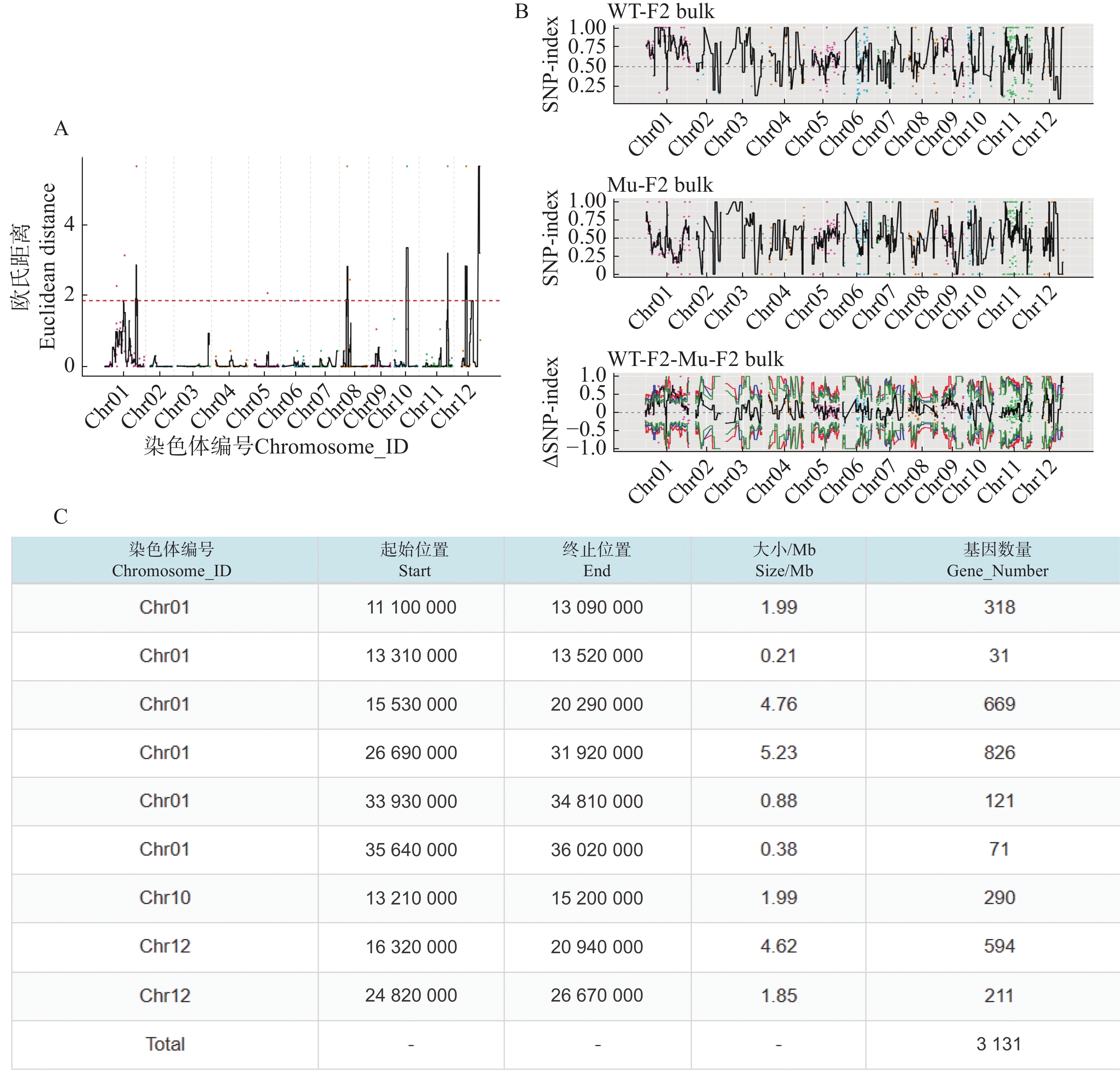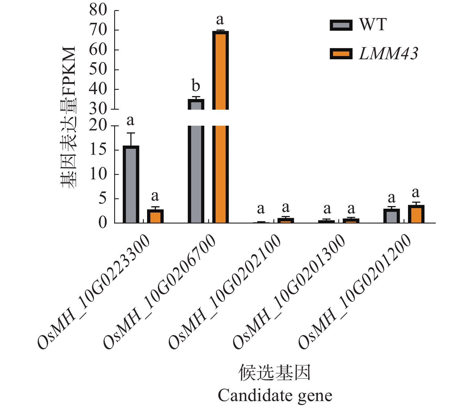 Lesion mimic mutants (LMM) are important in plant immunity and growth and development studies. The aim of this study was to perform a preliminary localization of a rice lesion mimic gene by BSA-seq (Bulked Segregant Analysis sequencing) technique. First, we screened a mutant, LMM43, from the population of indica rice cultivar Huang Huazhan (HHZ) mutagenized by EMS for the appearance of lesion-like symptoms, and phenotyped the F2 segregant population obtained by crossing LMM43 with the wild-type parent to determine the mode of inheritance of the lesion-like trait. High-throughput sequencing was performed on mixed samples of DNA from individuals with disease-like spot phenotypes and normal individuals using BSA-seq technology. Through the association analysis of Single Nucleotide Polymorphism (SNP) and Insertion and Deletion (InDel) differences combined with phenotypic analysis, the target genes were preliminarily localized in a segment of rice chromosome 10, which is about 1.37 Mb in length and contains 199 genes. The length of this interval is about 1.37 Mb, which contains 199 genes, and five candidate genes were finally identified. The preliminary localization results laid the foundation for further gene cloning and functional verification, and helped to deeply understand the molecular mechanism of rice-like spot mutants, which is of great theoretical and applied value for the study of rice disease resistance breeding and plant immunity mechanism.