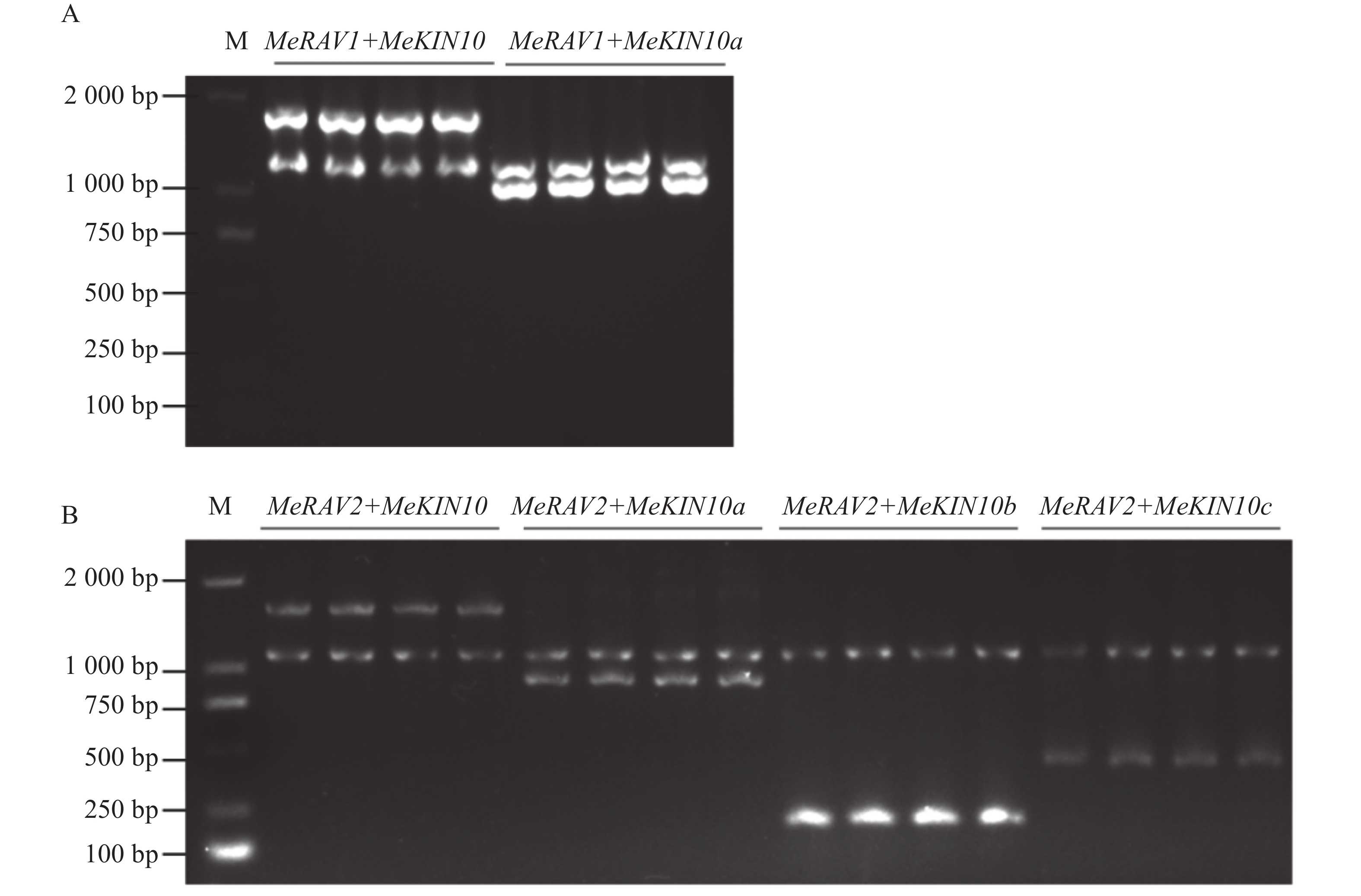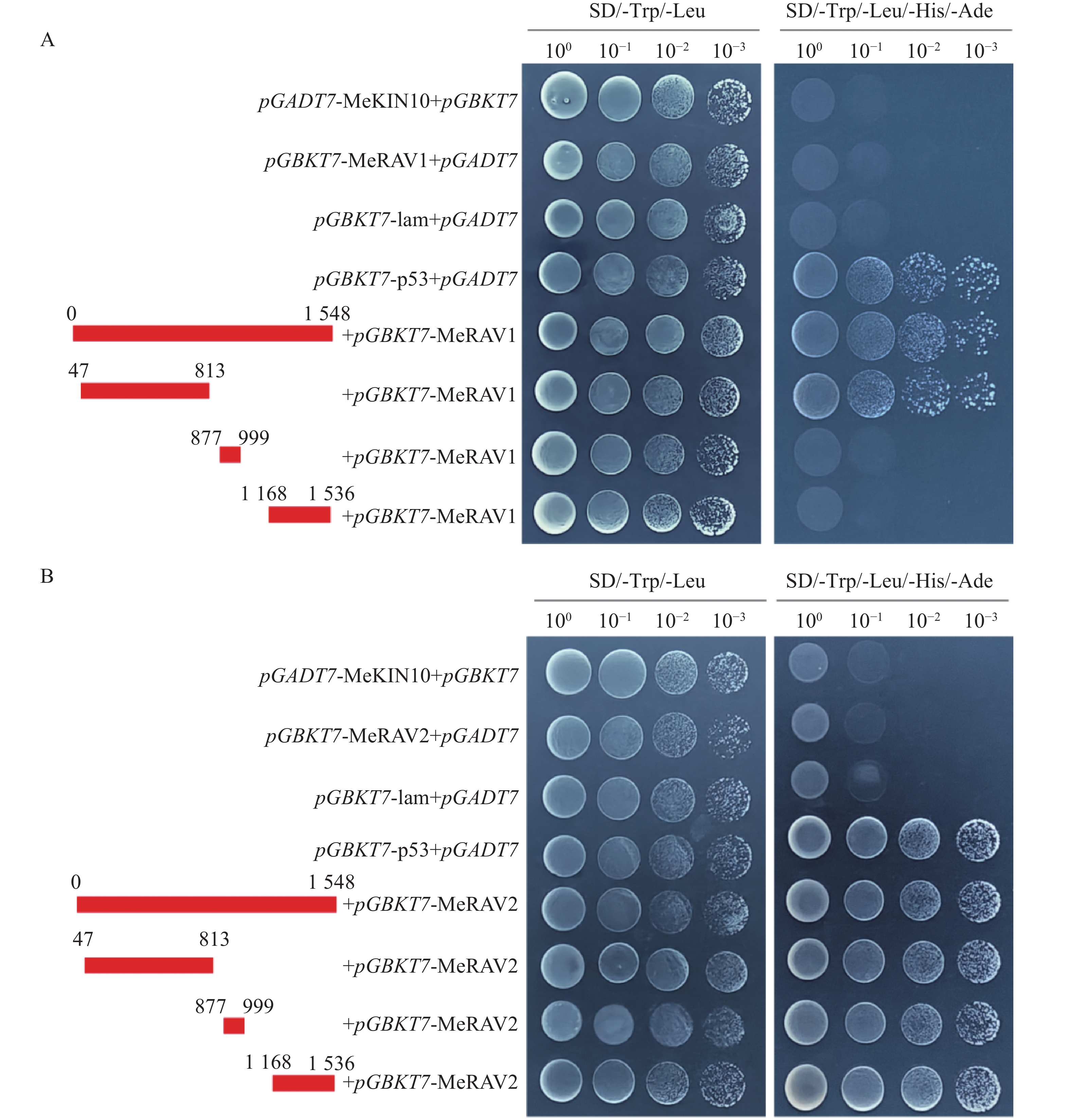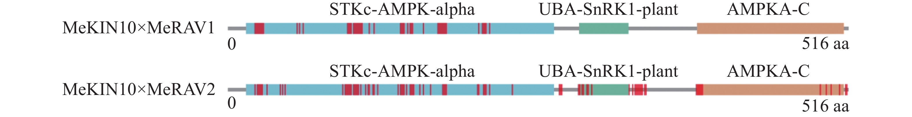 Cassava (Manihot esculenta), a crucial staple and bioenergy crop, faces significant yield and quality losses due to oxidative stress induced by environmental factors such as drought and high temperature. Previous studies have demonstrated that MeKIN10, a protein kinase associated with energy sensing in cassava, enhances oxidative stress tolerance by mediating the phosphorylation of MeRAV1/2. While protein-protein interaction is essential for kinase-mediated phosphorylation, the specific interaction regions between MeKIN10 and MeRAV1/2 remain elusive. In this context the interaction regions of MeKIN10 and MeRAV1/2 were identified through protein domain analysis, AlphaFold3 prediction and yeast two-hybrid experiment. The results demonstrate that the STKc-AMPK-alpha kinase domain of MeKIN10 is the key domain in its interaction with MeRAV1/2, which further indicates that the protein interaction between MeKIN10 and MeRAV1/2 is the key in mediating the phosphorylation of MeRAV1/2.