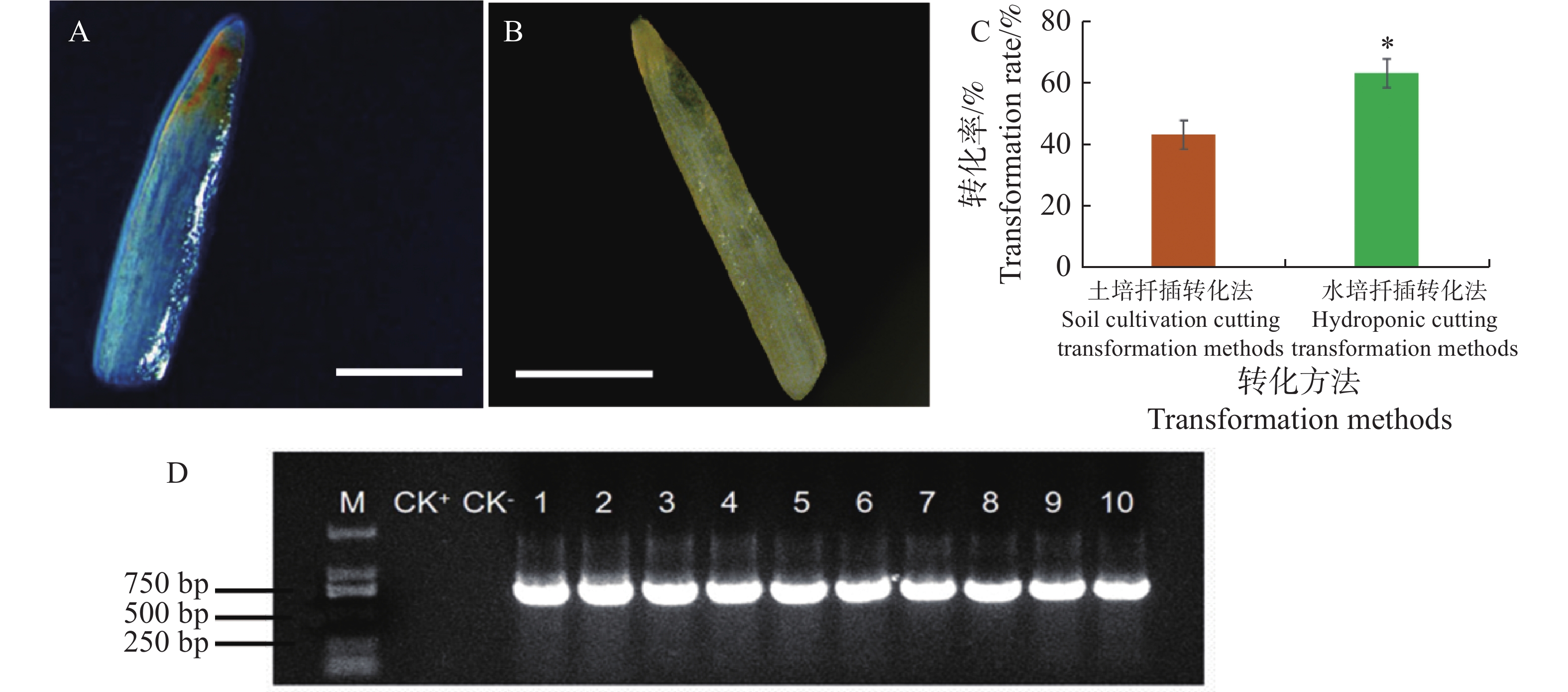 Hydrocera triflora is an important aquatic plant that is in an endangered state. Its poor drought resistance is the main factor leading to its endangerment. An attempt was made to build a genetic transformation system for and to improve its traits via this transformation system. H. triflora Agrobacterium rhizogenes-mediated transformation system was successfully established and optimized for the first time. The results show that the transformation rate of hydroponic cutting transformation method was significantly higher than that of soil cultivation cutting transformation method. Agrobacterium rhizogenes K599 strain had the highest transformation rate. The cuttings with apical buds as infection explants had a higher transformation rate than those without apical buds. The transformation rate of the optimized H. triflora transformation system reached 63.3%. Meanwhile, pGreen-35s:MeTPS6-EGFP that overexpresses trehalose-6-phosphate synthase MeTPS6 was constructed by Nimble Cloning technology. The transgenic composite H. triflora were obtained. After 3 days of treatment with 3% PEG-6000 solution, it was found that the transgenic plants grew normally, while the control leaves showed wilting. The trehalose content in the hairy roots of transgenic plants was significantly higher than that of the control. These results indicate that overexpressing MeTPS6 in transgenic composite H. triflora significantly improves their drought stress tolerance.