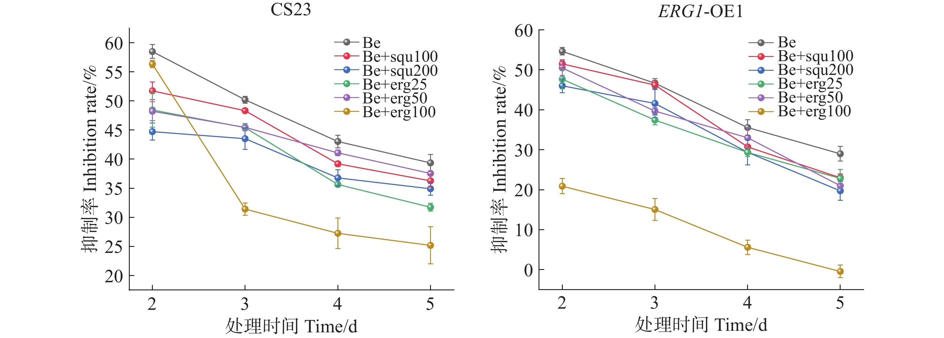 Amidine fungicides, with their diverse chemical structures and broad targets, have become a key area in pesticide development. However, the differences in toxicity among various amidine fungicides against the same pathogen have not been fully elucidated, limiting their optimization and widespread application. Among them, benzovindiflupyr, as a novel succinate dehydrogenase inhibitor (SDHI), showed significant inhibitory effects against Colletotrichum spp, especially by significantly disrupting the cell membrane integrity demonstrating a mechanism different from that of traditional SDHI fungicides. The aim of the present study was to further investigate the molecular mechanism of benzovindiflupyr and to reveal its multiple inhibitory pathways against C. siamense. The transcriptome KEGG enrichment analysis revealed that benzovindiflupyr, significantly inhibited the steroid synthesis pathway in C. siamense. Fluorescence quantitative PCR further verified that the expression of key genes in the ergosterol synthesis pathway, such as ERG1 and cyp51a, was significantly decreased. Gas chromatography-tandem mass spectrometry (GC-MS/MS) analysis showed that squalene and ergosterol contents of C. siamense were significantly decreased and lanosterol content was increased by benzovindiflupyr treatment. After constructing five ergosterol synthesis gene overexpression strains, including ERG1, it was found that ERG1 overexpression strains were significantly less susceptible to benzovindiflupyr, and the other overexpression strains were consistent with the drug sensitivity of wild-type CS23 strain. In addition, exogenous addition of squalene and ergosterol significantly reduced the inhibitory effect of benzoflumizole, especially at the addition of 100 μg·mL−1 ergosterol, the inhibitory effect of benzovindiflupyr was reduced to 25.18% against CS23 strain, while no inhibitory effect was observed against ERG1-OE1 strain. In summary, benzovindiflupyr may inhibit ergosterol synthesis by suppressing the expression of the ERG1 gene, thereby disrupting the cell membrane of C. siamense, and ultimately inhibiting mycelial growth. This study provides preliminary insights into the molecular mechanism of benzovindiflupyr against anthracnose fungi and offers theoretical support for the development of novel amide fungicides.